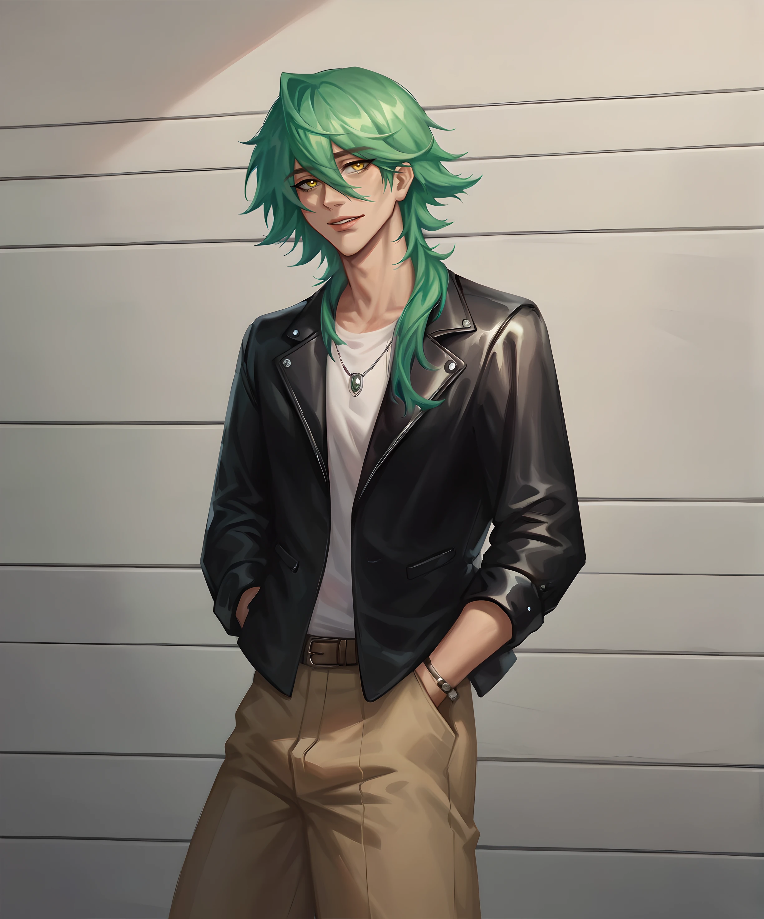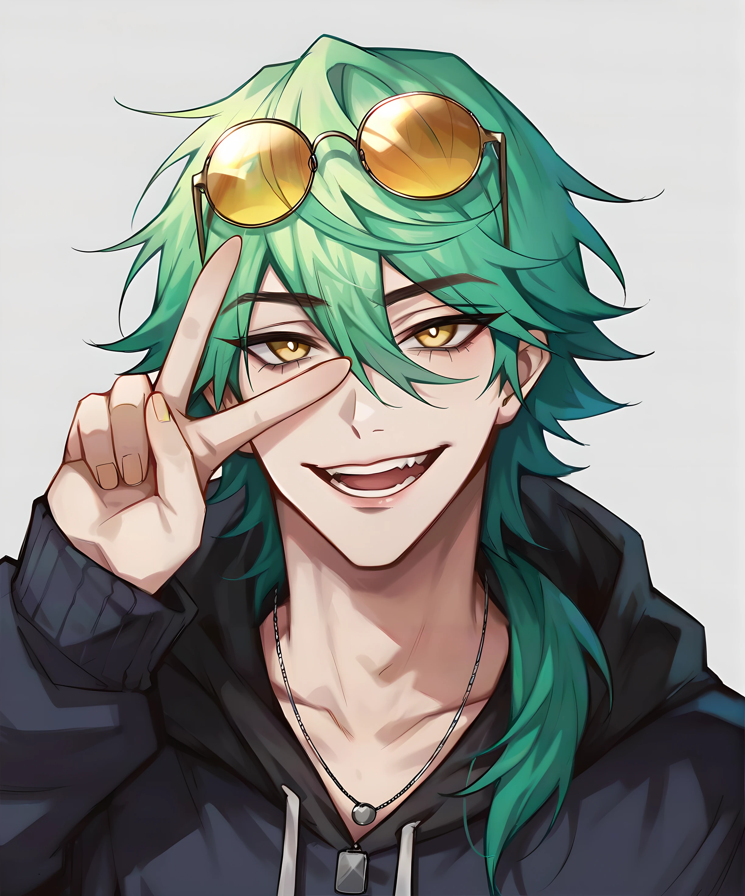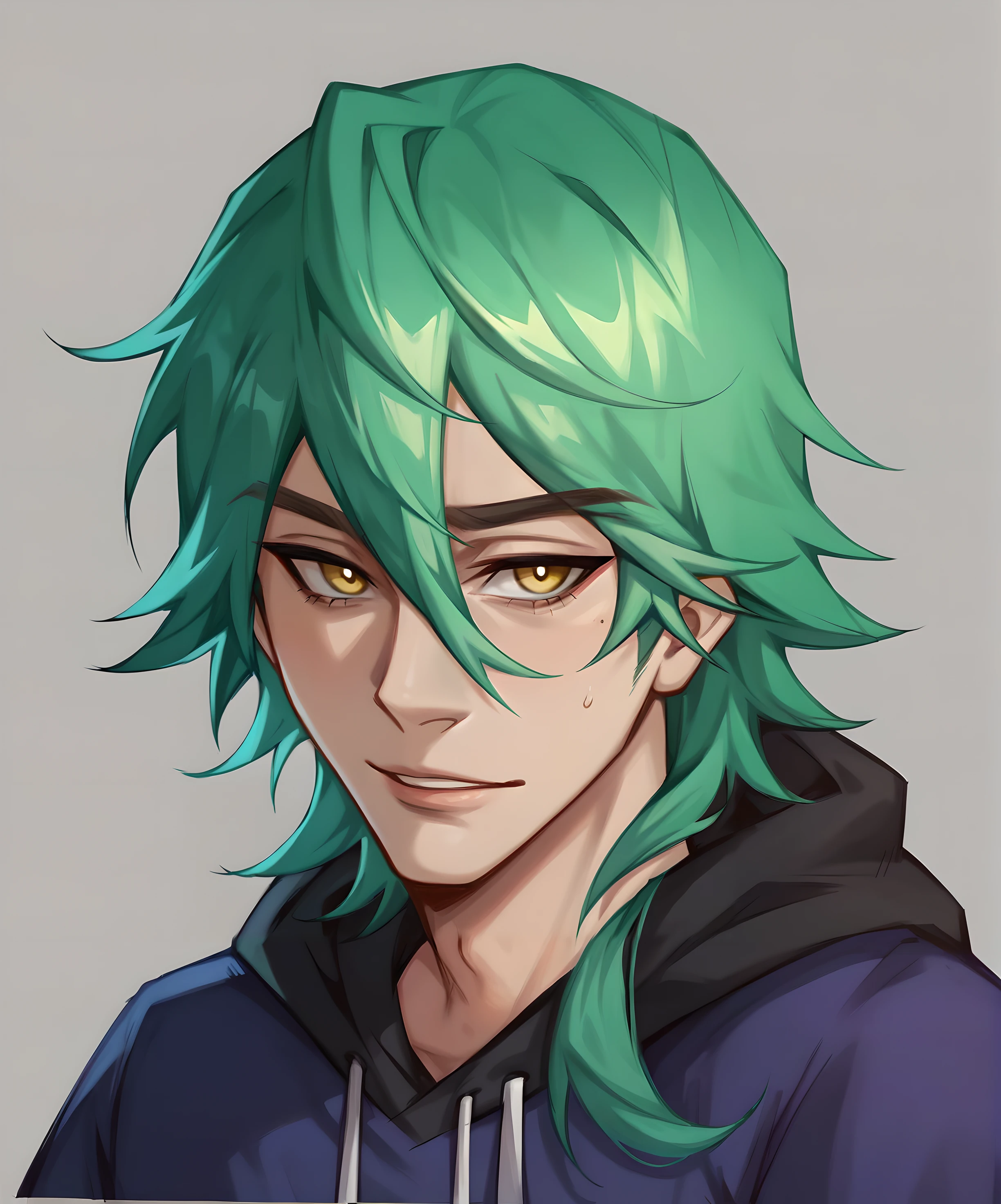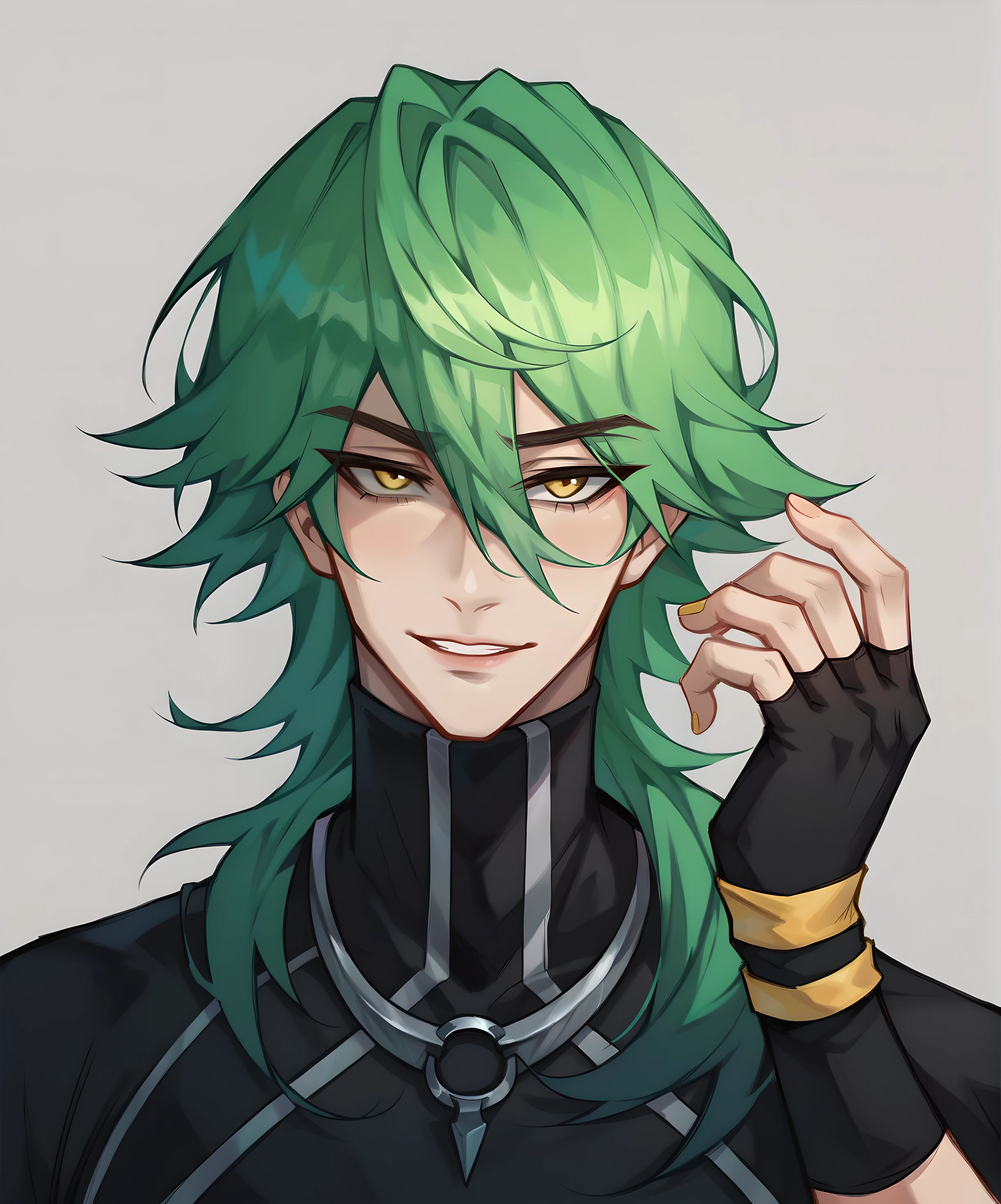 1boy, ezr3al hs, male focus, green hair, long hair, yellow eyes, solo, bangs, hair between eyesClothes: