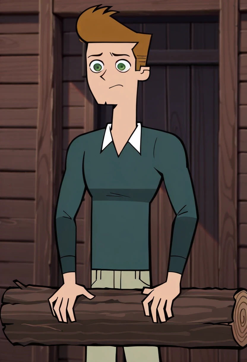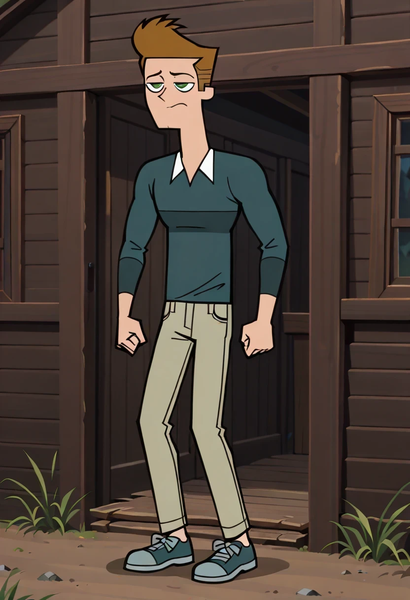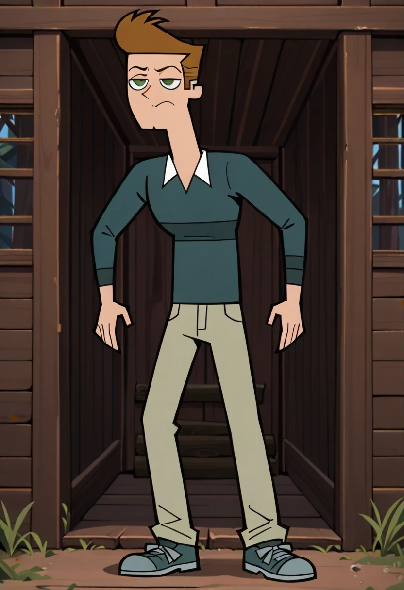TopherTDPI, 1boy, brown hair, dark turquoise long-sleeve shirt, white collared undershirt, beige pants, dark turquoise shoes with white accents, dark green eyes