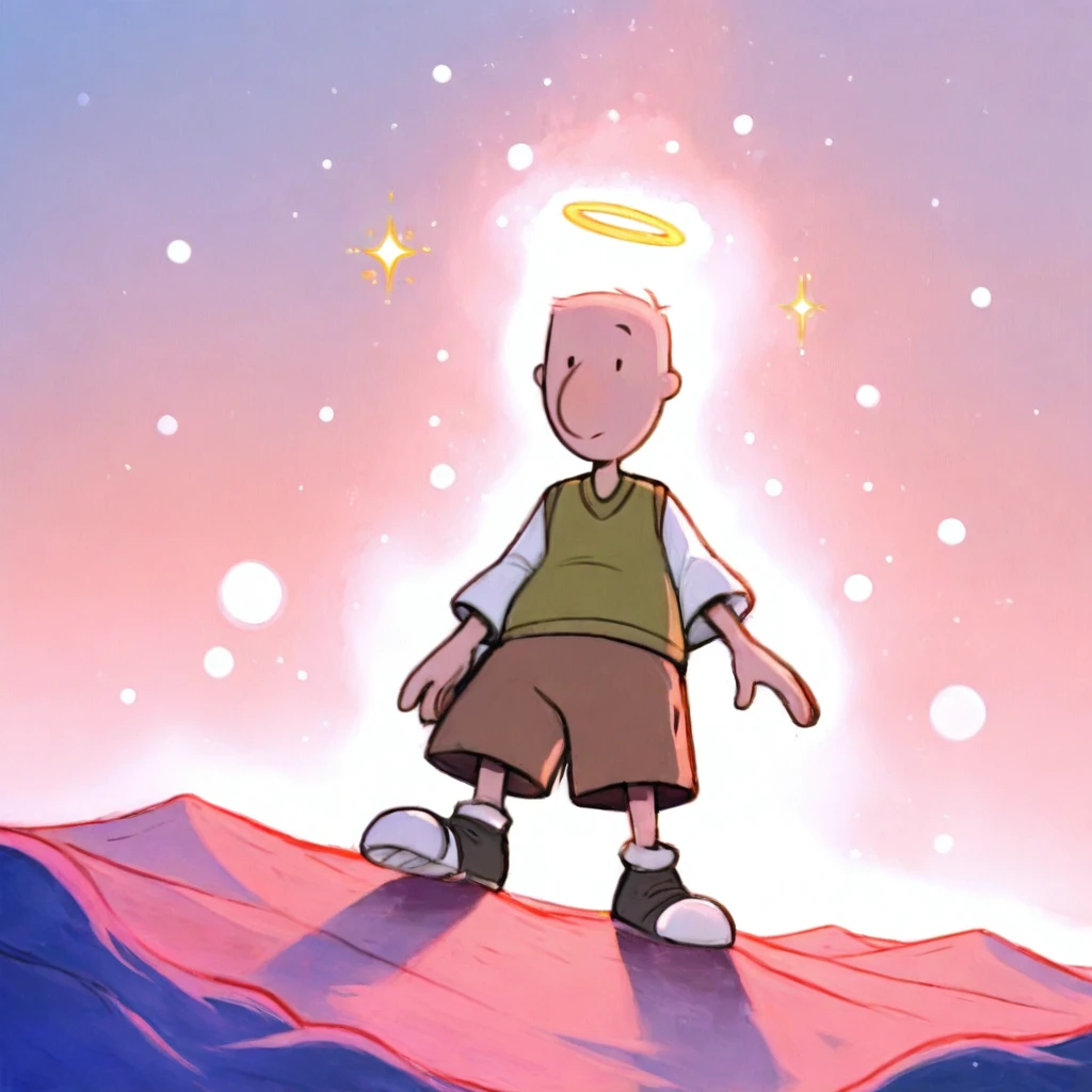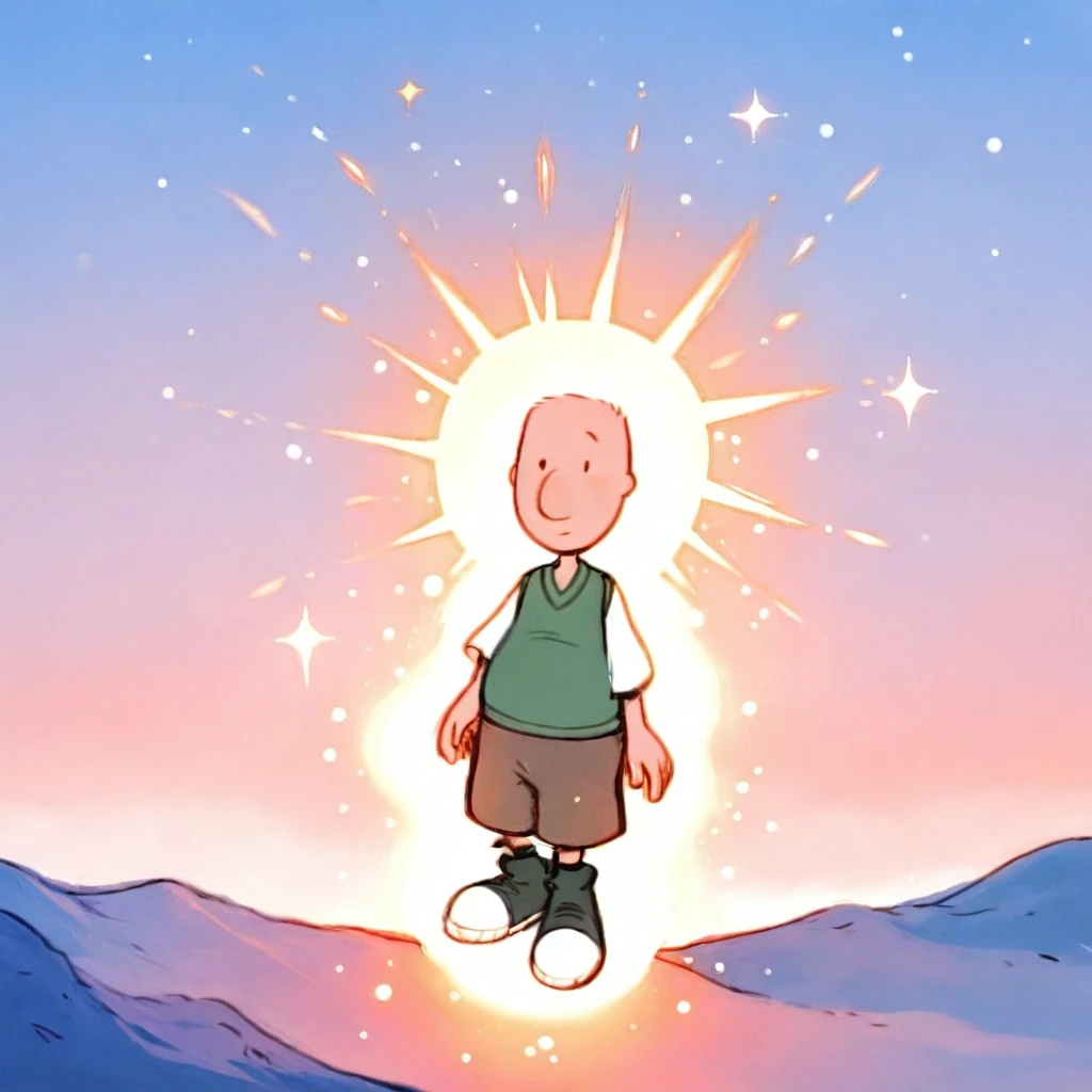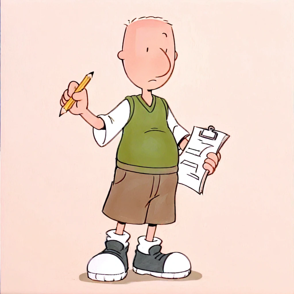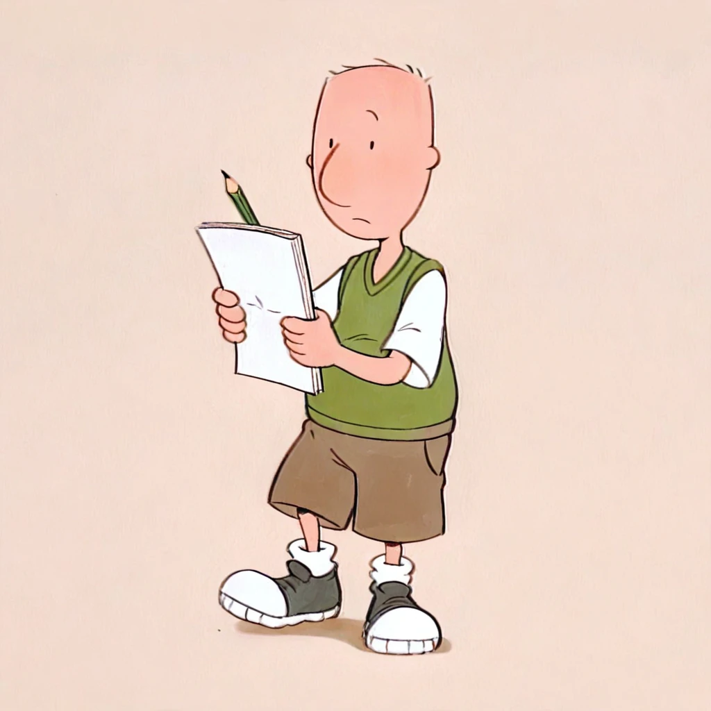 dgjklfnn_il, light skin, 1boy, shirt, bald, green vest, white shirt, brown shorts, shoes, simple eyes