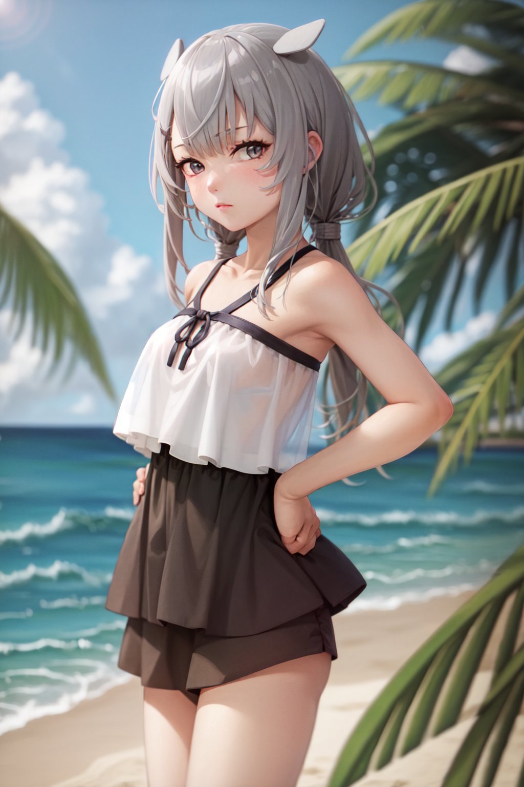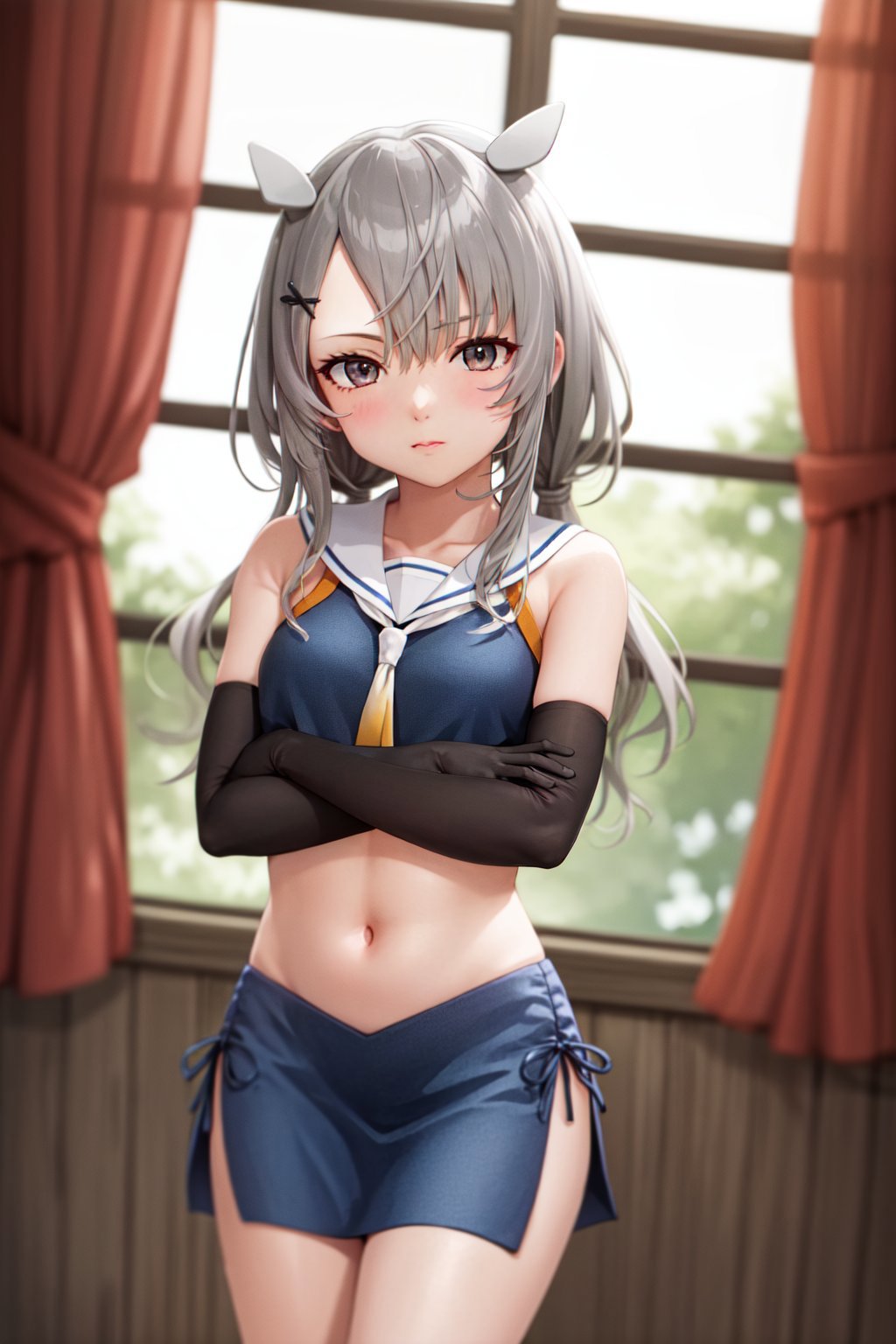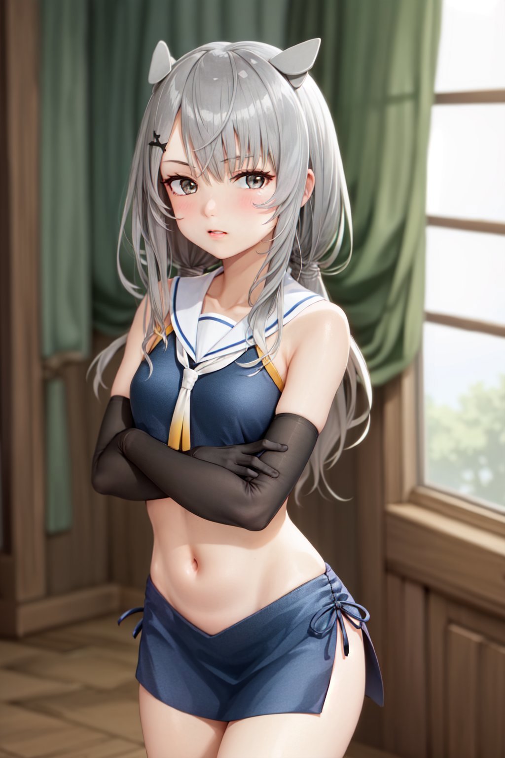 Default Outfit: crop top, white sailor collar, white neckerchief, blue skirt, elbow gloves