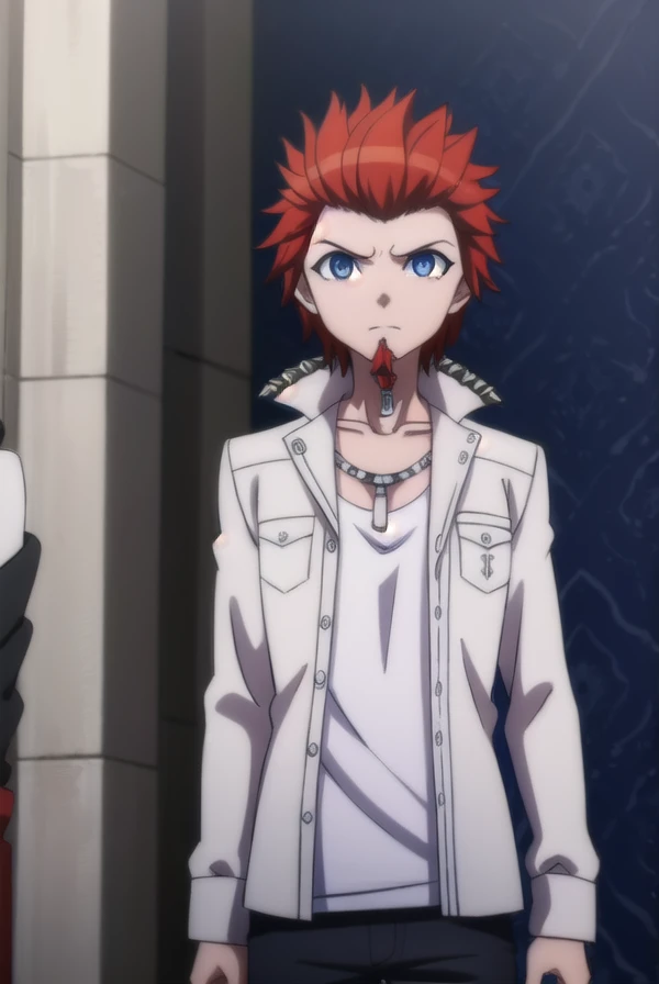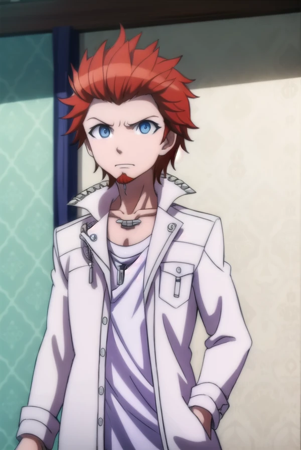 leon kuwata, short hair, blue eyes, male focus, red hair, facial hair, spiked hair, goatee,