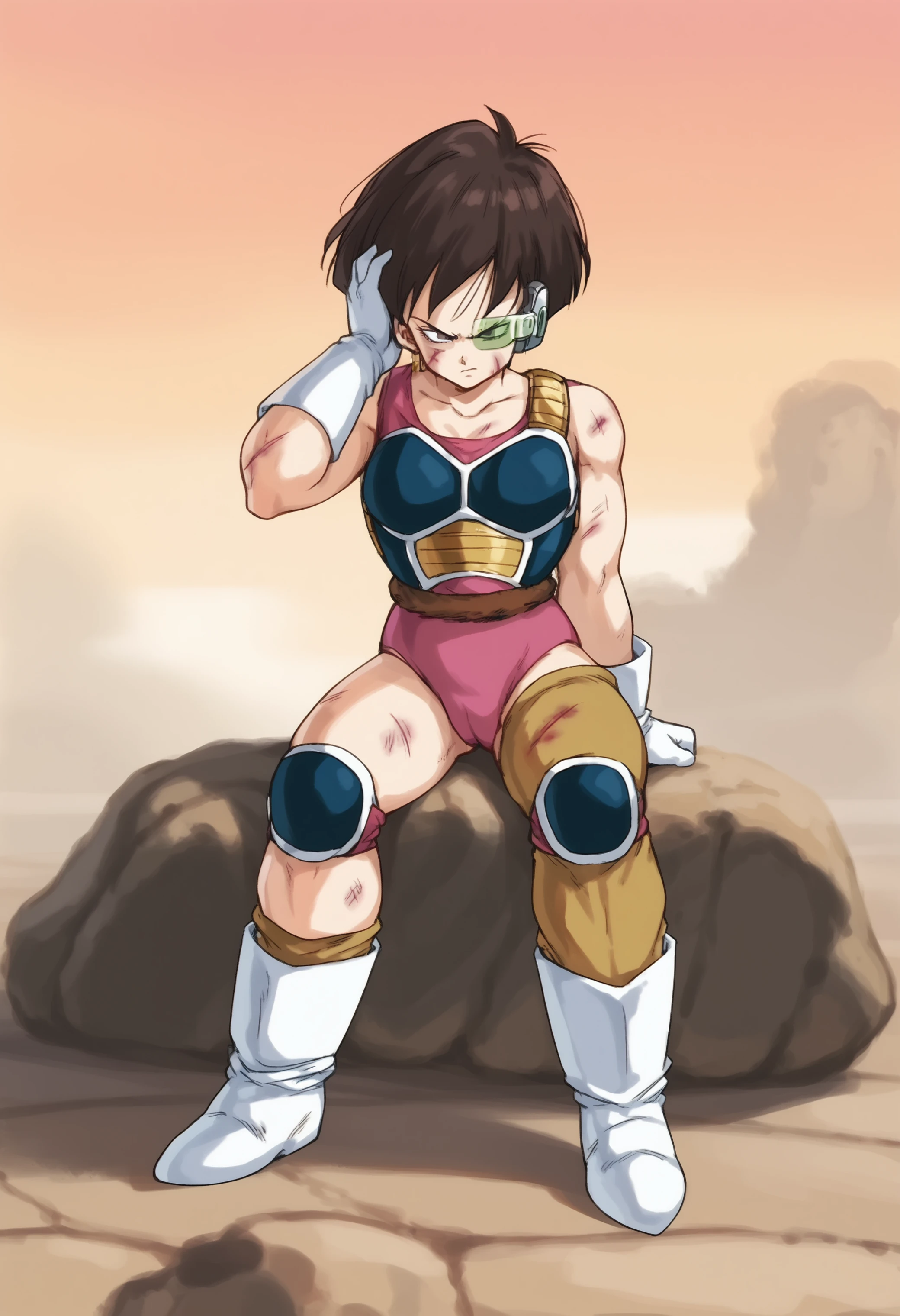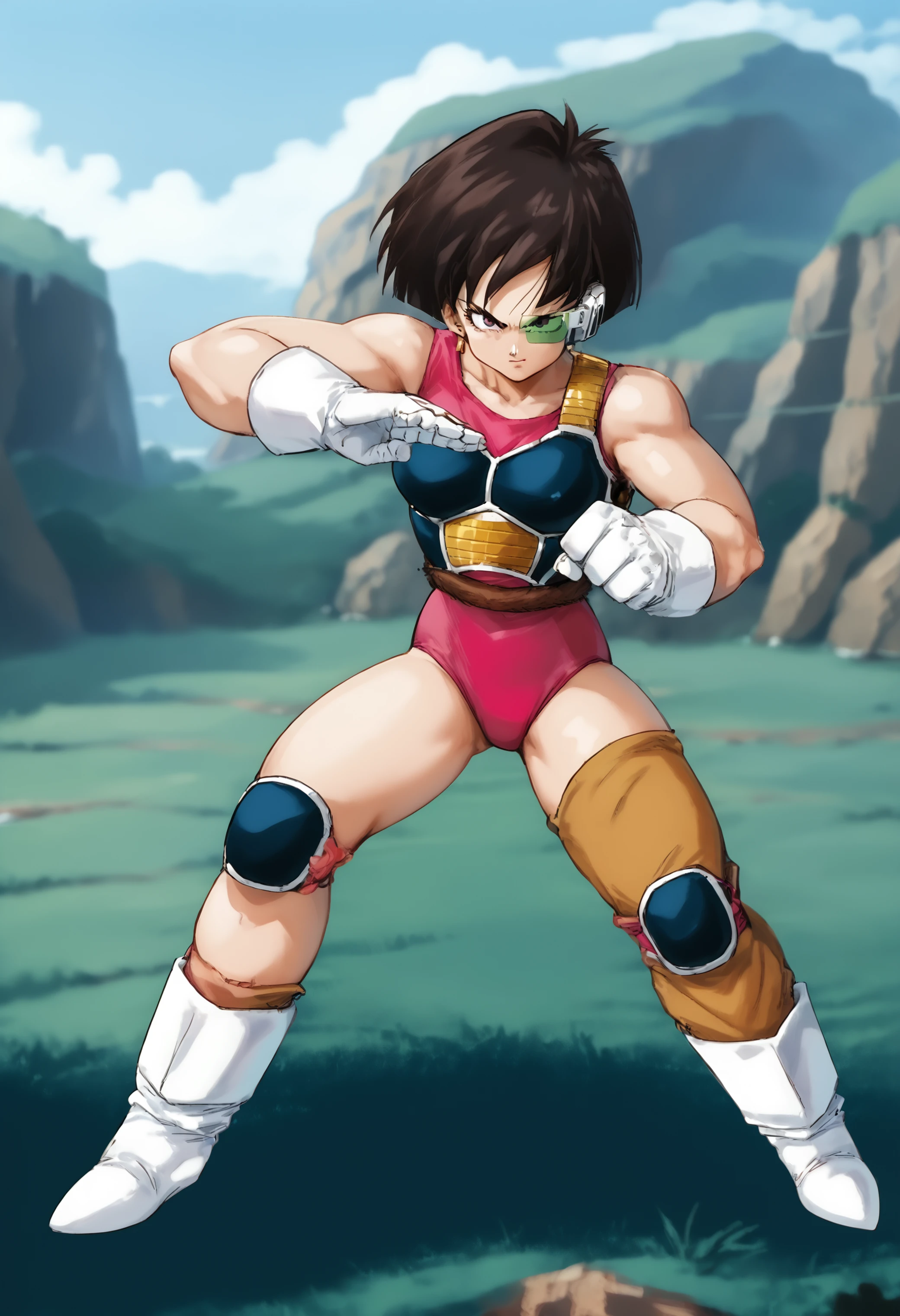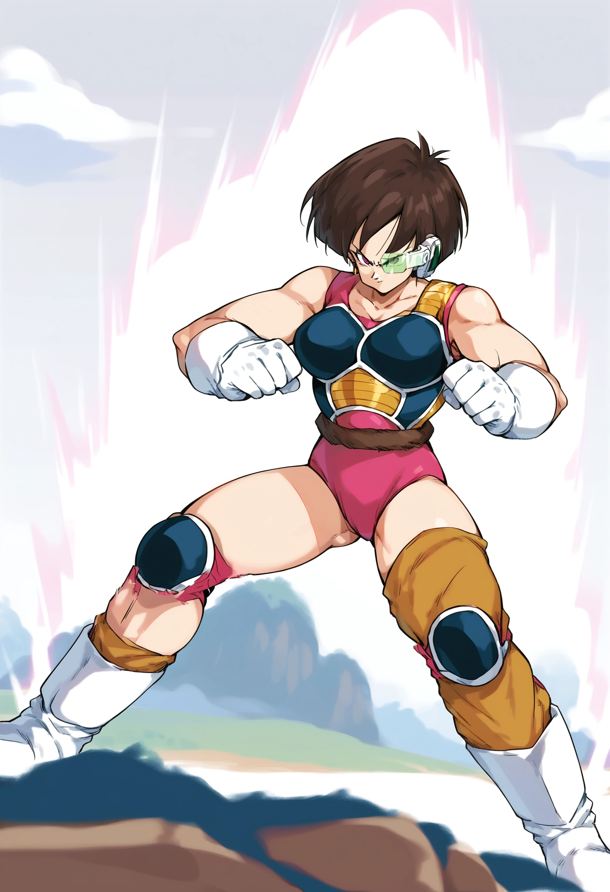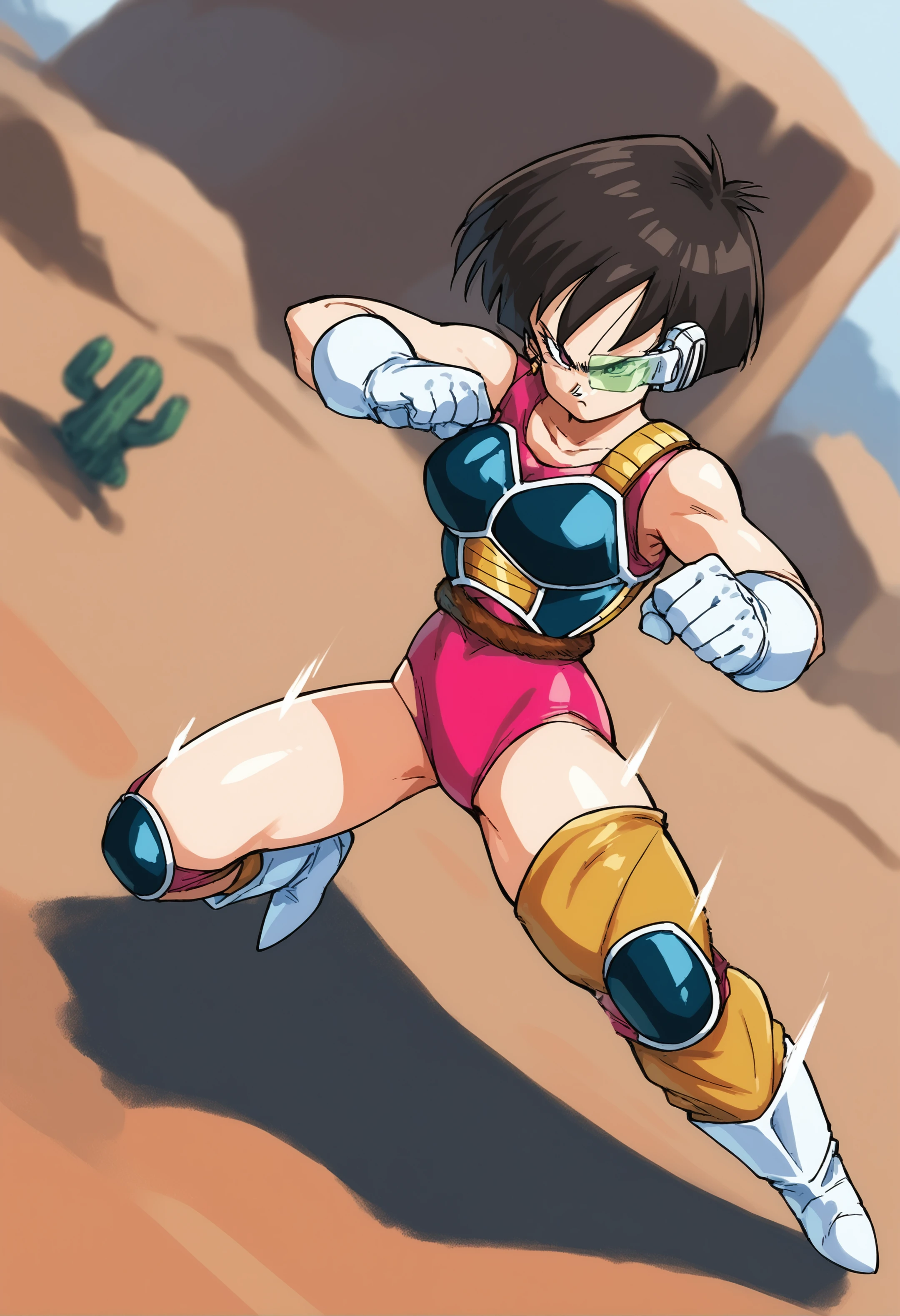 <lora:Fasha:1.0> fasha, 1girl, saiyan armor, gloves, boots, short hair, monkey tail, pink leotard, eyewear, earring