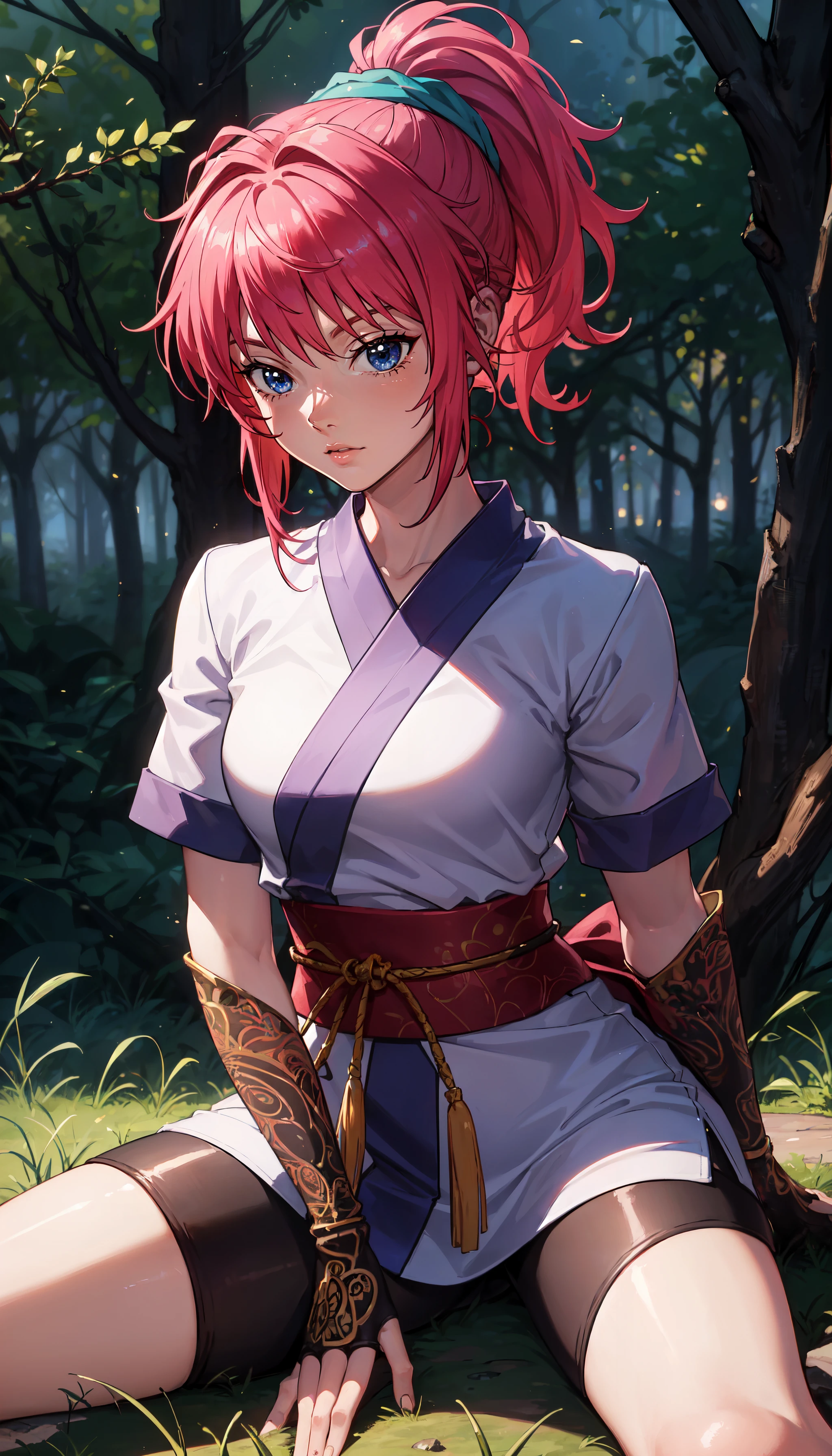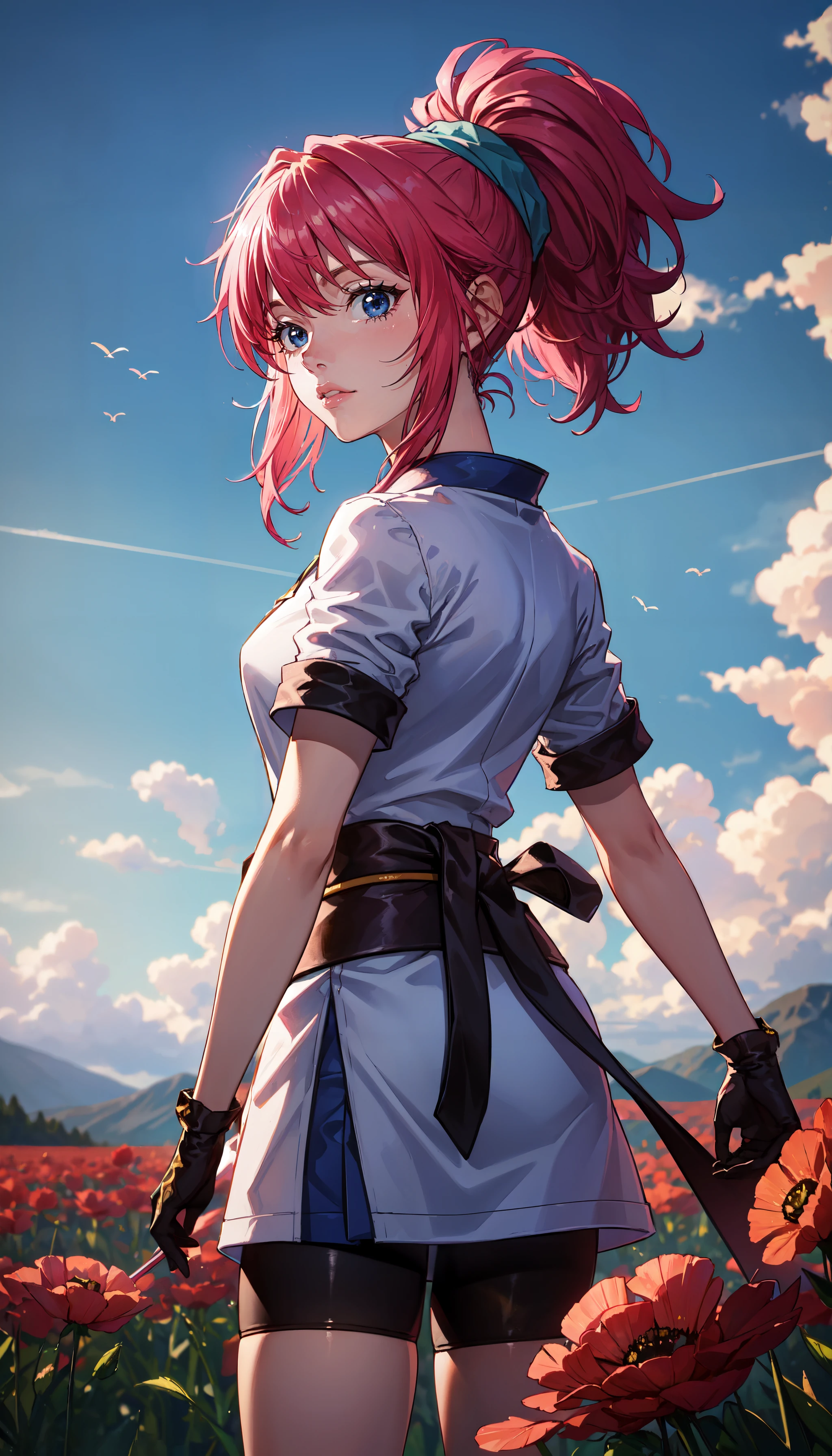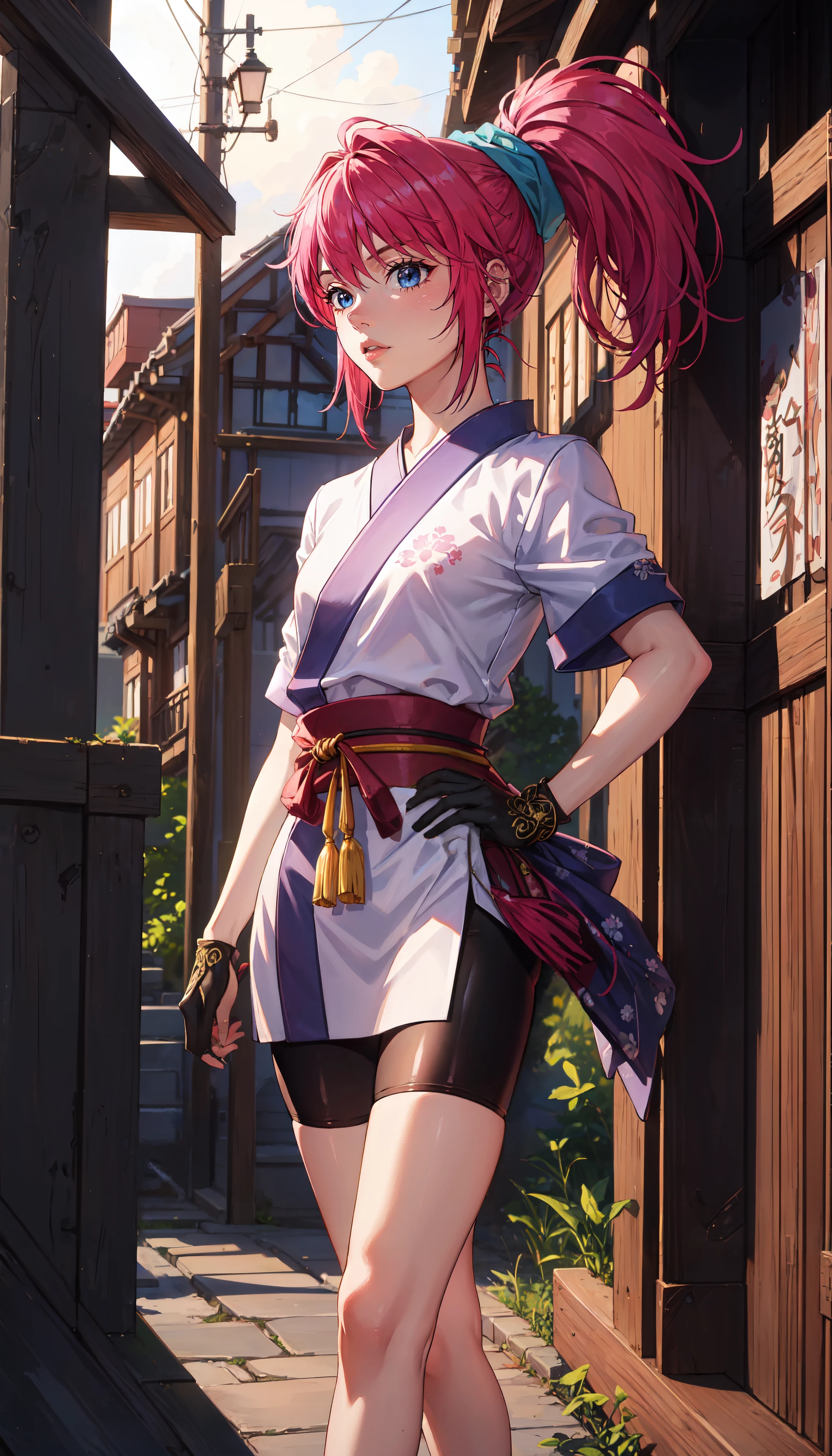 pink hair, ponytail, blue hairband, bangs, blue eyes, japanese clothes, short kimono, fingerless gloves, black bike shortsDescription