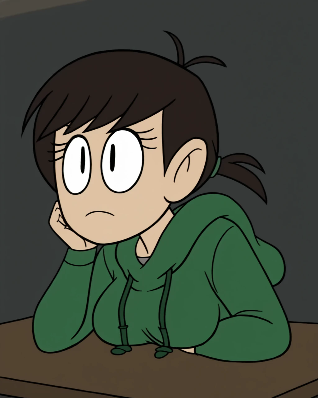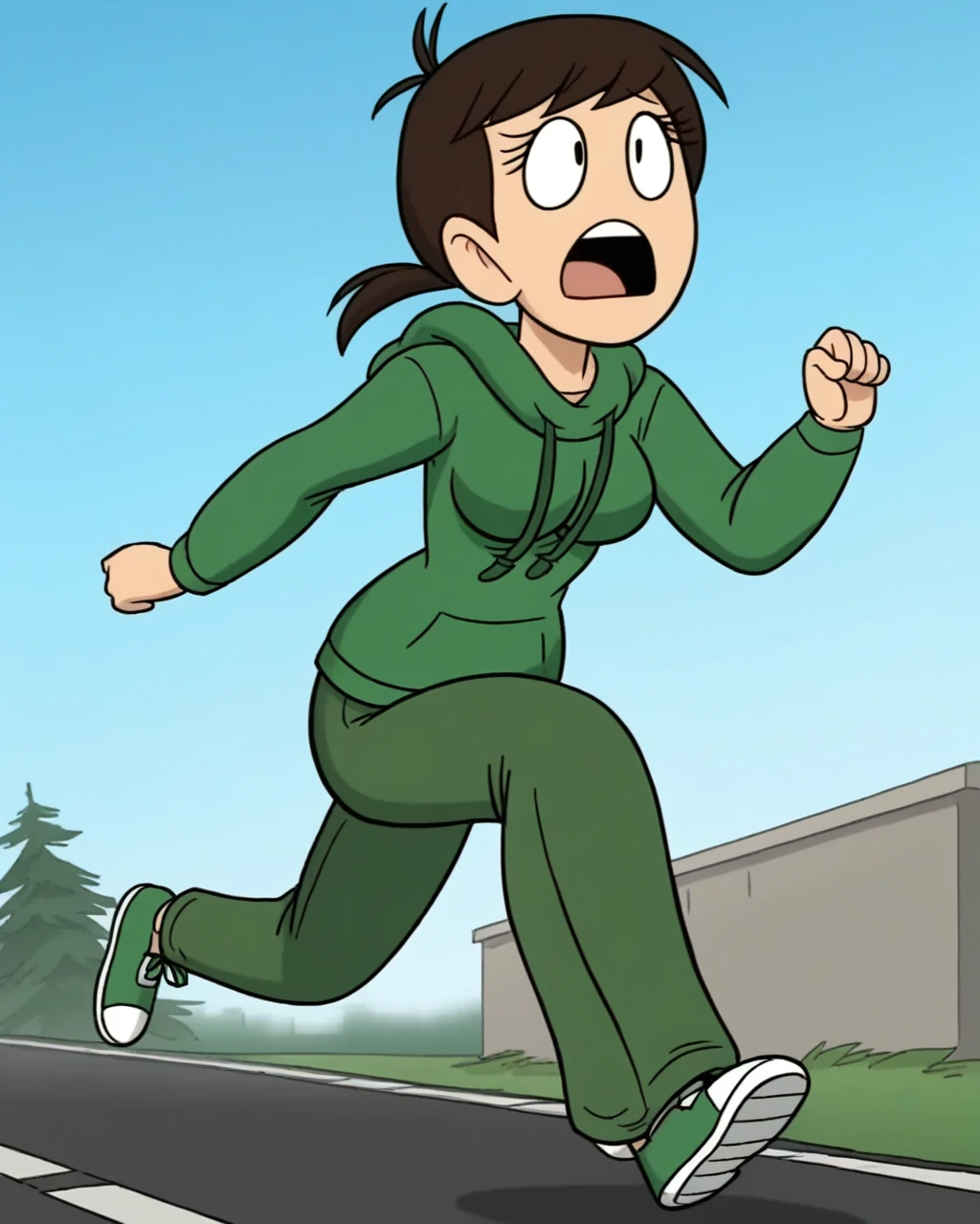 green hoodie, pants, short ponytail, breasts, source_cartoon