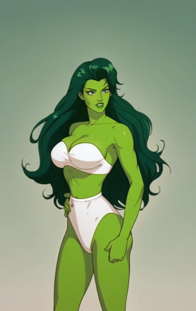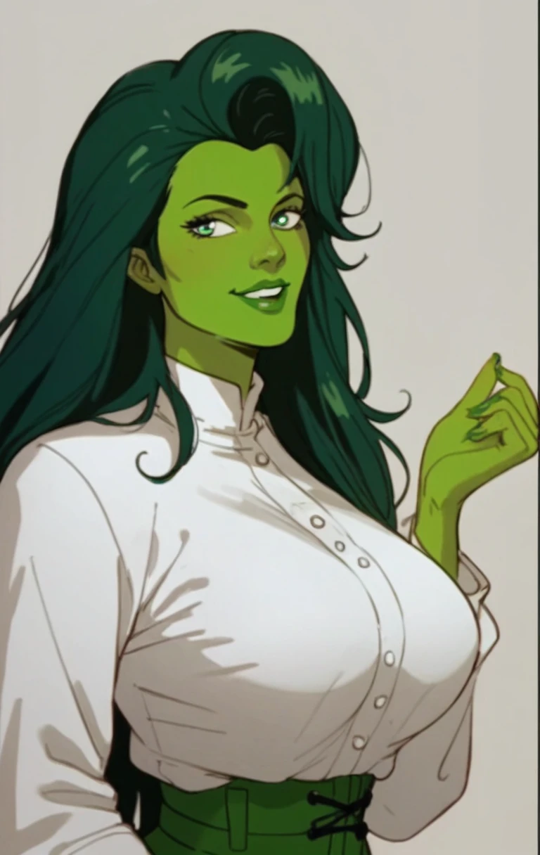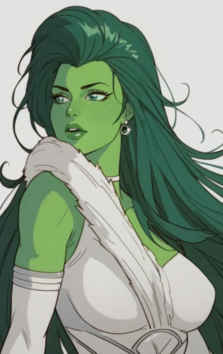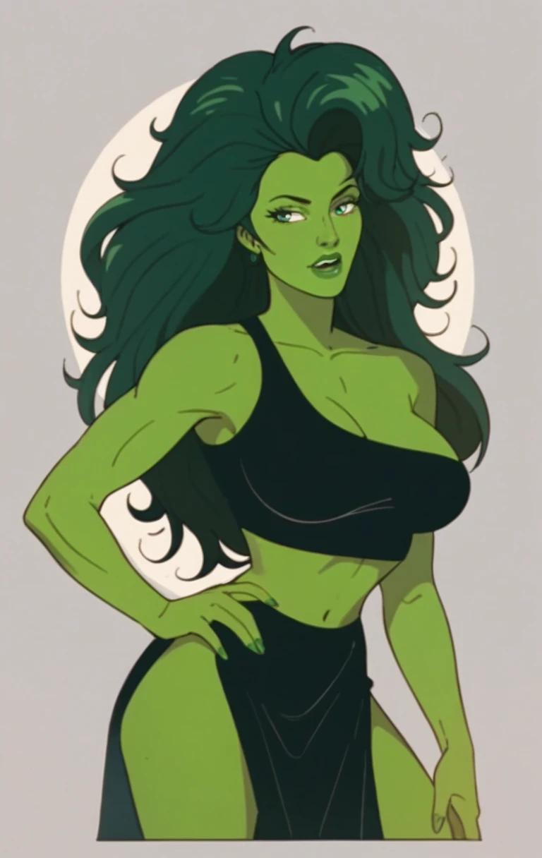 s0h0lk0, 1girl, solo, long hair, green eyes, makeup, parody, lipstick, retro artstyle, green skin, green theme, pillarboxed, green lips