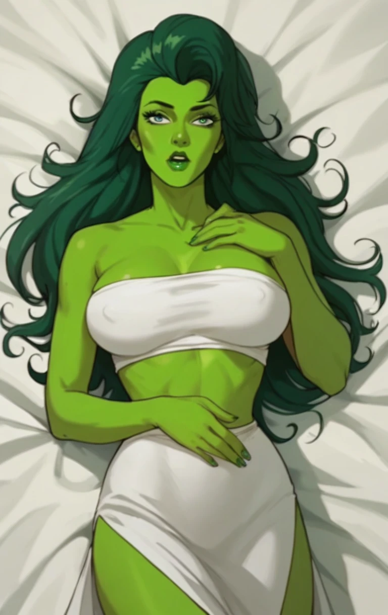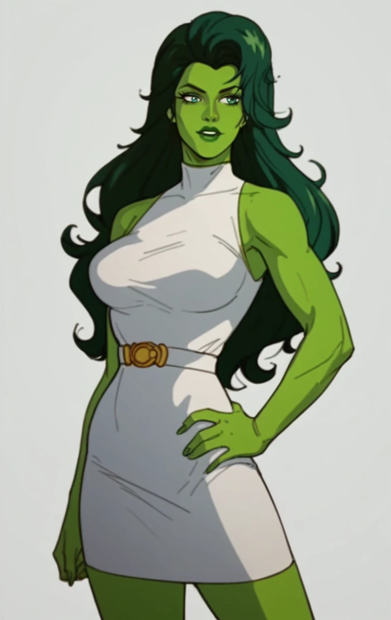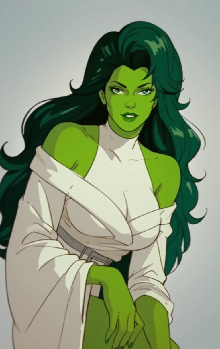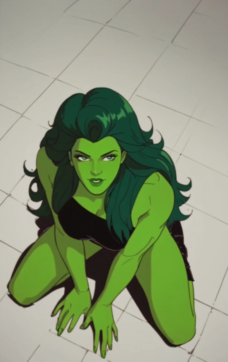 s0h0lk0, 1girl, solo, long hair, green eyes, makeup, parody, lipstick, retro artstyle, green skin, green theme, pillarboxed, green lips