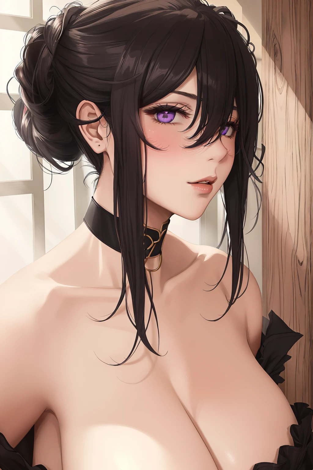 saranowings, purple_eyes, white_pupils, sidelocks, hair_between_eyes, black_hair, black_choker, babydoll, large_breasts