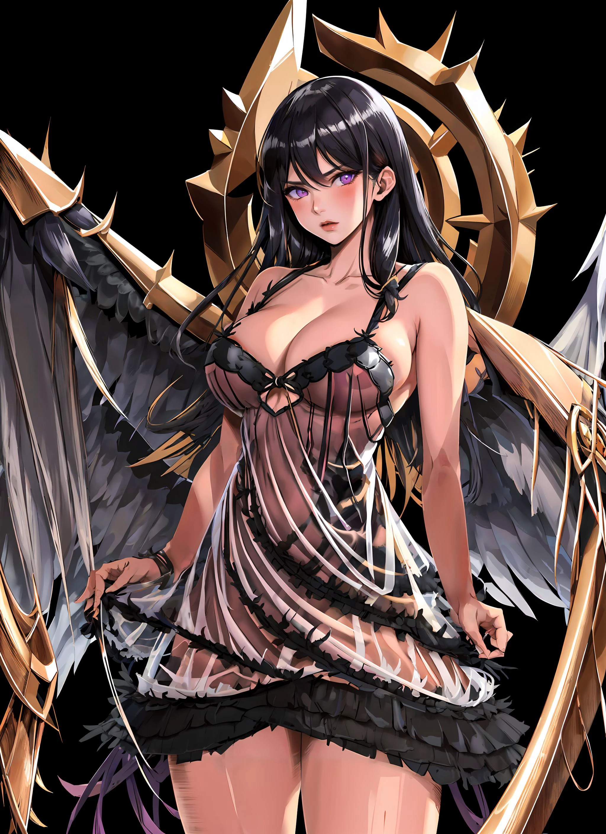saraqael, purple_eyes, white_pupils, black_wings, feathered_wings, sidelocks, hair_between_eyes, black_hair, black_choker, large_breasts