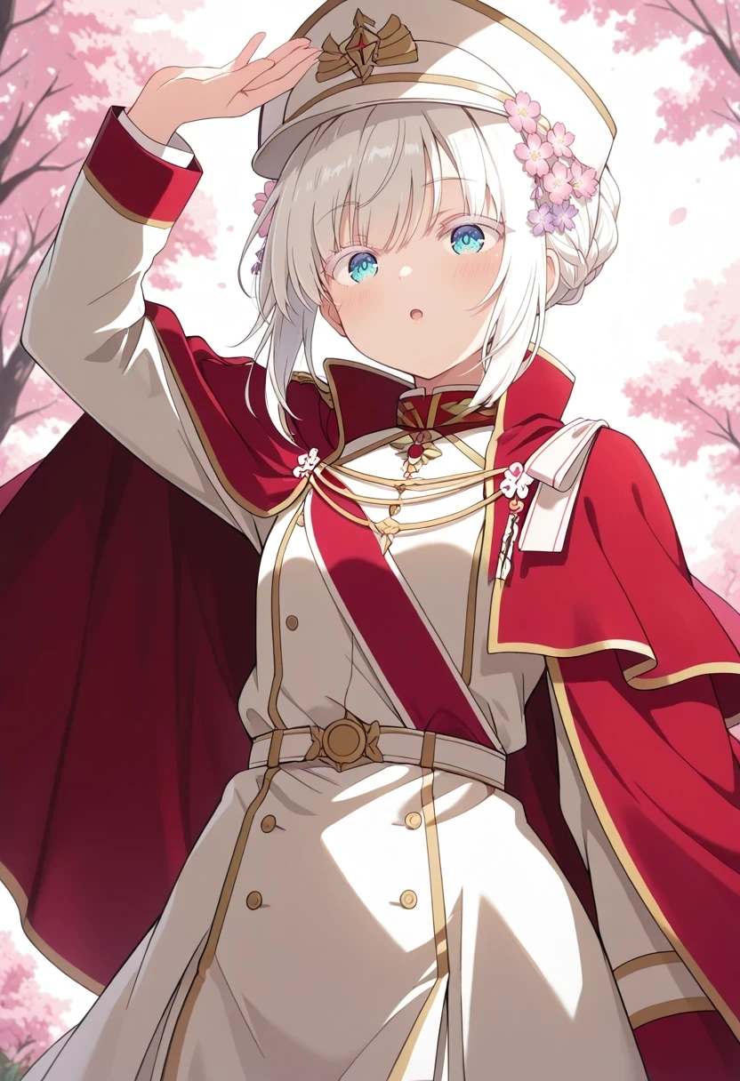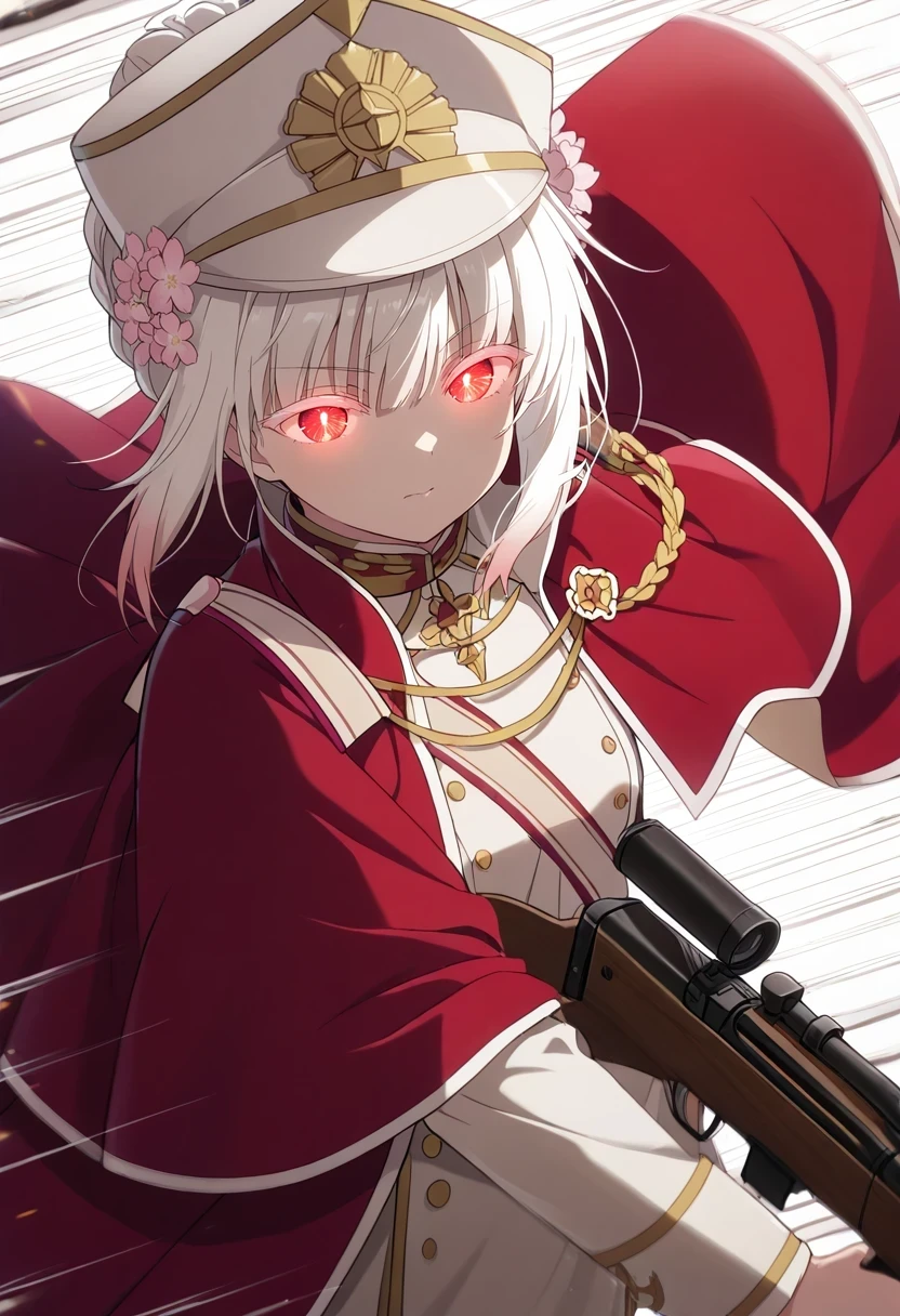 single hair bun,military hat,military uniform,red cape,sash,