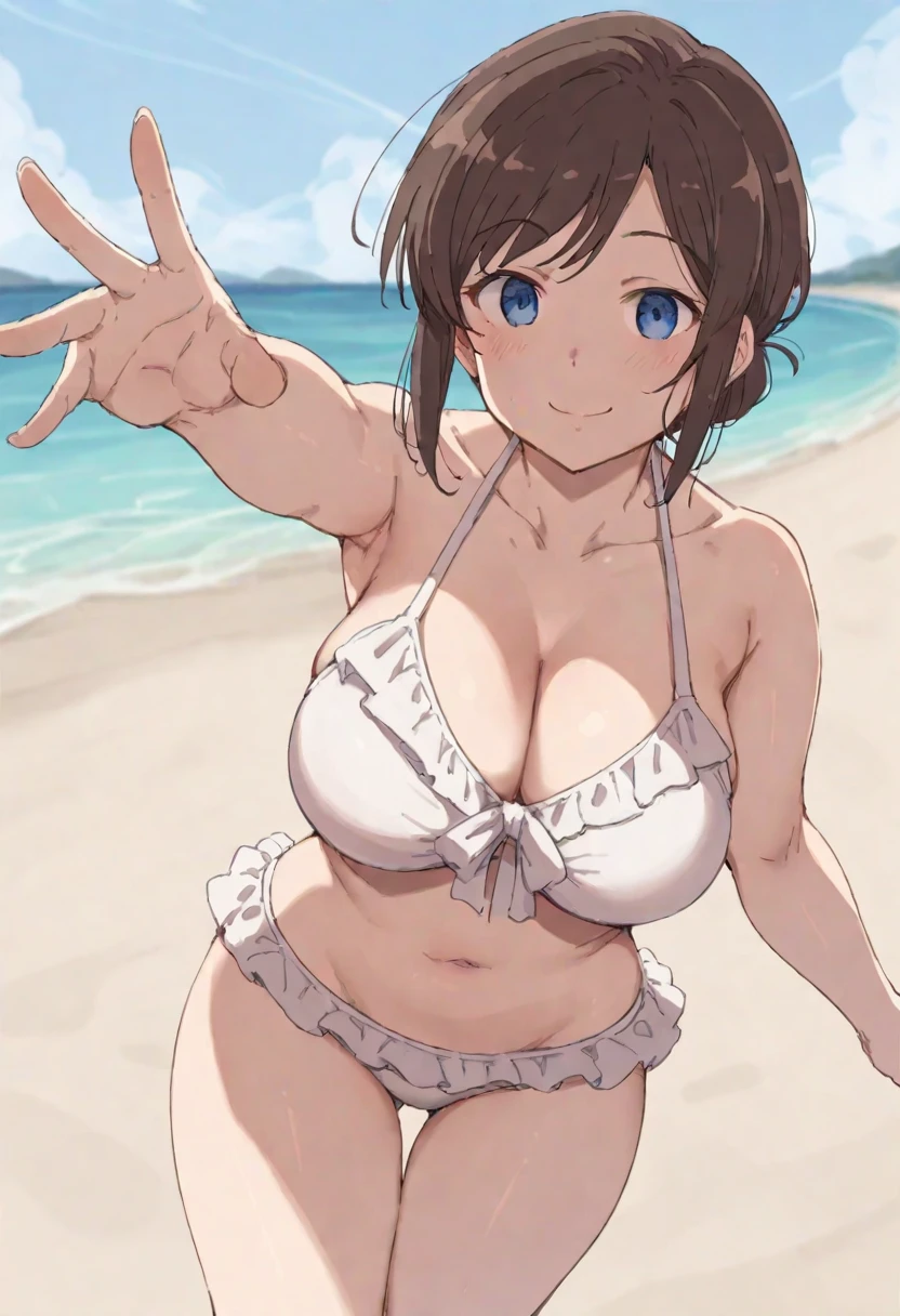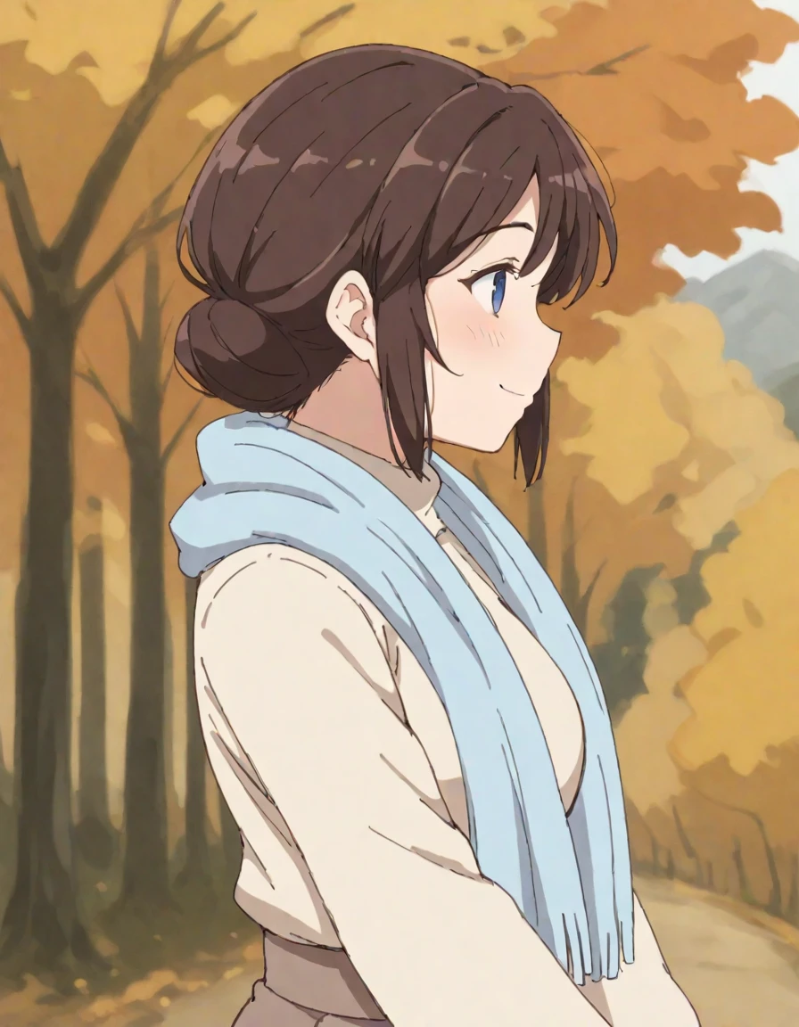 1girl,shirakawa_miho,blue eyes,brown hair,short hair.single hair bun,beige turtleneck sweater,brown pencil skirt