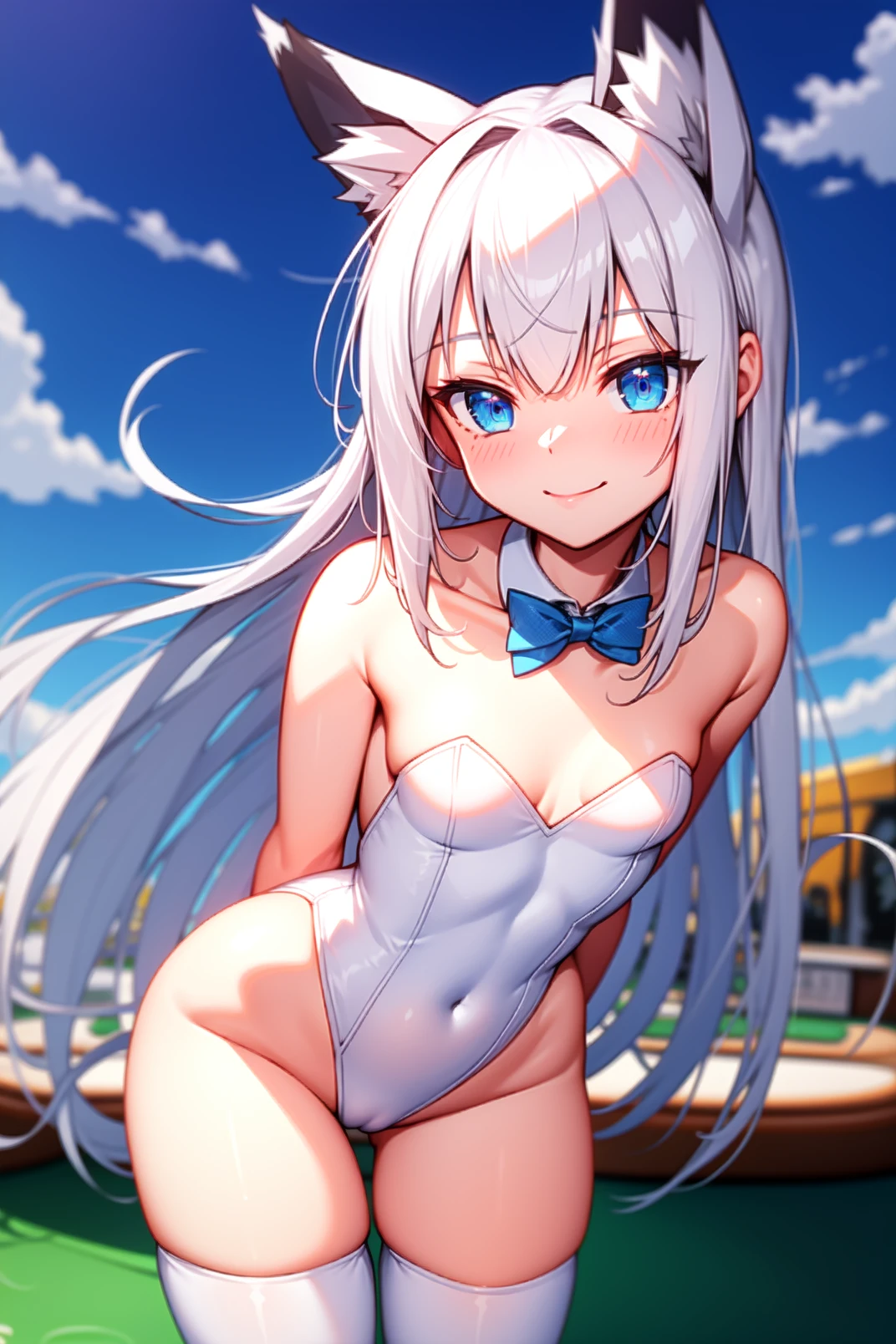 appearance: kawakaze, blue eyes, white hair, very long hair, bangs, sidelocks, fox ears