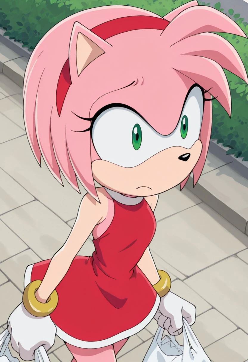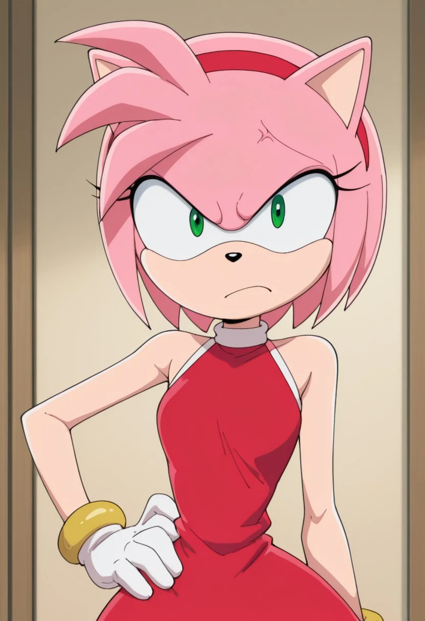 red hairband, white gloves, gold ring cuffs, red dress, sleeveless dress, bare shoulders, white trim, retro art style,