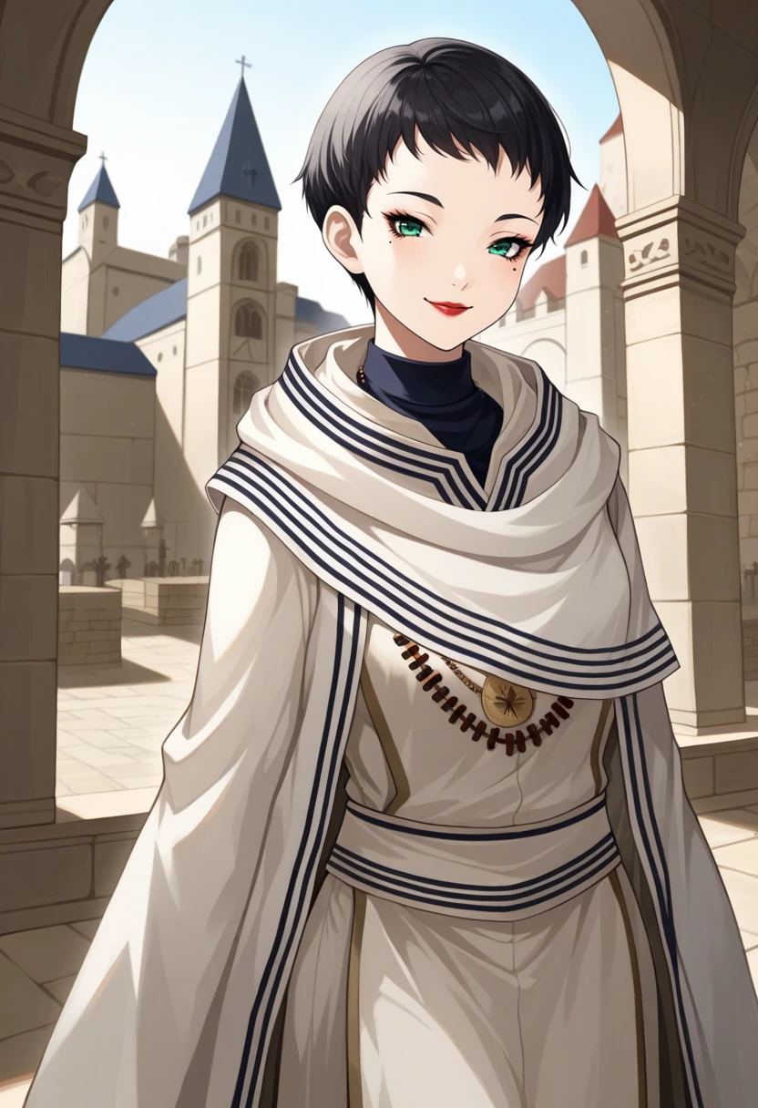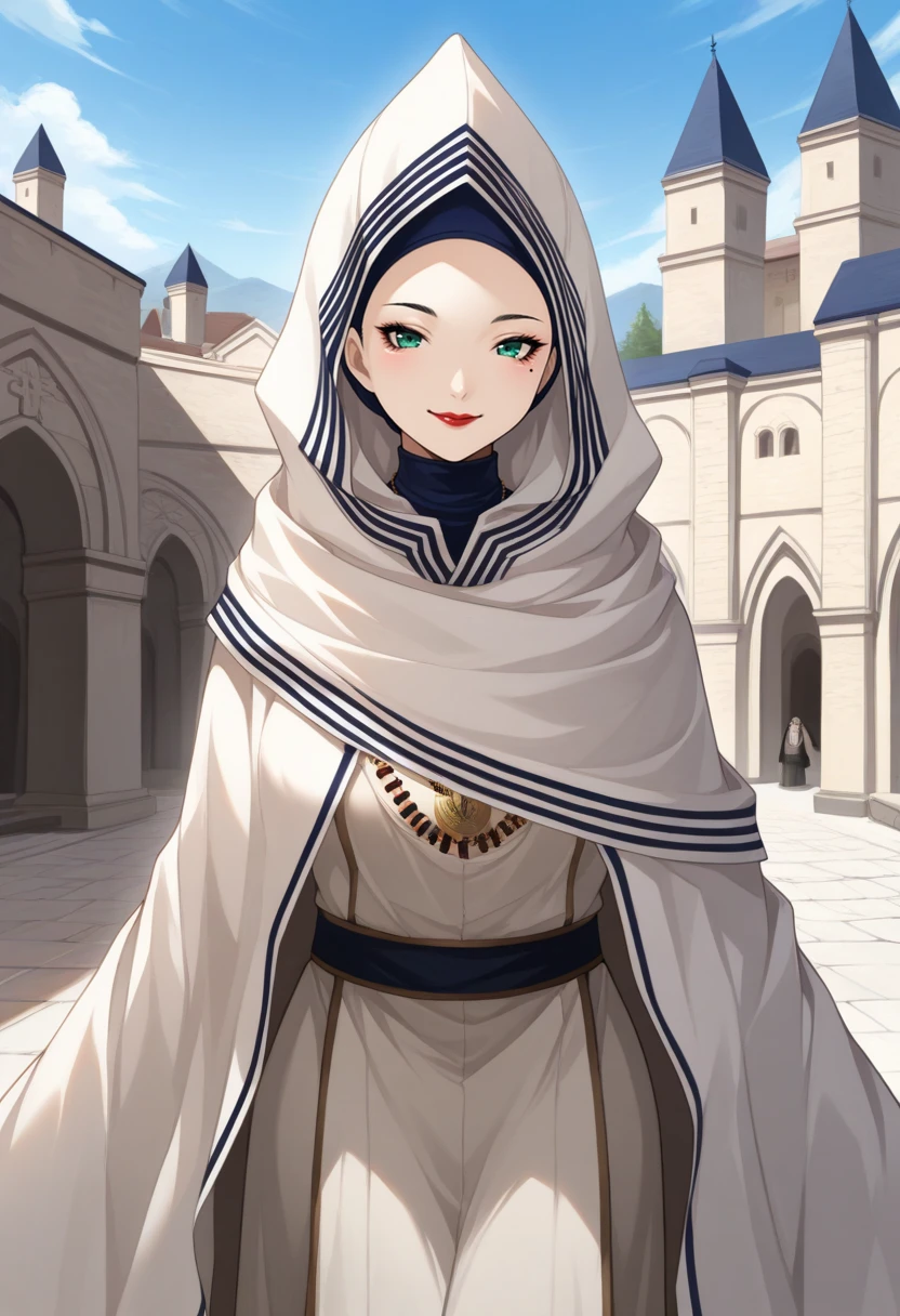 g4bbysmt, older female, green eyes, mole under eye, lipstick, hood, cloak, robe, necklace