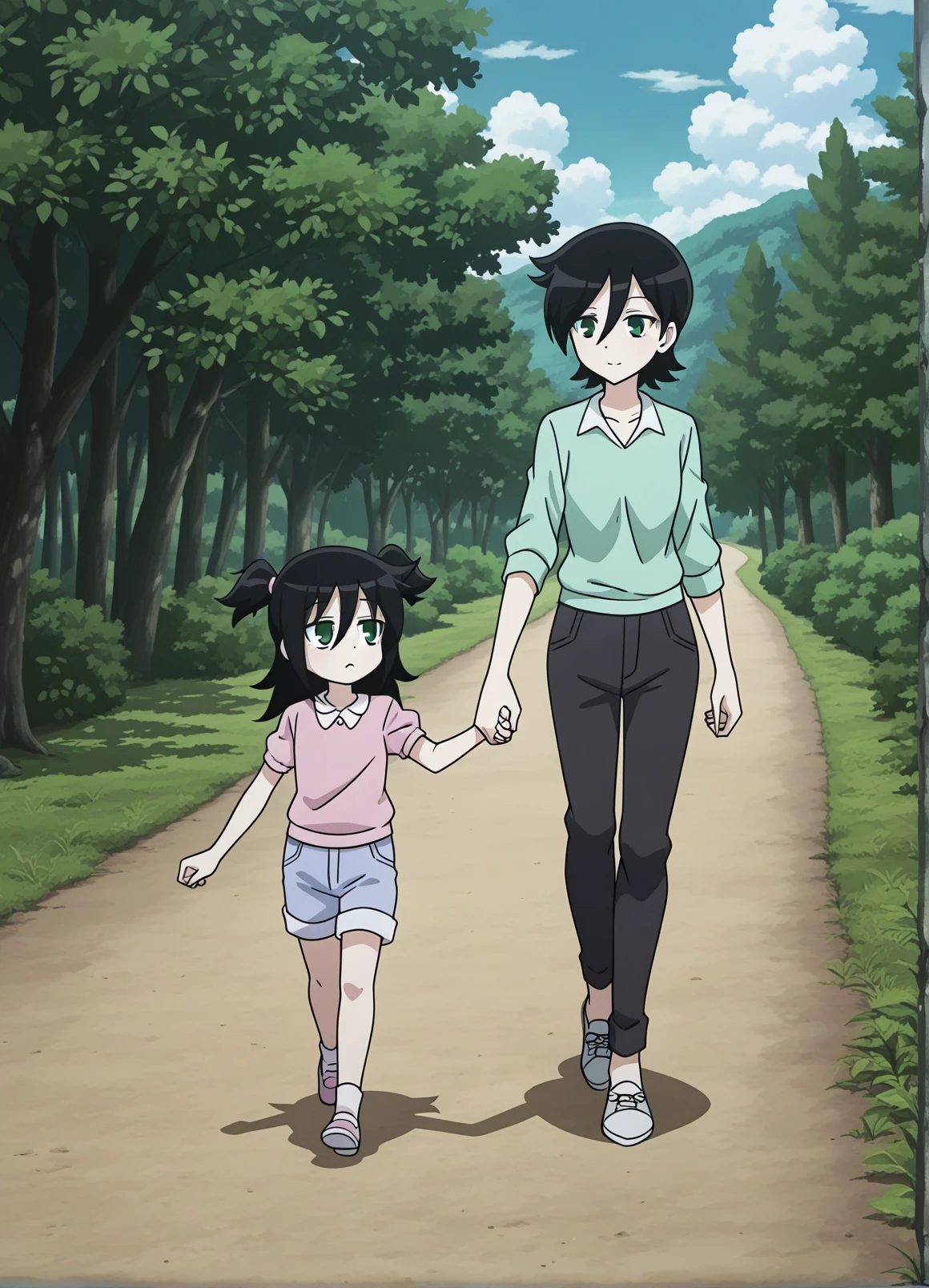 mokomama, green eyes, black hair
