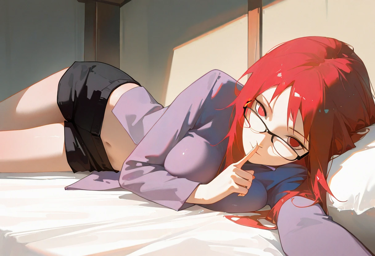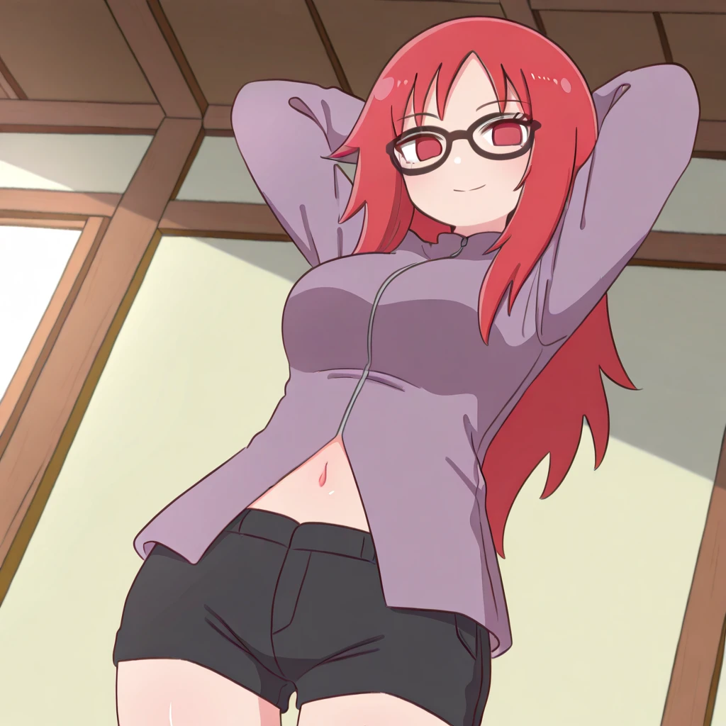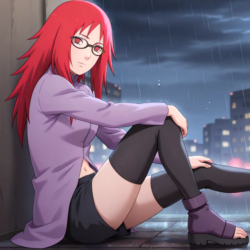 Karin Uzumaki,red hair,long hair,red eyes,glasses,purple jacket,navel,black shorts,black thighhighs,toeless footwear