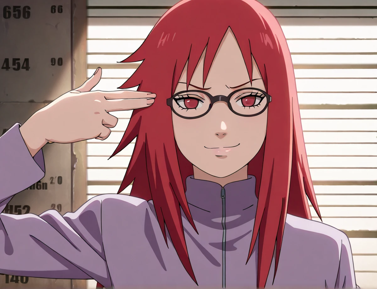Karin Uzumaki,red hair,sidecut,red eyes,glasses,purple necktie,white jacket,navel,sleeves rolled up,wristband,black shorts,long toeless boots