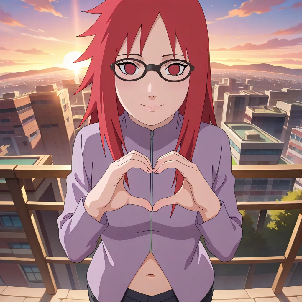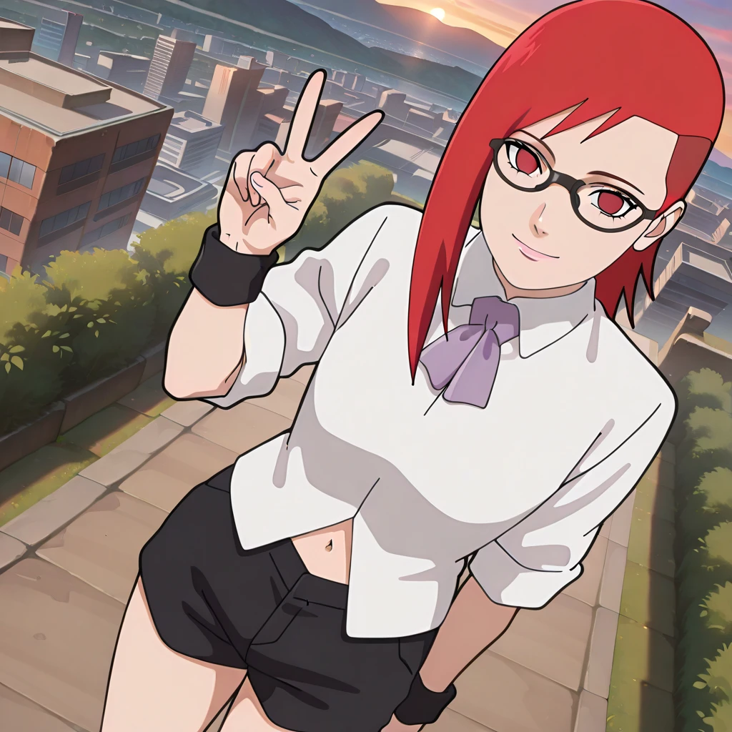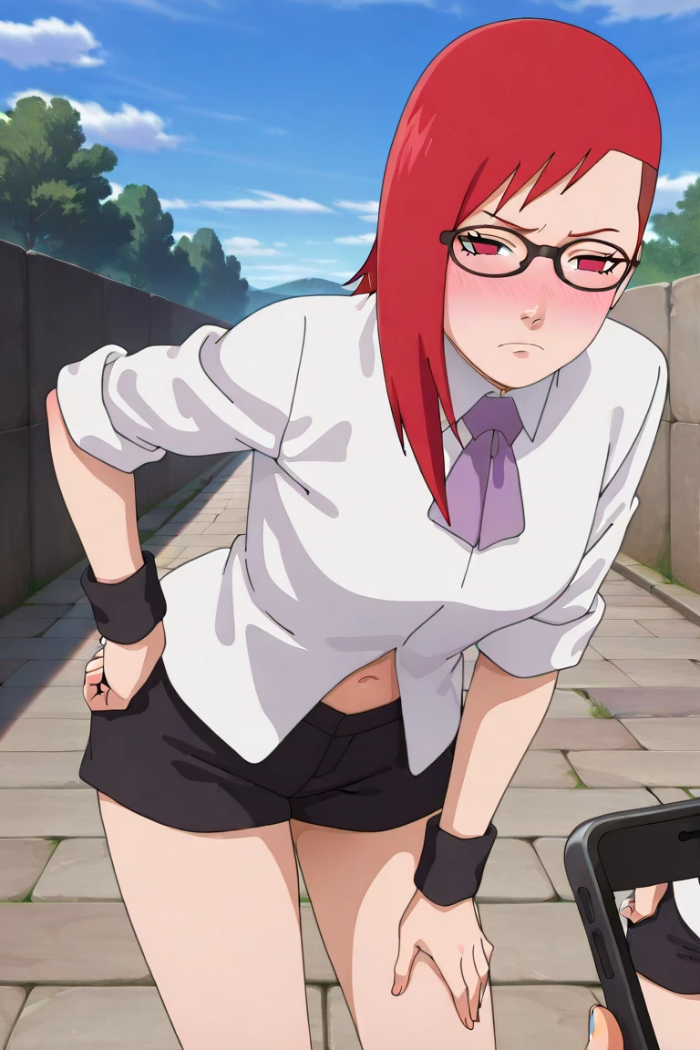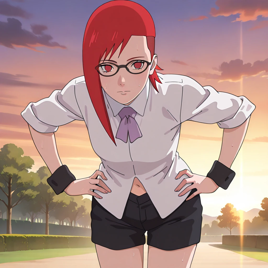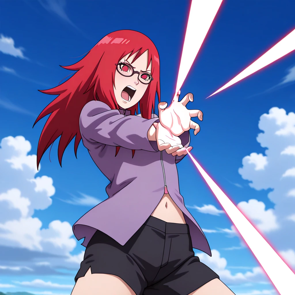 Boruto version: Karin Uzumaki,red hair,sidecut,red eyes,glasses,purple necktie,white jacket,navel,sleeves rolled up,wristband,black shorts,long toeless boots