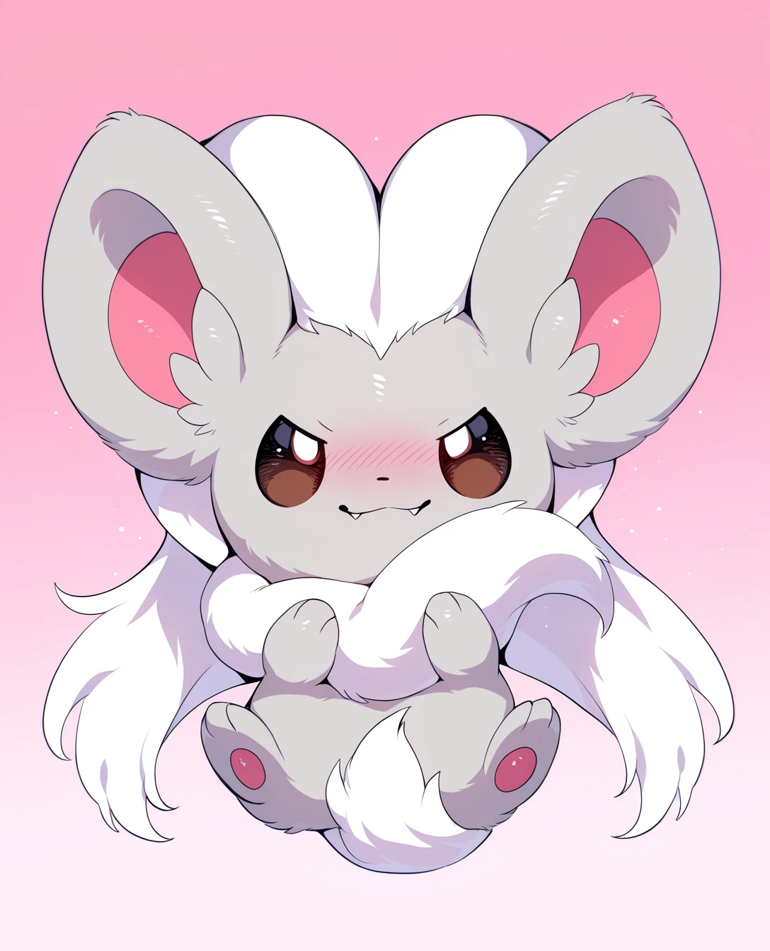 Useful tags: cinccino, big ears, beady eyes, fluffy fur, fur scarf, chibi feral, chibi, pink inner ears, long fluffy tail, white fur hair