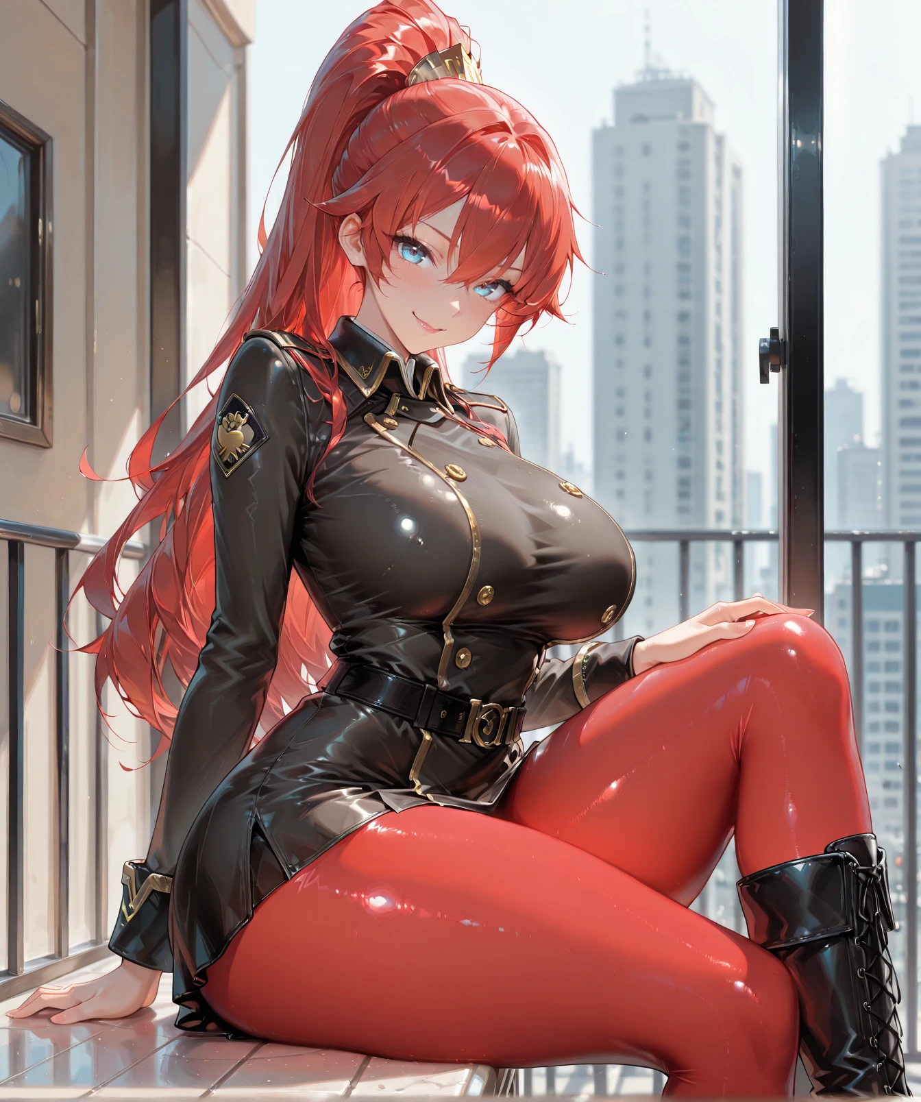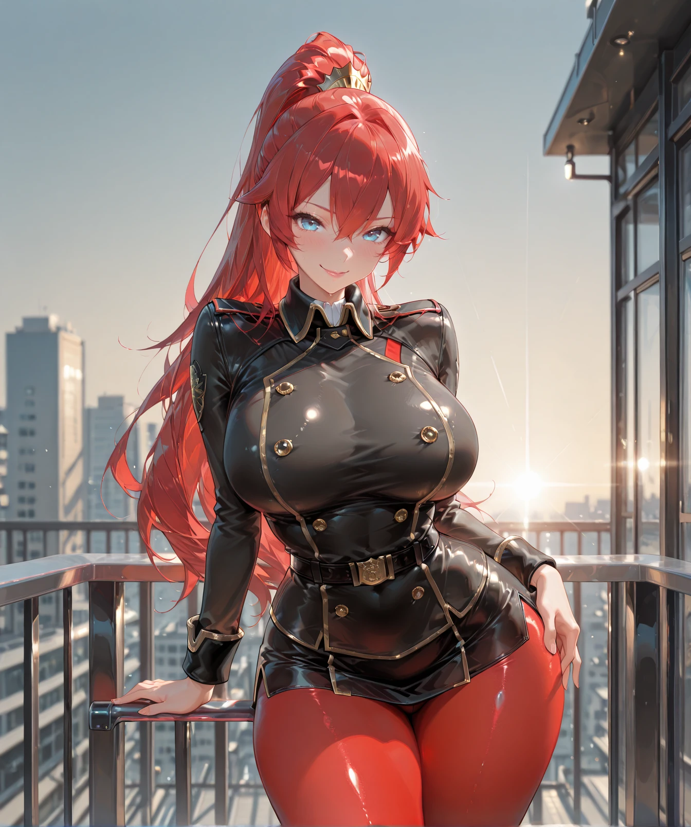 for her original dress: military uniform, gold hair ornament, red pantyhose, boots, miniskirt,