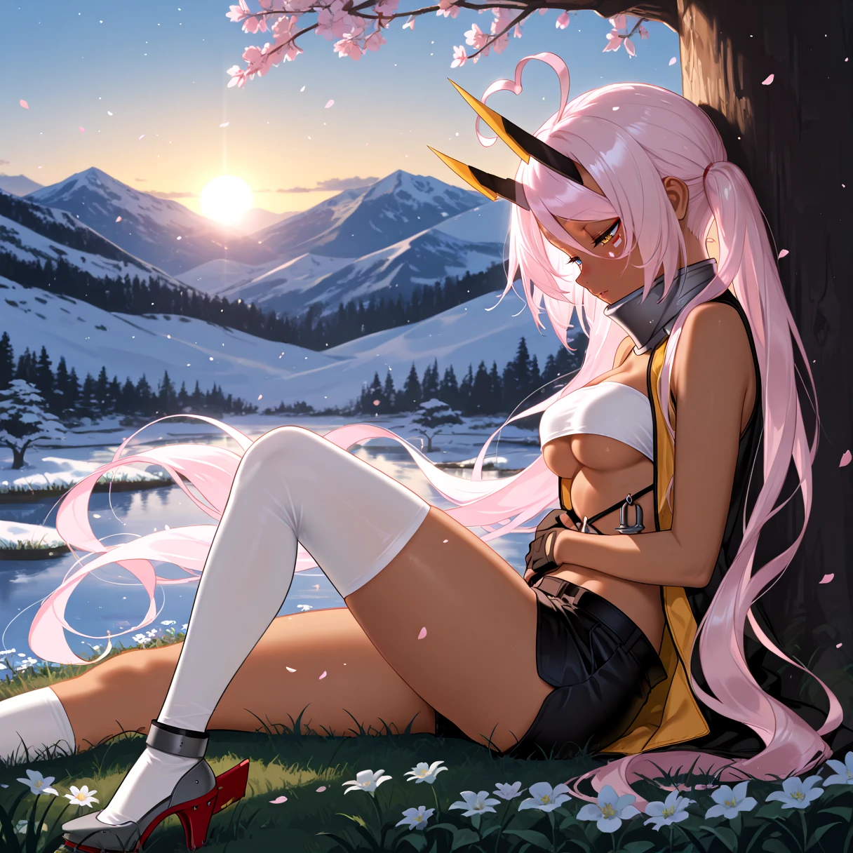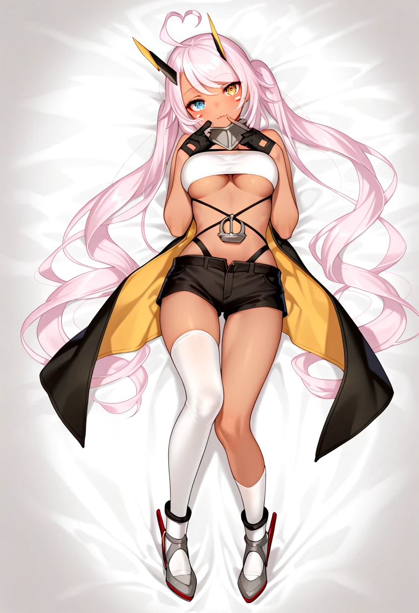 indidef, very long hair, light pink hair, heart ahoge, side ponytails, low twintails, heterochromia, blue eyes,yellow eyes,mechanical horns, ,dark skin, dark-skinned female,medium breasts, gorget, underboob, dark-skinned female, facepaint, white bandeau, sleeveless jacket, two-tone jacket, open jacket, cropped jacket, partially fingerless gloves, anchor, black shorts, short shorts, belt, single thighhigh, single kneehigh, white thighhigh, white kneehigh, asymmetrical legwear, high heels, rudder footwear,