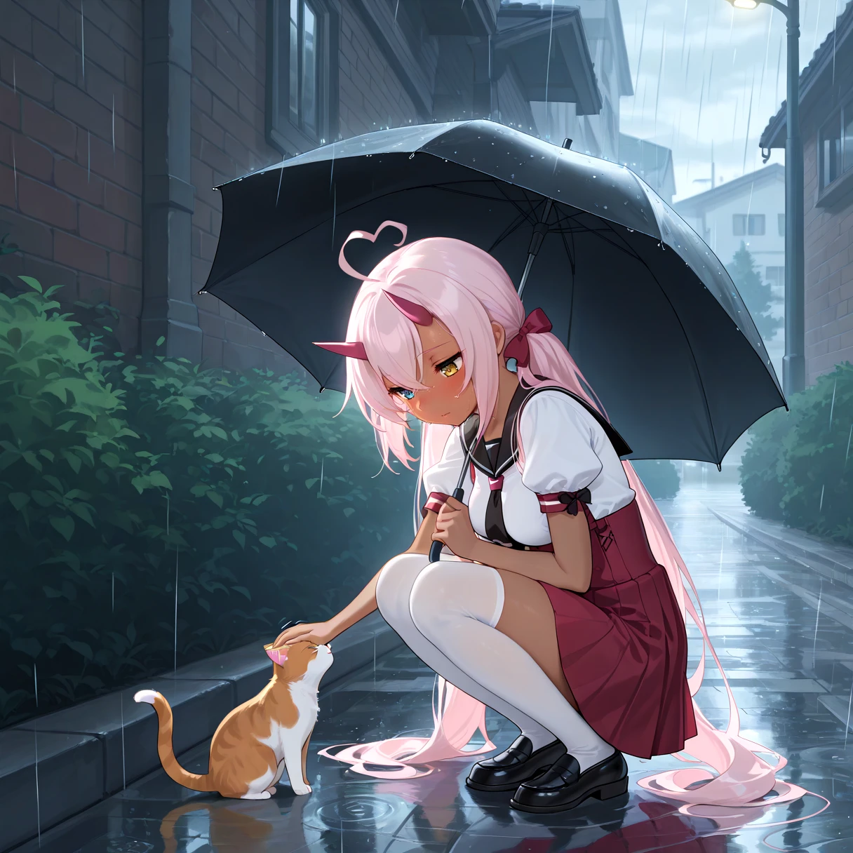 indischool, blue eyes, yellow eyes, very long hair, light pink hair, heart ahoge, side ponytails, low twintails, red hair bow, heterochromia, oni horns,dark skin, dark-skinned female, medium breasts, underbust, black sailor collar, puffy short sleeves, black bow, white shirt, school uniform, pleated skirt, suspender skirt, high-waist skirt, red skirt, zettai ryouiki, white thighhighs, black loafers,