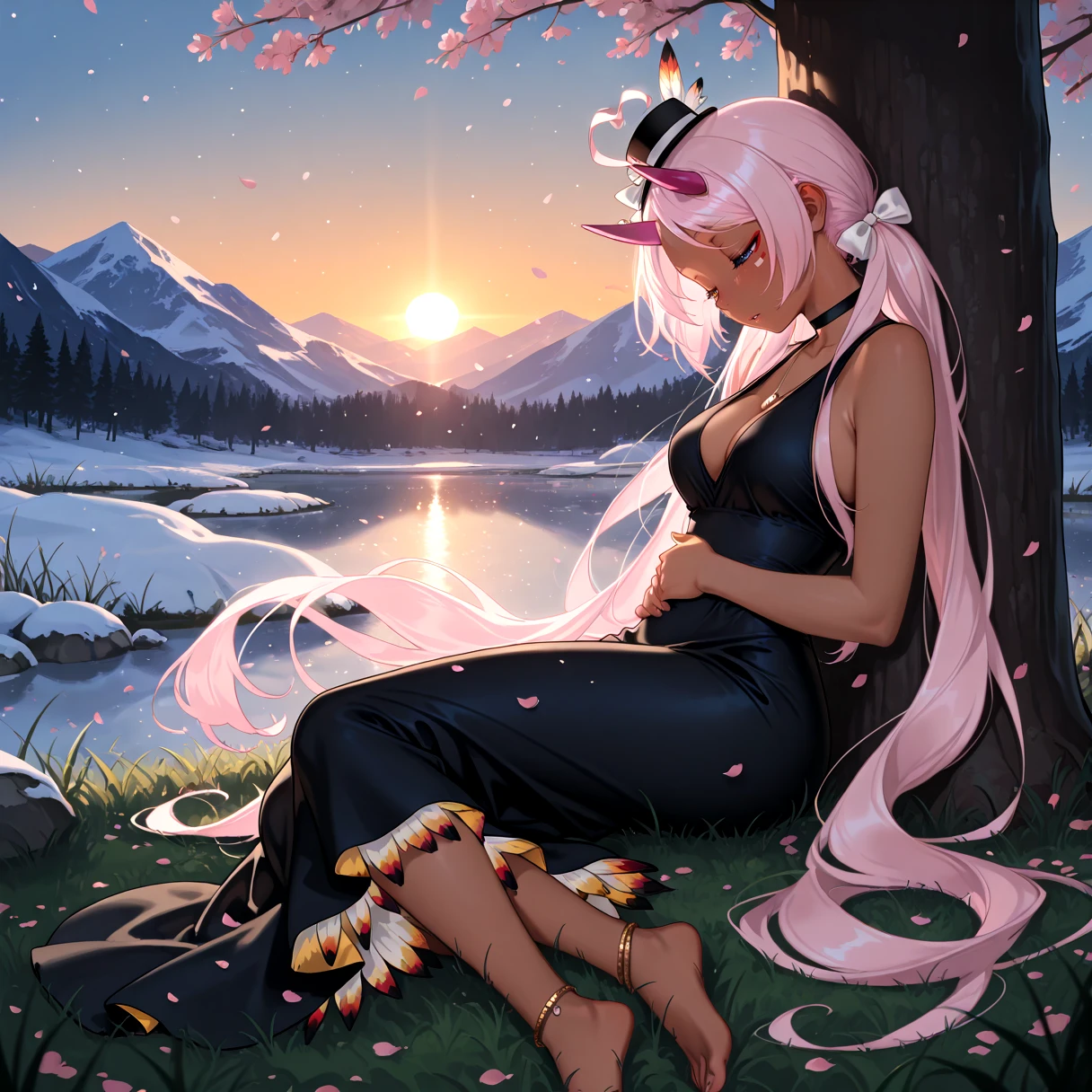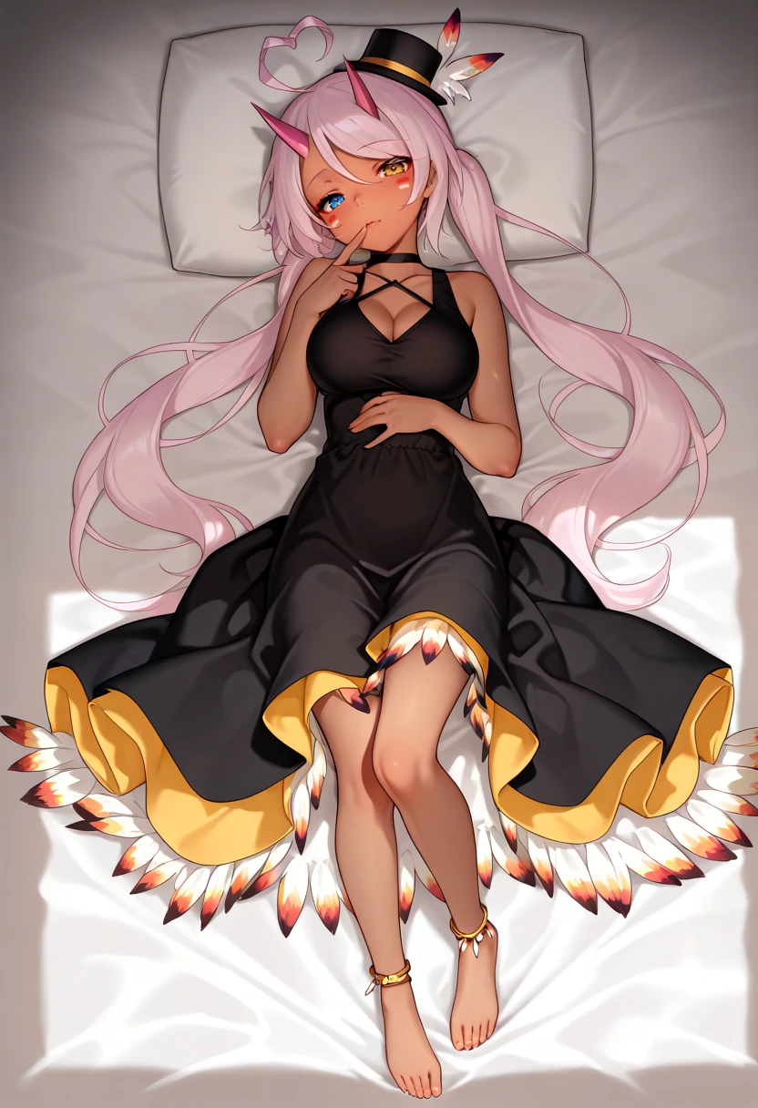 indidress,very long hair, light pink hair,white bow, hair bow, heart ahoge, side ponytails, low twintails, heterochromia, blue eyes, oni horns, hat feather, dark skin, dark-skinned female,asymmetrical horns, mini top hat, feather hair ornament, facepaint, medium breasts, black choker, sleeveless dress, two tone dress, black dress yellow dress, deep v-neck, cleavage cutout, feather trim, multicolored feathers, anklet, barefoot,