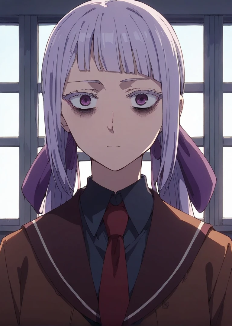 Keywords: Philomela, purple eyes, purple hair, low twintails, hair ribbons, blunt bangs,