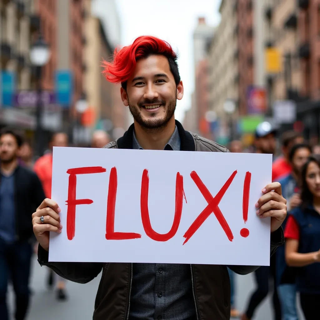 Markiplier, a man has a medium, vibrant red section of hair swept to the left, with contrasting black temples.