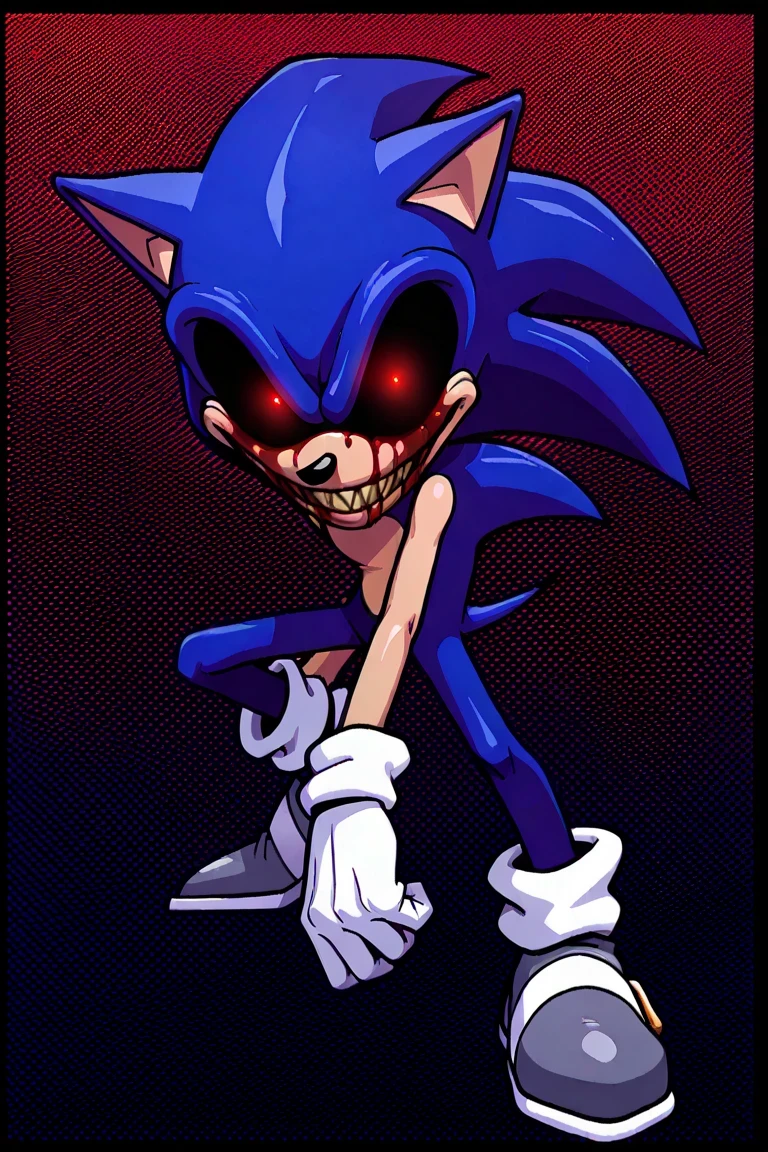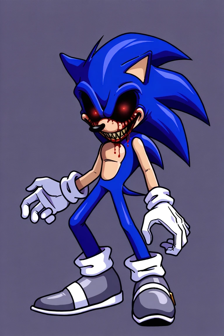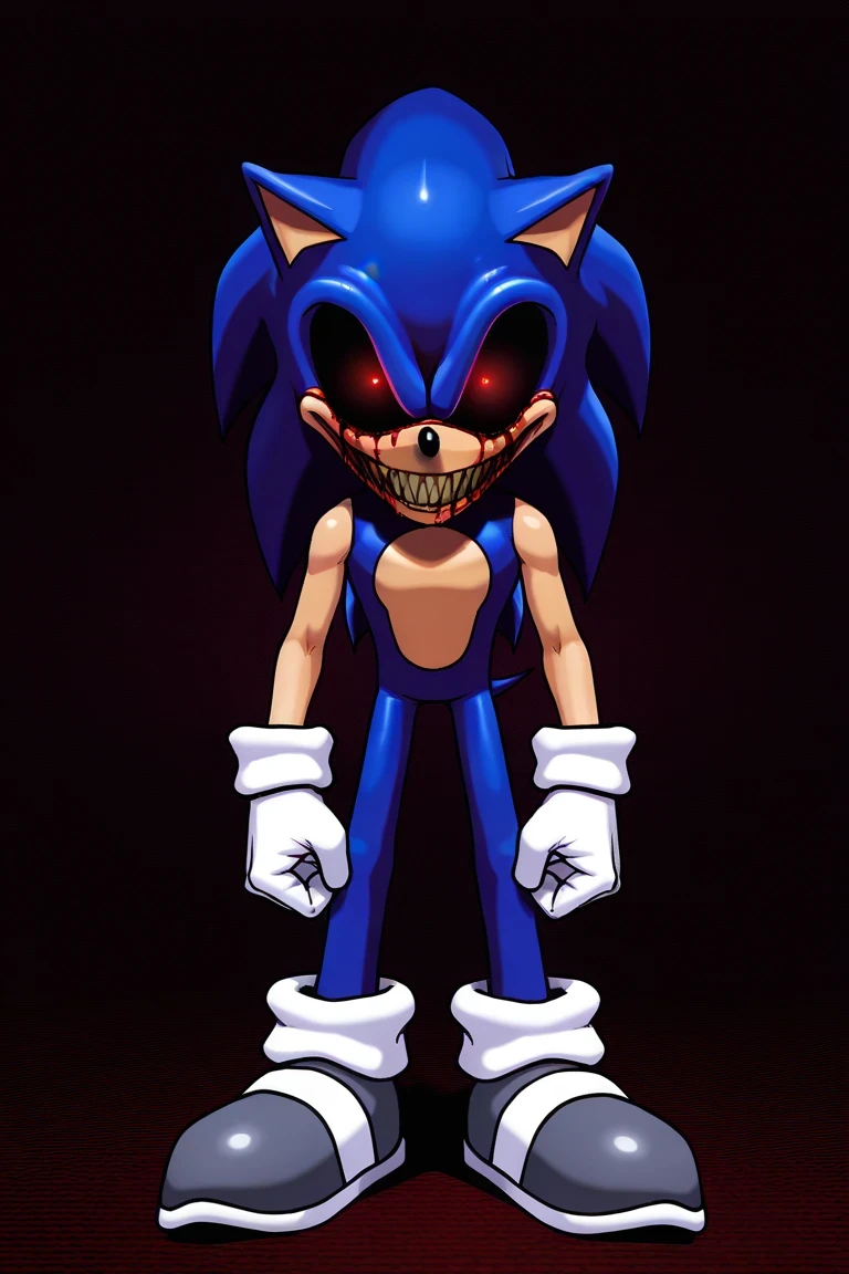2011EXE, 1boy, Sonic the Hedgehog, dark blue fur, softer arms, red glowing eyes, black sclera, yellow sharp teeth, bloody tears, white gloves, gray shoes, horror
