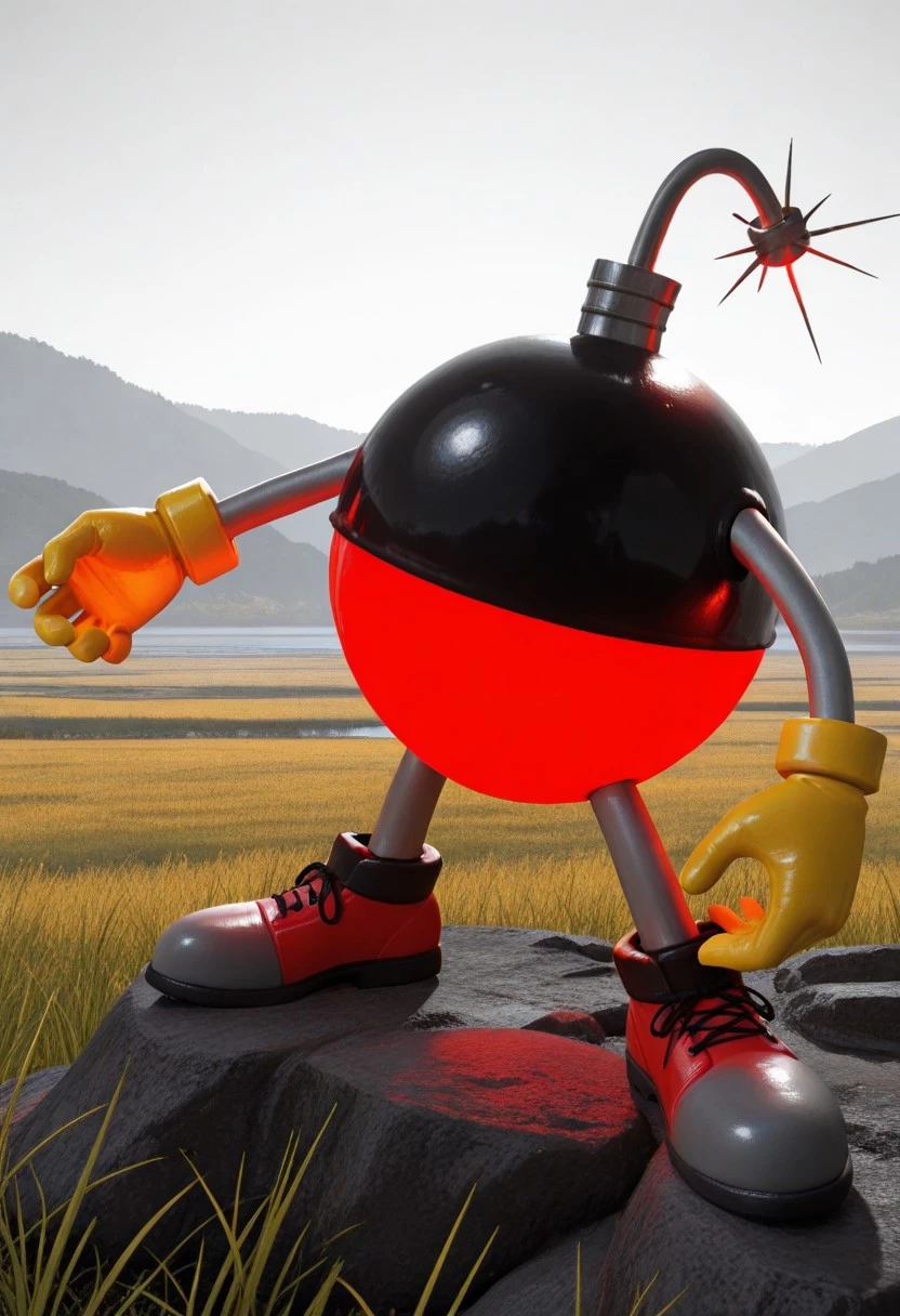 Bomb, black upper half of body, red lower half of body, lit fuse on top, no face, gray arms, yellow hands, red shoes