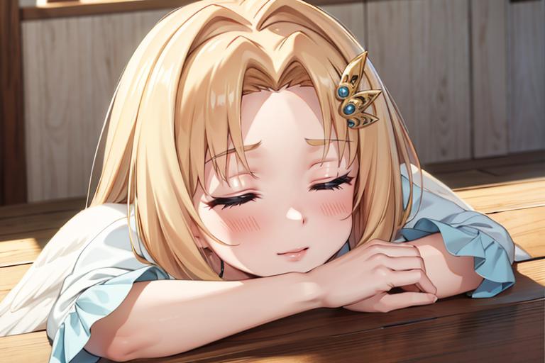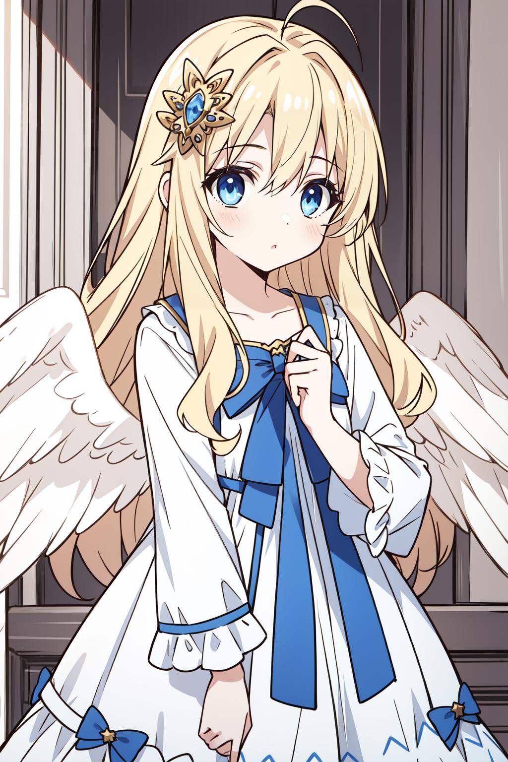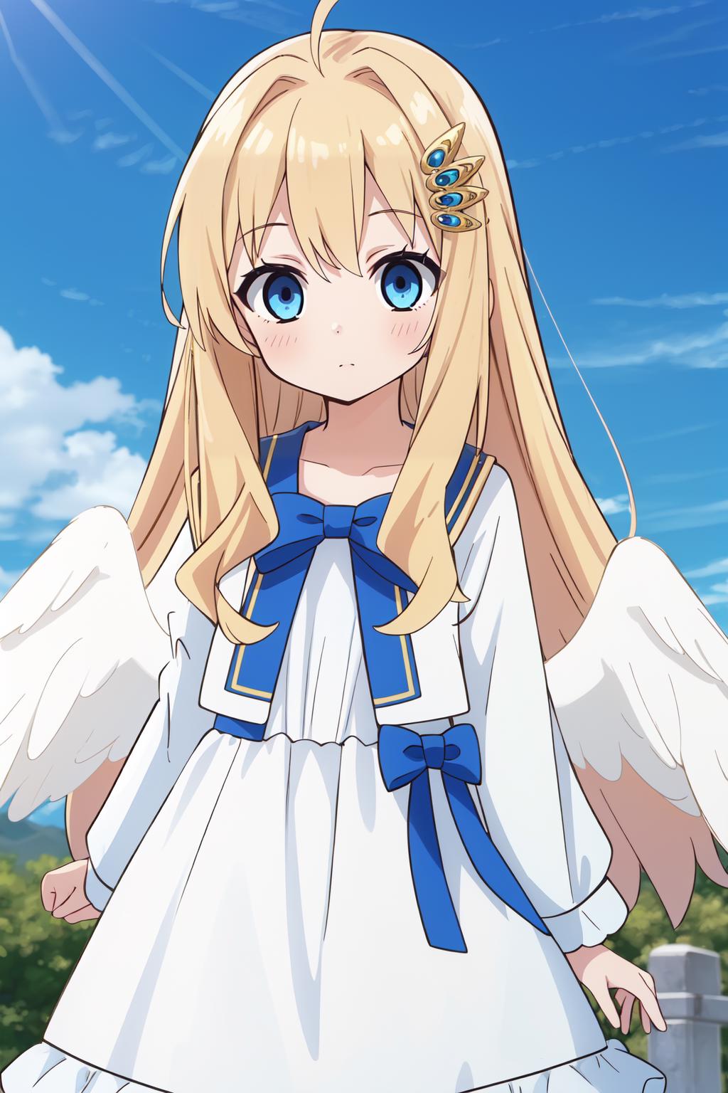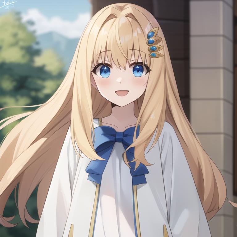 Character: filo, blonde hair, ahoge, hair ornament, flat chest, bangs, long hair