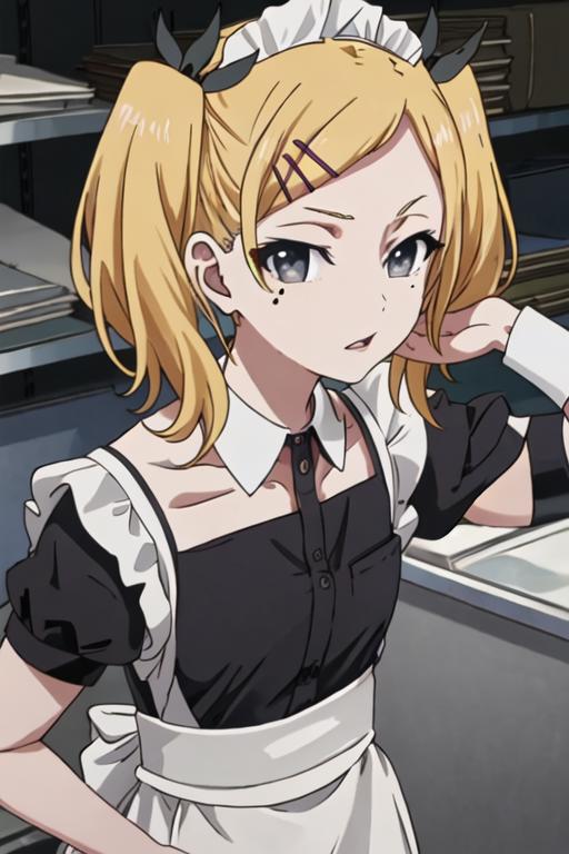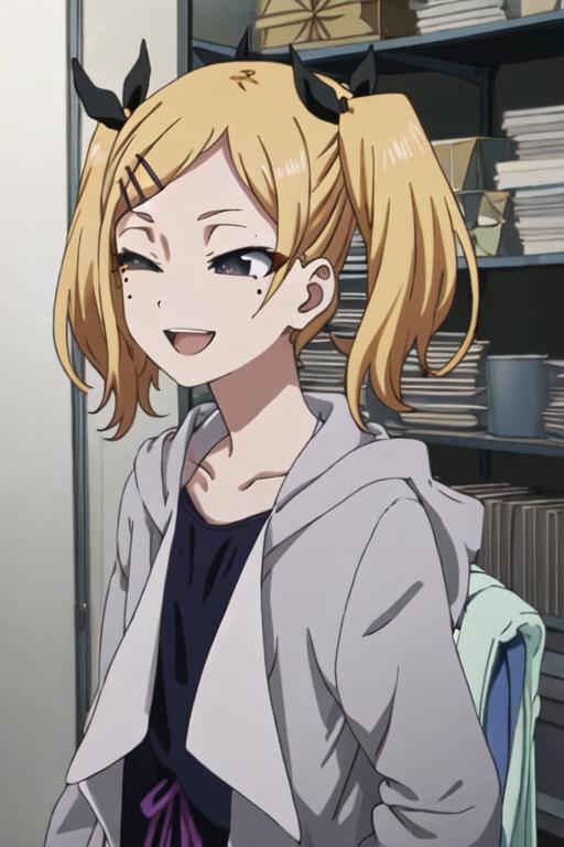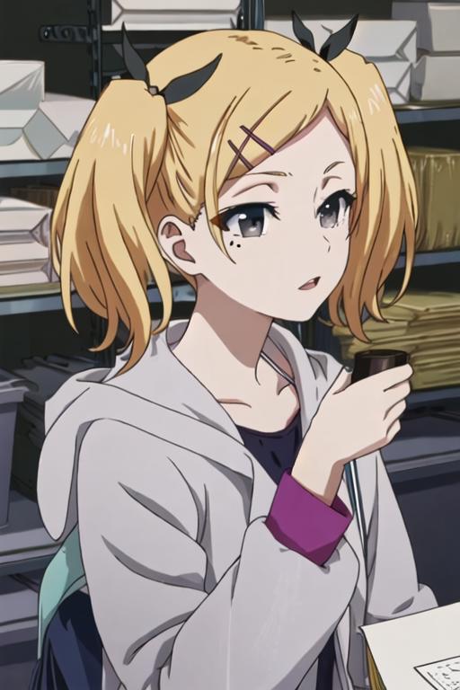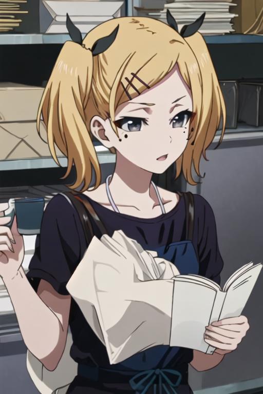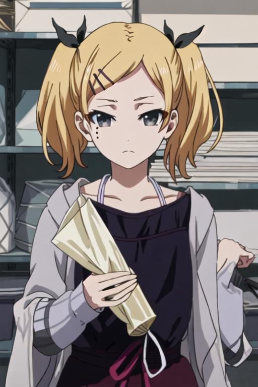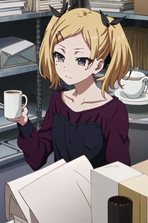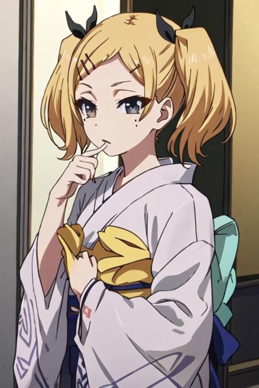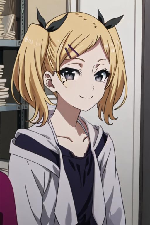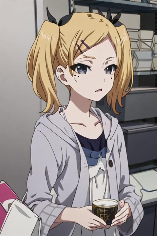 The trigger word is yano_erika_shirobako, and the recommended tags are best quality, masterpiece, highres, solo, {yano_erika_shirobako:1.15}, blonde_hair, twintails, hair_ornament, hairclip, ribbon, mole, mole_under_eye, hair_ribbon, short_twintails, short_hair, grey_eyes.