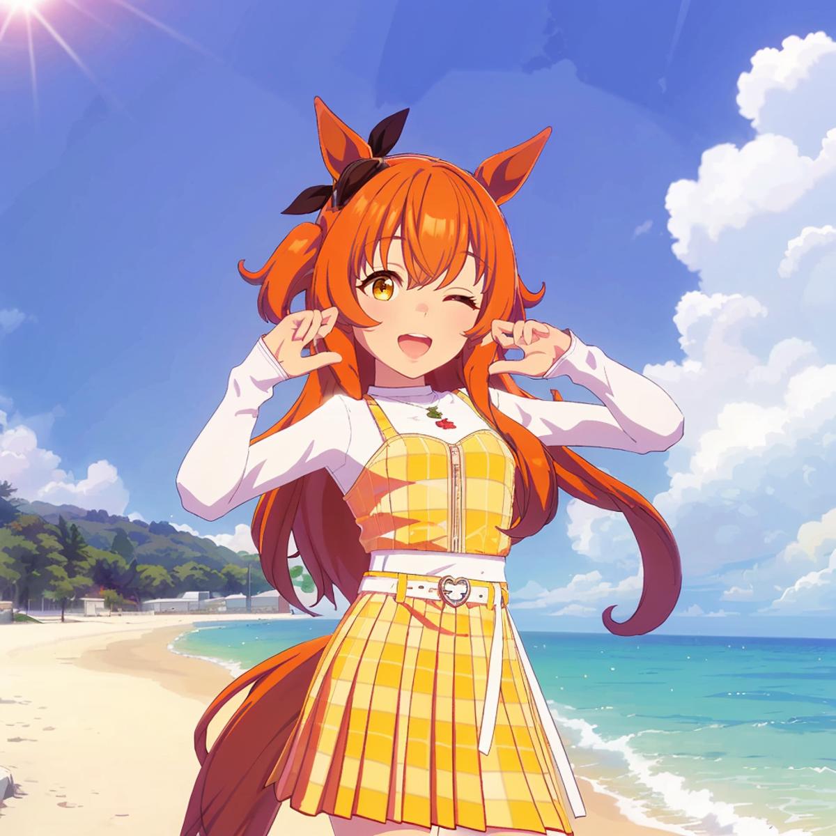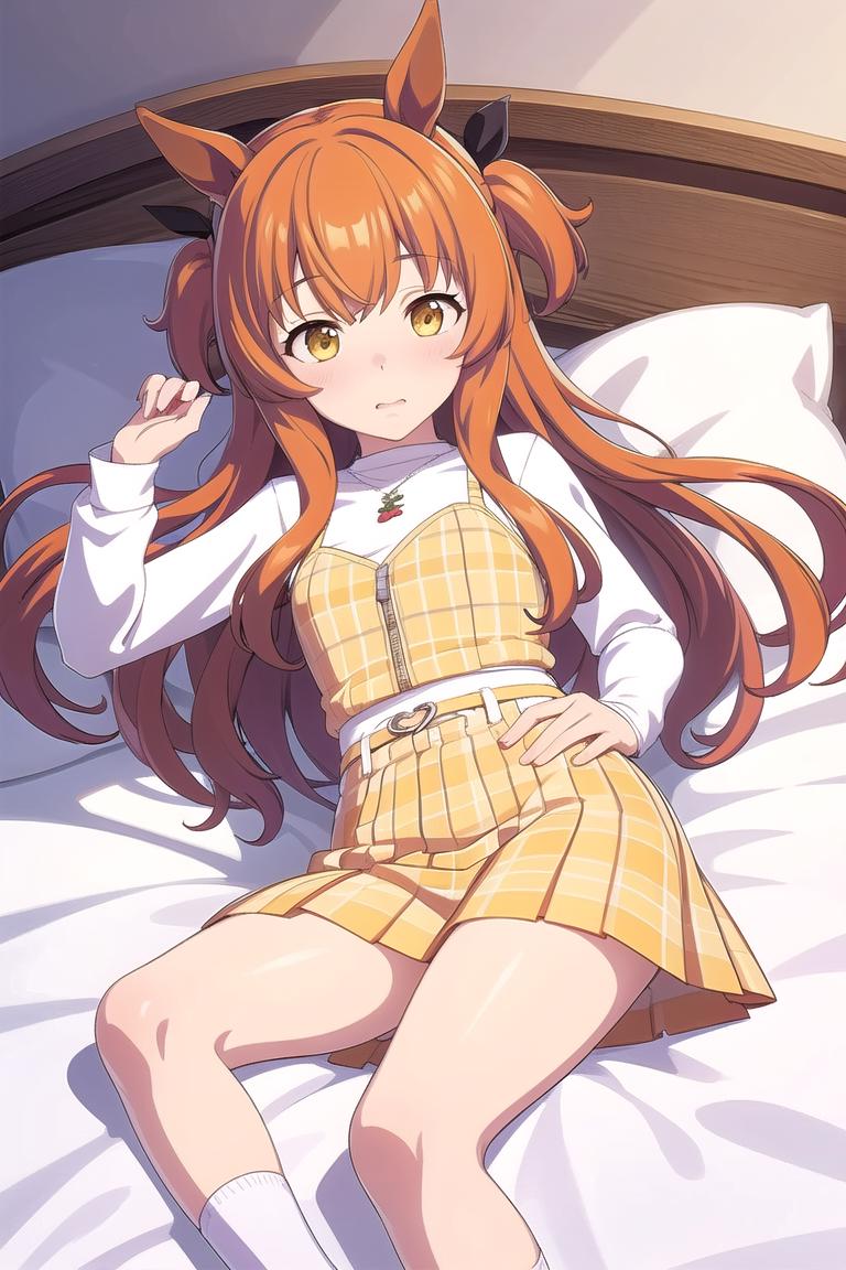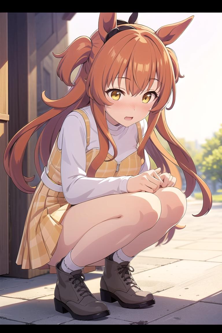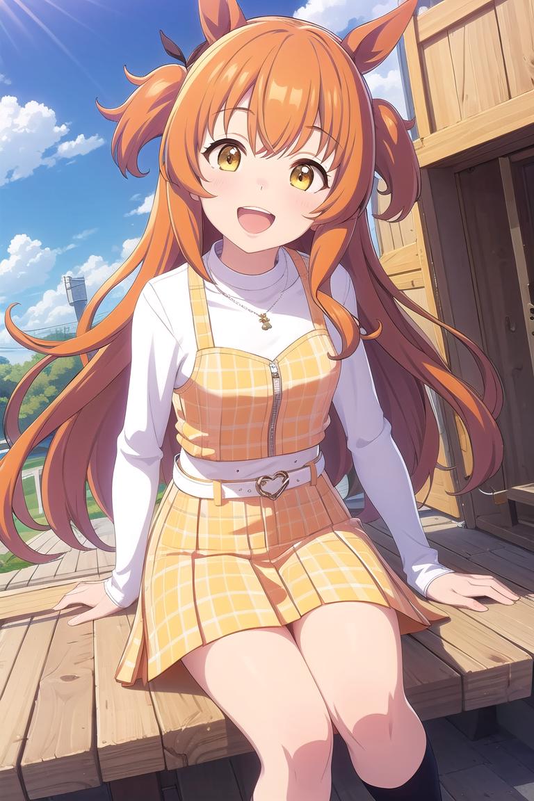 orange hair, horse ear, yellow vest, long sleeves, yellow skirt, socks, Mayano Topgun (umamusume) (casual clothes ver.) Lora