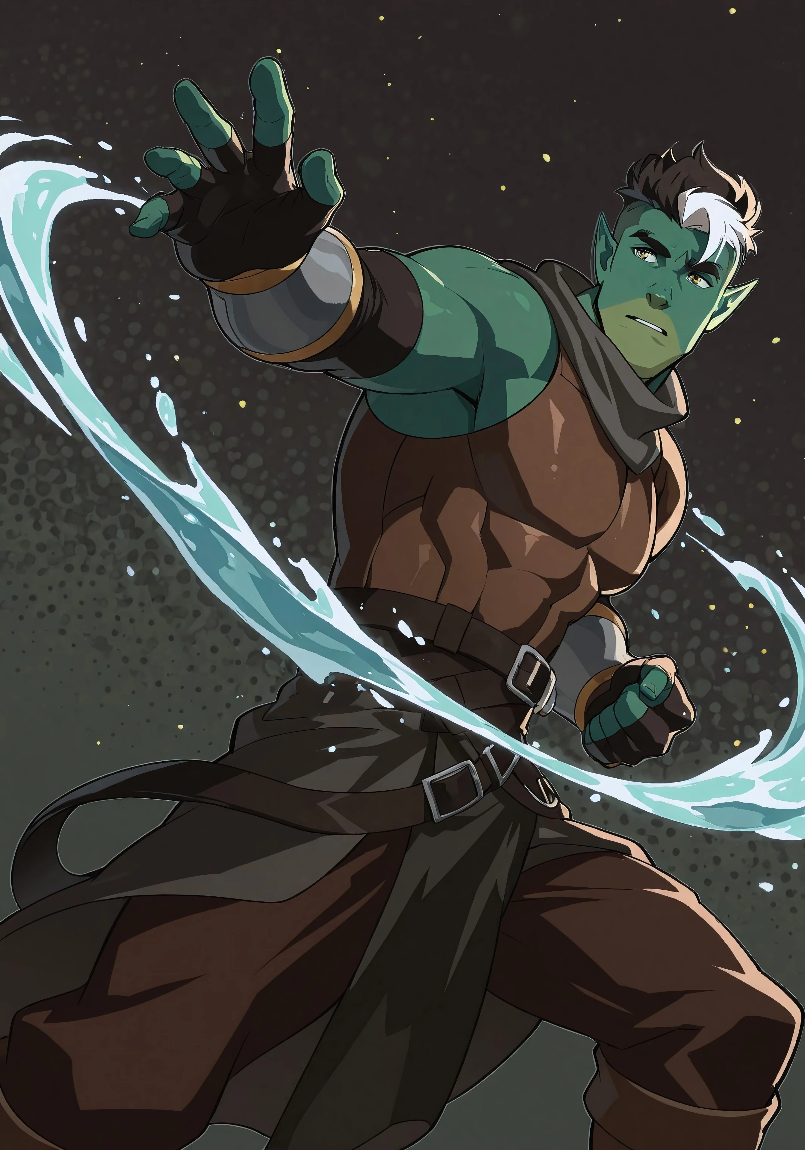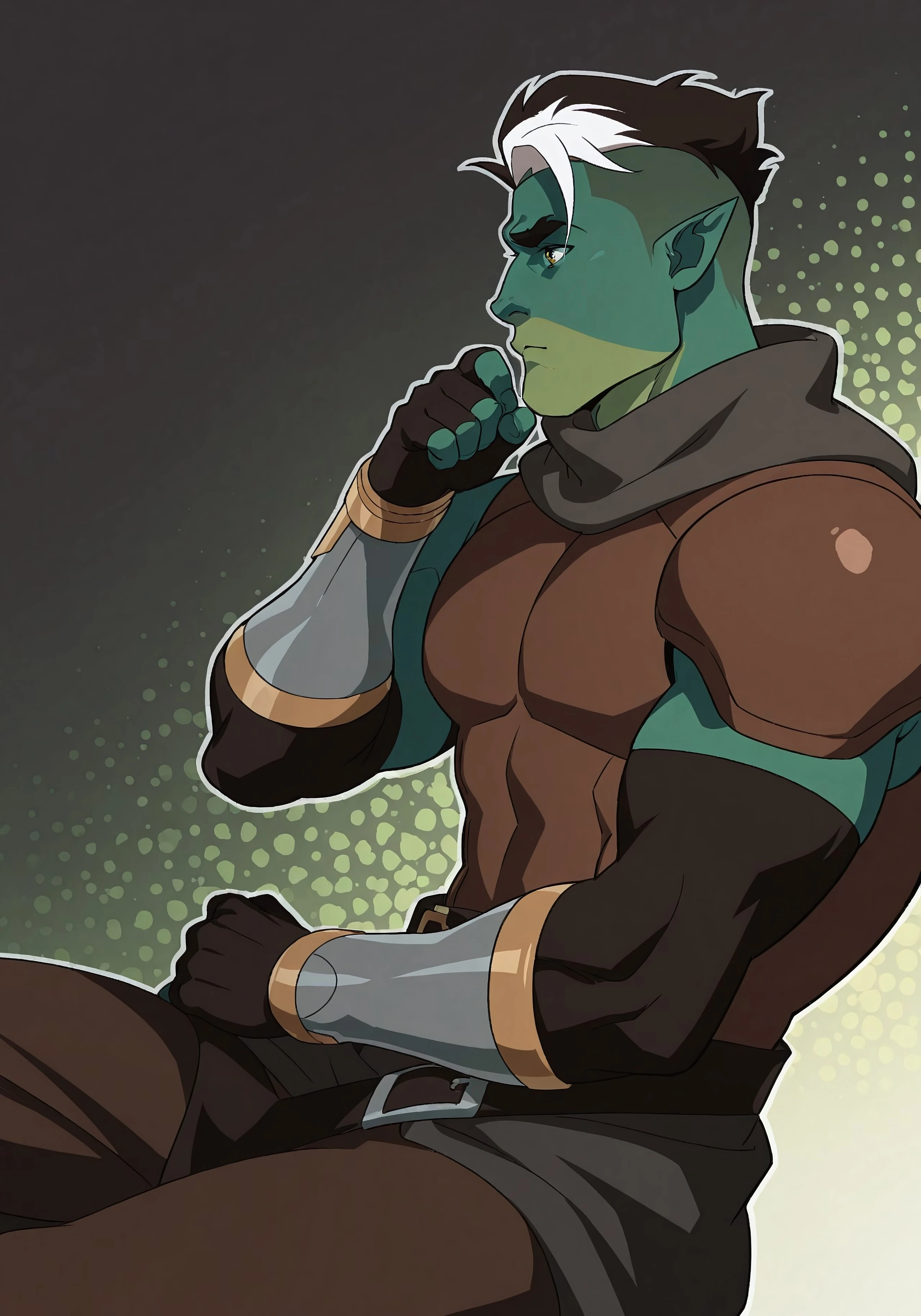 fj0rd, green skin, two-tone green skin, pointy ears, yellow eyes, undercut, spiky black hair, white hair-streak,