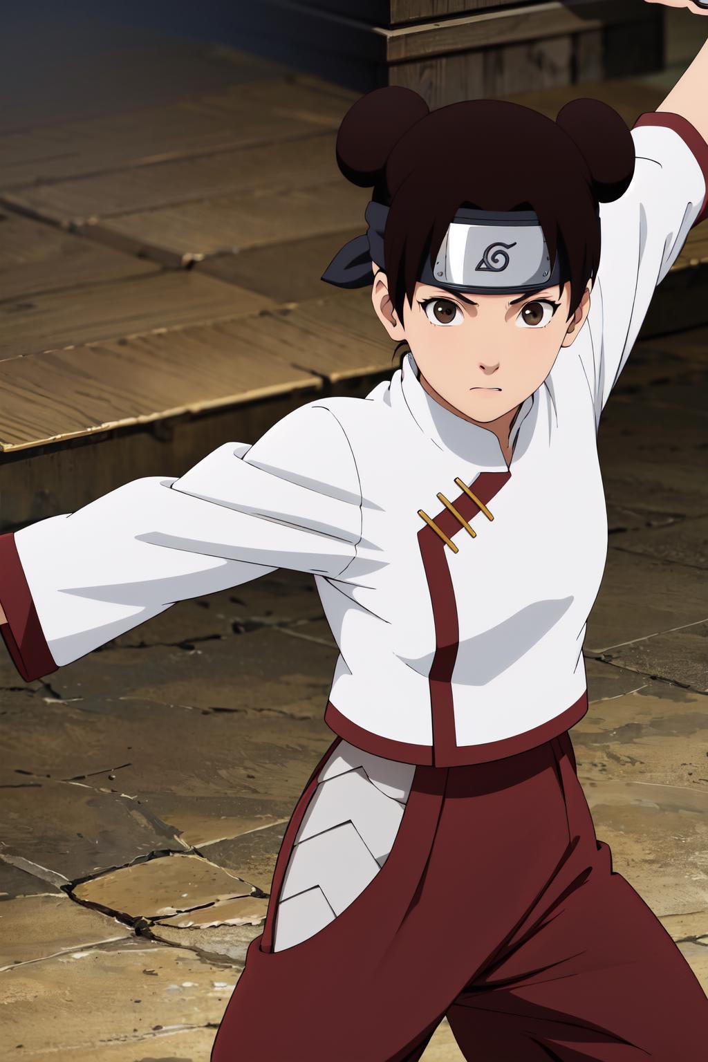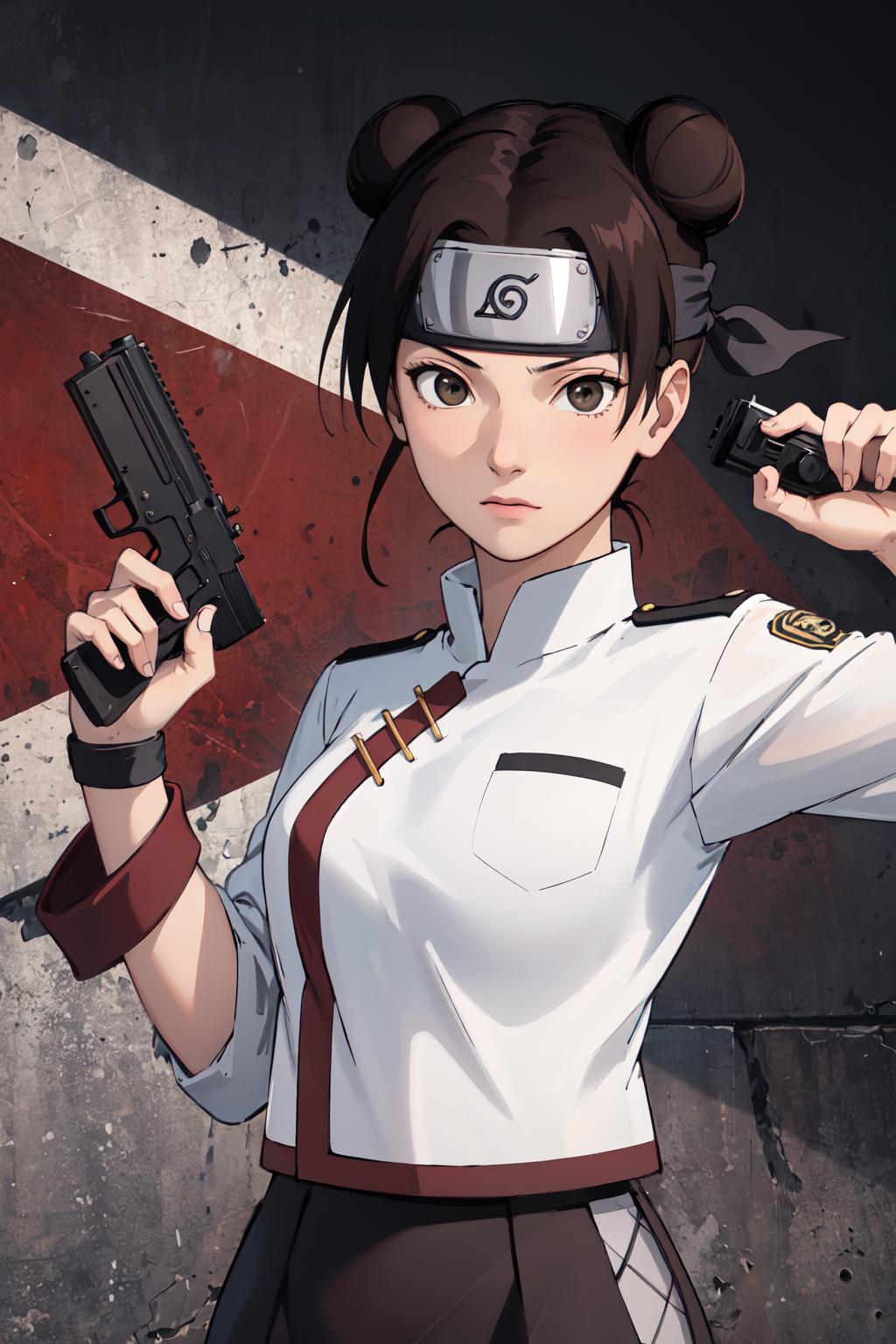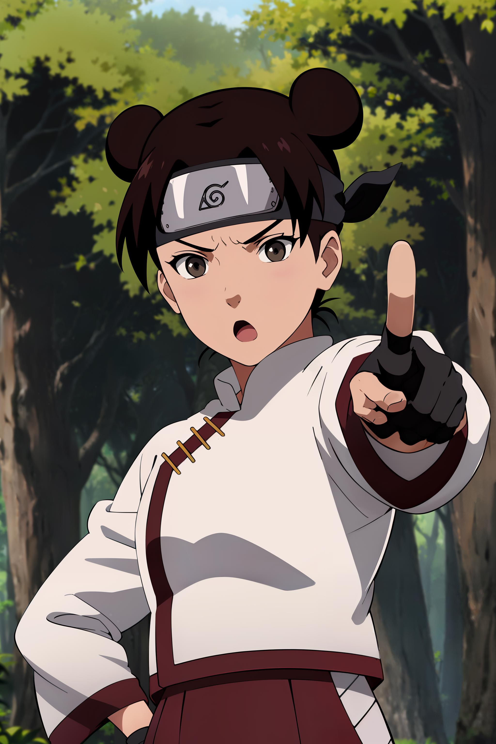 absurdres, (best quality),(masterpiece),tenten\(shippuden\), 1girl, solo, hakama pants,white shirt, medium breasts, hand on hip,forehead protector, konohagakure symbol, headband, looking at viewer, outdoors, bamboo forest, frownFor other outfit that is not trained i recommend using lower weight like 0.65 or 0.7.
