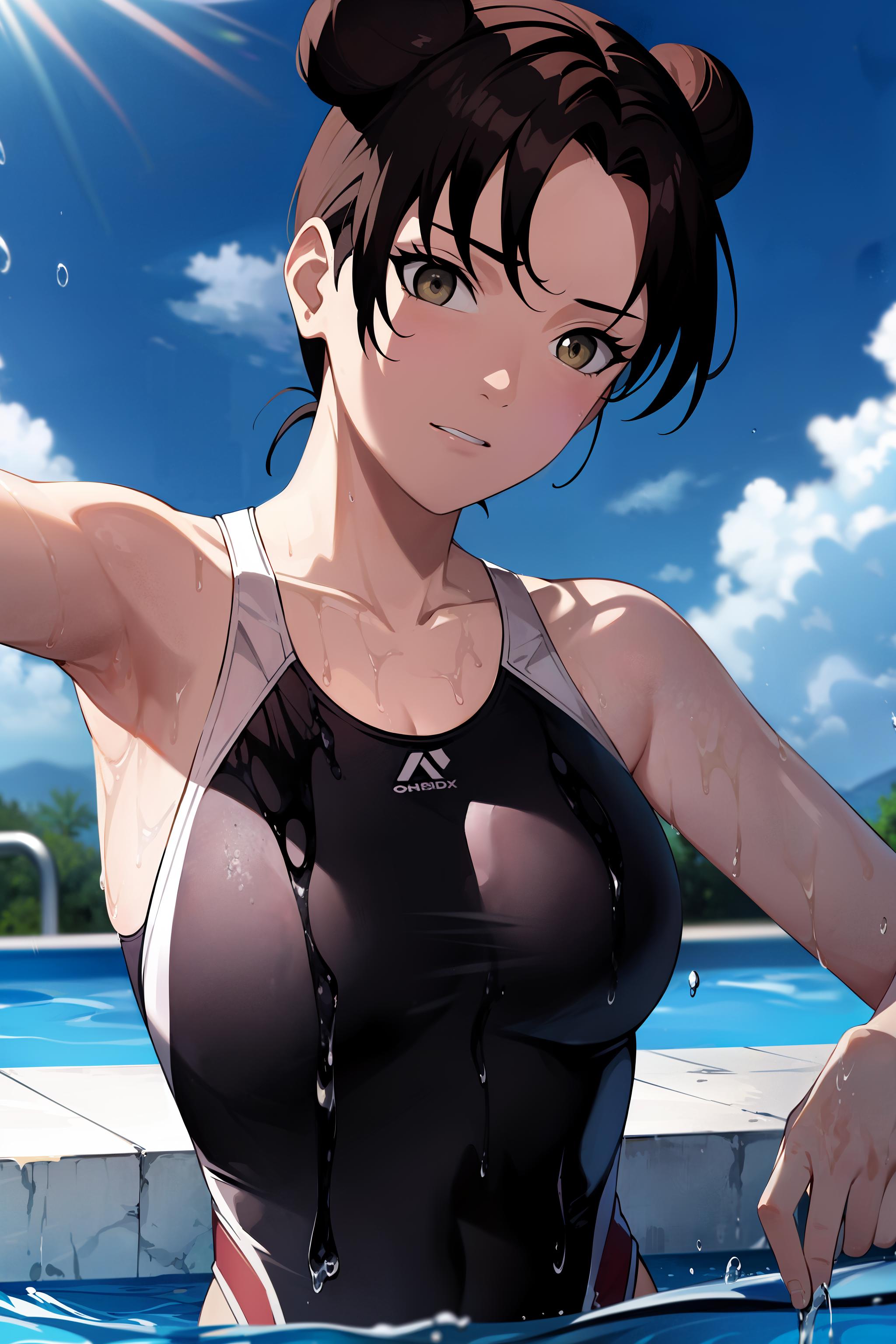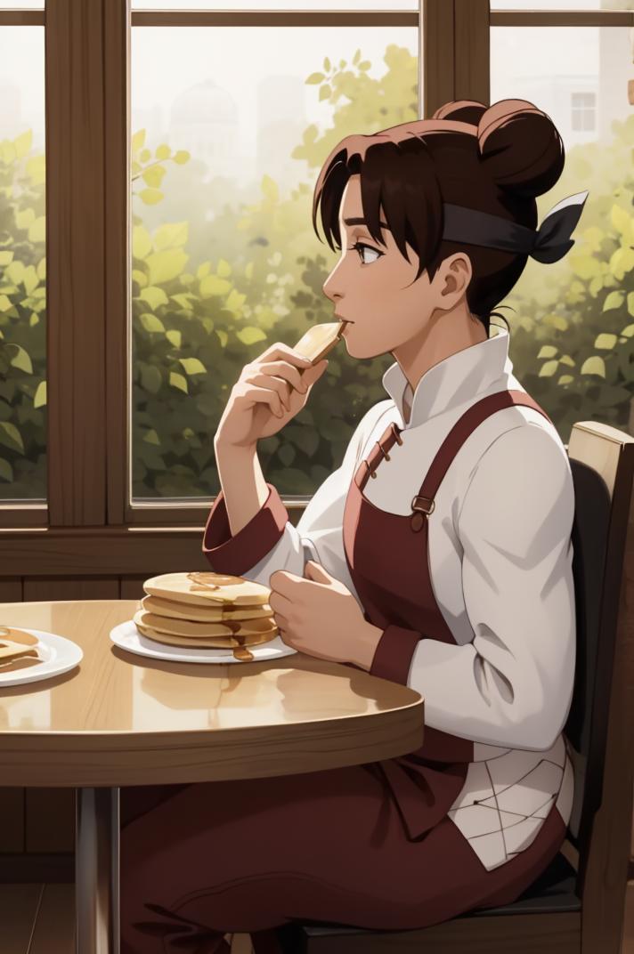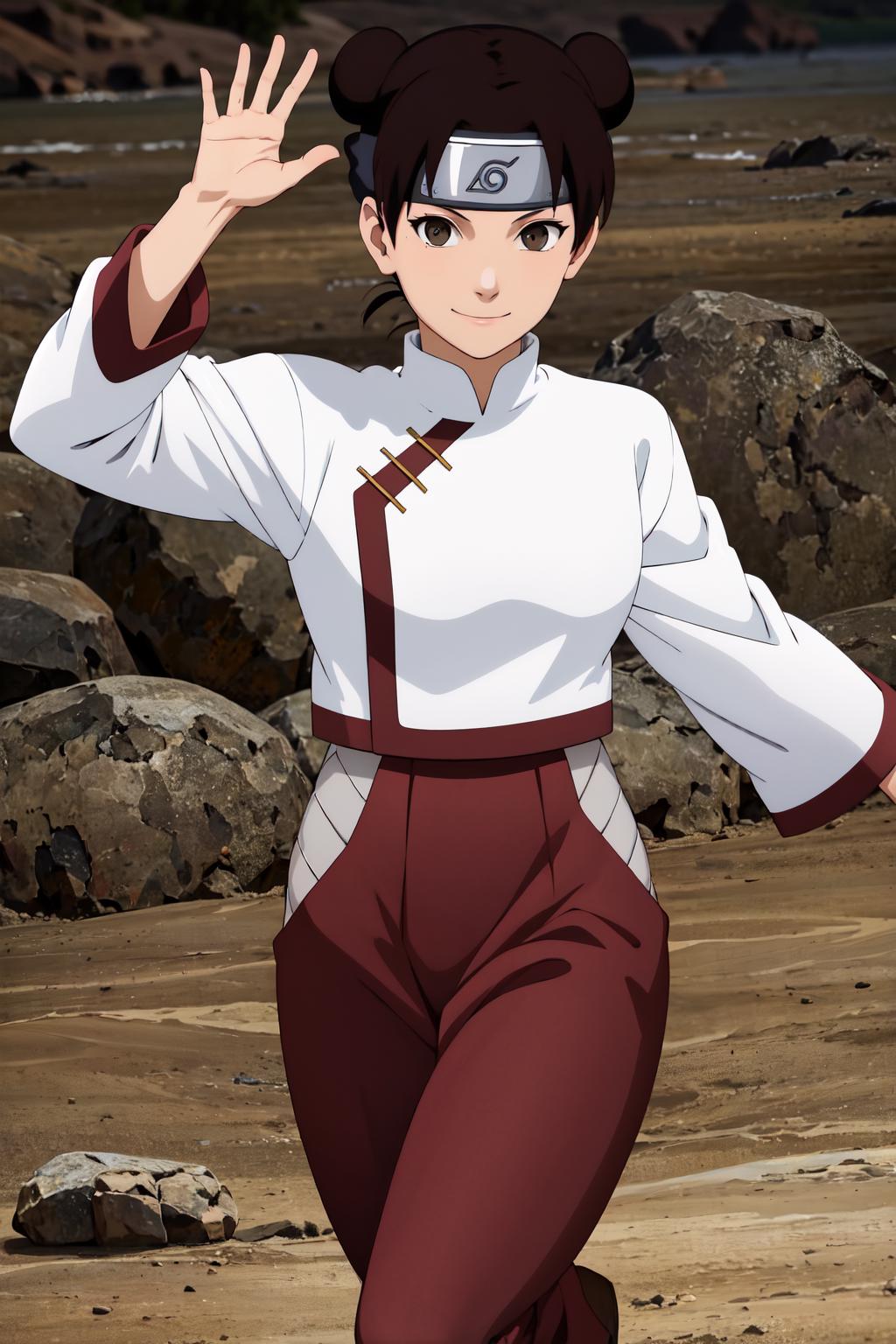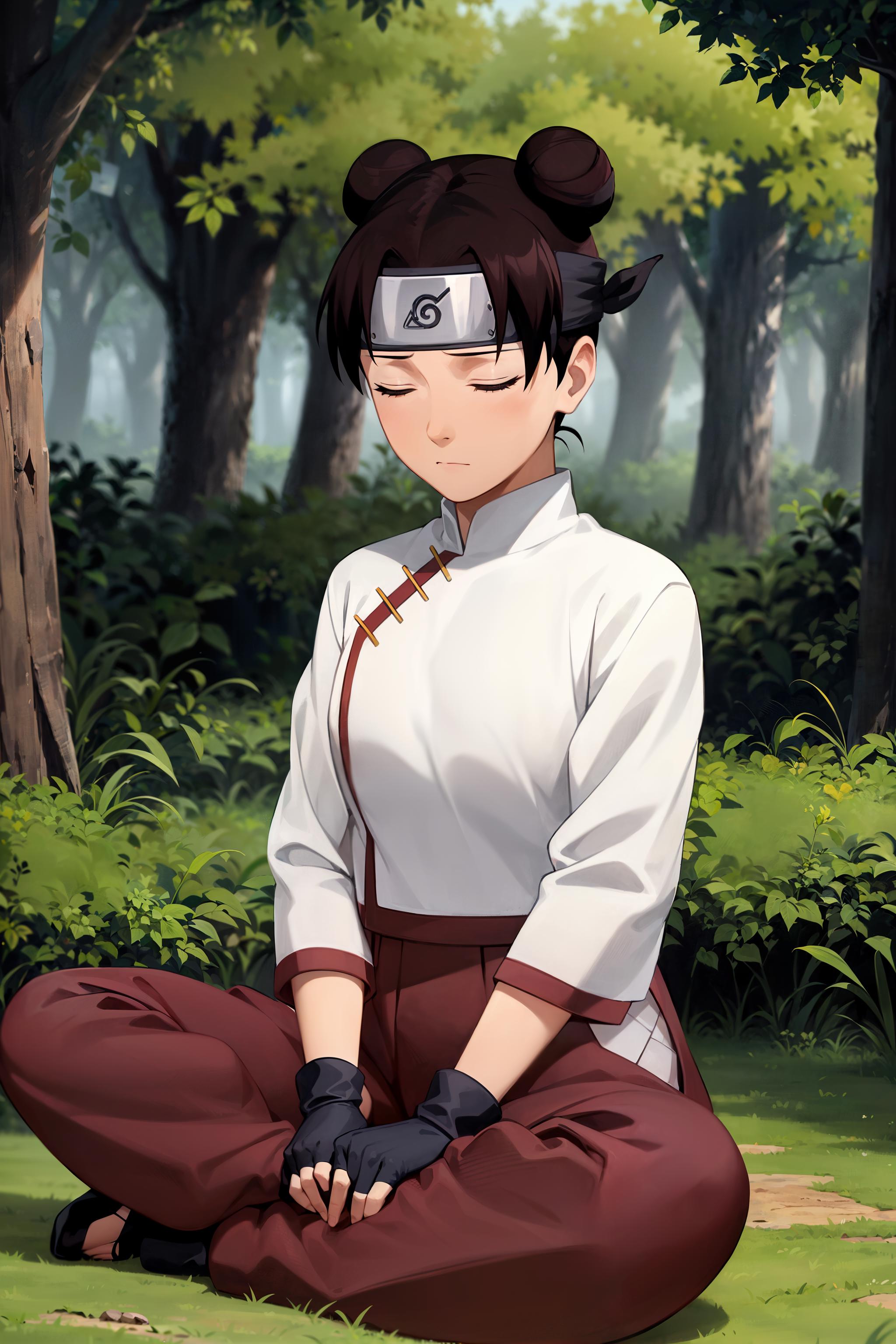 absurdres, (best quality),(masterpiece),tenten\(shippuden\), 1girl, solo, hakama pants,white shirt, medium breasts, hand on hip,forehead protector, konohagakure symbol, headband, looking at viewer, outdoors, bamboo forest, frownFor other outfit that is not trained i recommend using lower weight like 0.65 or 0.7.
