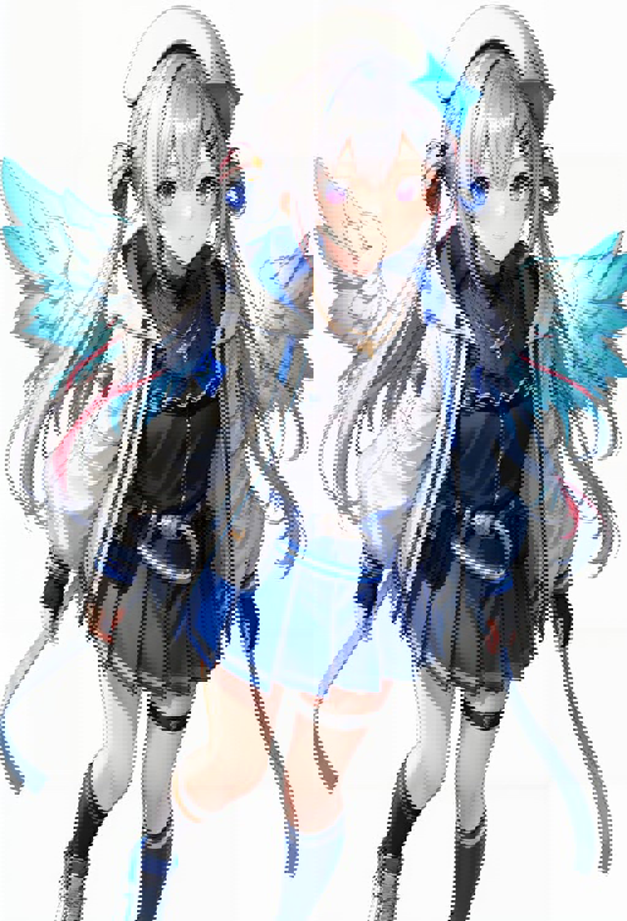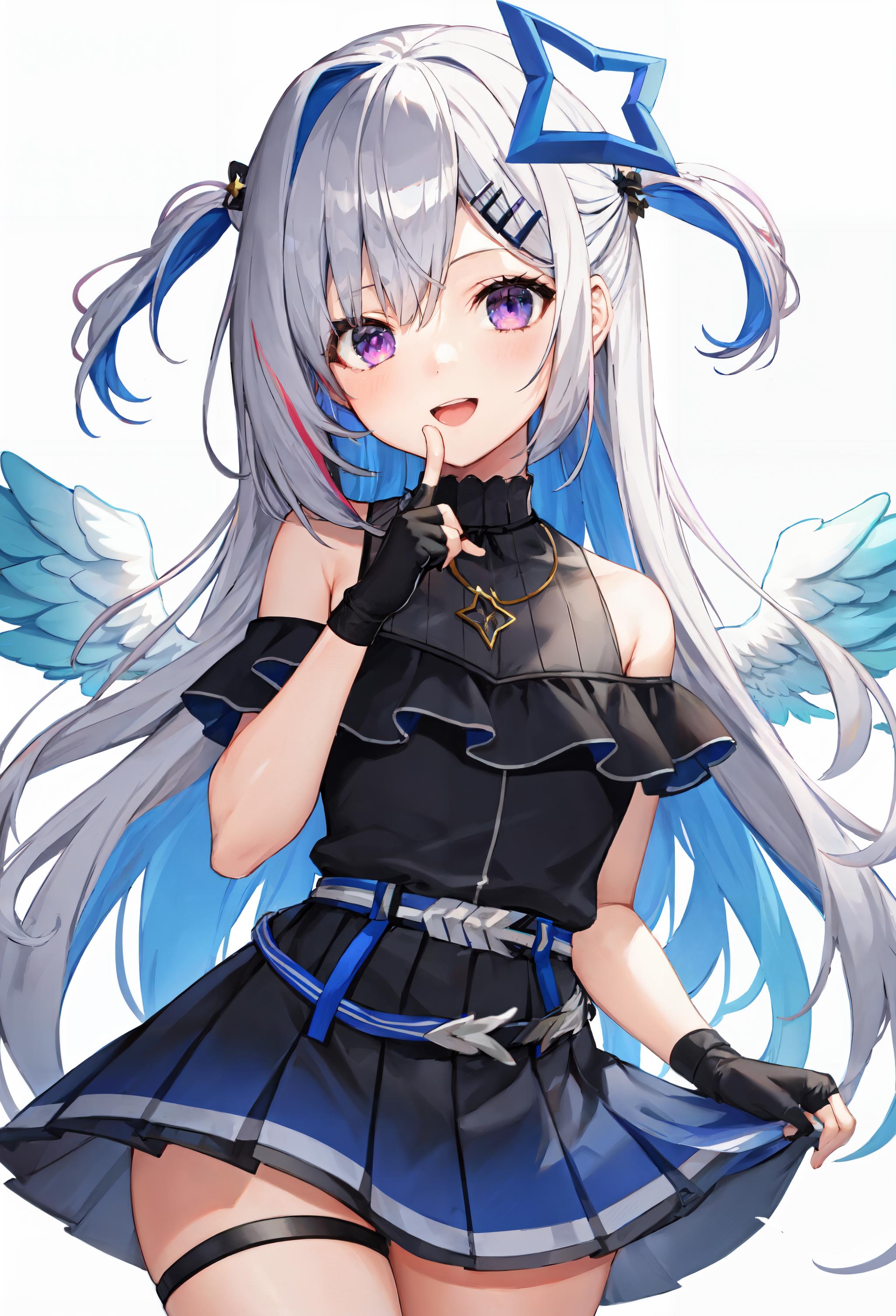 beretkanatan: "multicolored hair, partially fingerless black gloves, grey hair, mini wings, angel wings, blue hair, white jacket, white beret, single hair intake, hair ornament, colored inner hair, single blue thighhigh, white sneakers, purple eyes, hairclip, single sock, thigh strap, long hair, hair rings, asymmetrical legwear, single black kneehigh, streaked hair, long sleeves, closed mouth, twintails, open jacket, standing, star necklace, necklace, pleated skirt, asymmetrical bangs, uneven legwear, puffy long sleeves, smile, black dress, blue skirt, hooded jacket, blue belt, frills, thigh pouch"