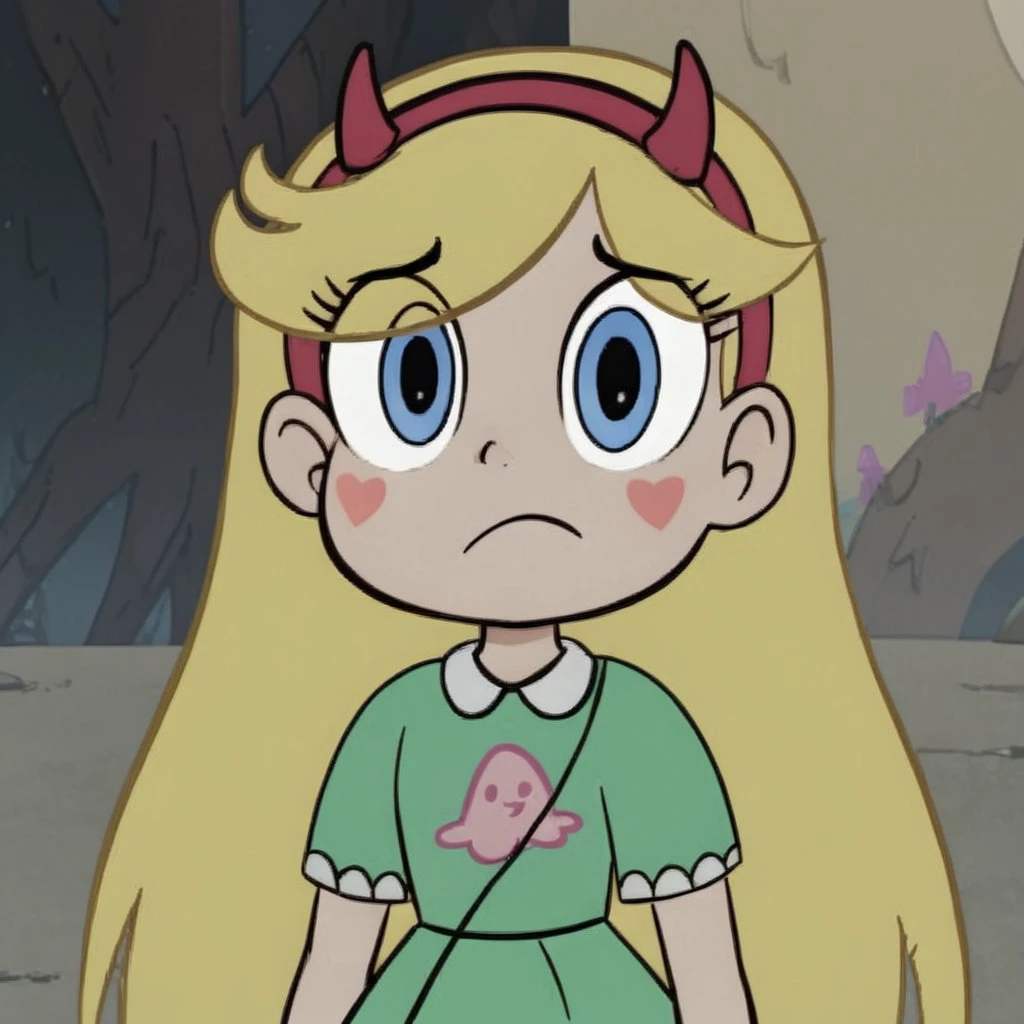 for Star Butterfly: 1girl, solo, long hair, blue eyes, blonde hair, dress, heart, hairband, horns, green dress, style parody, fake horns, horned headwear