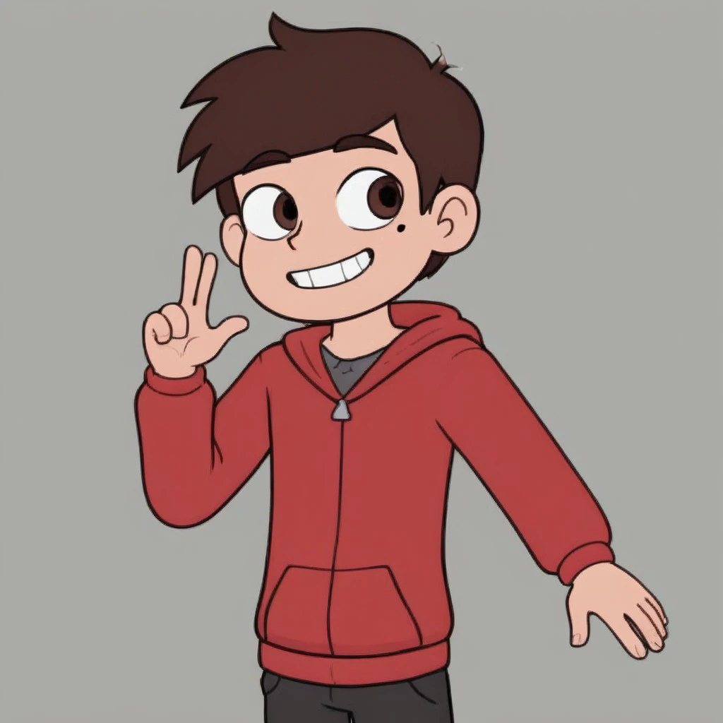 for Marco Diaz: 1boy, male focus, solo, hoodie, hood, pants, mole under eye, red hoodie