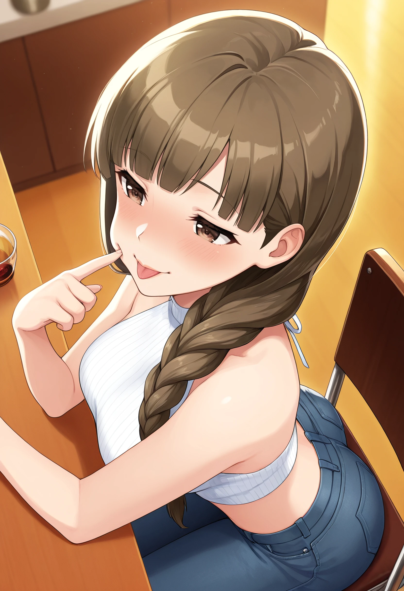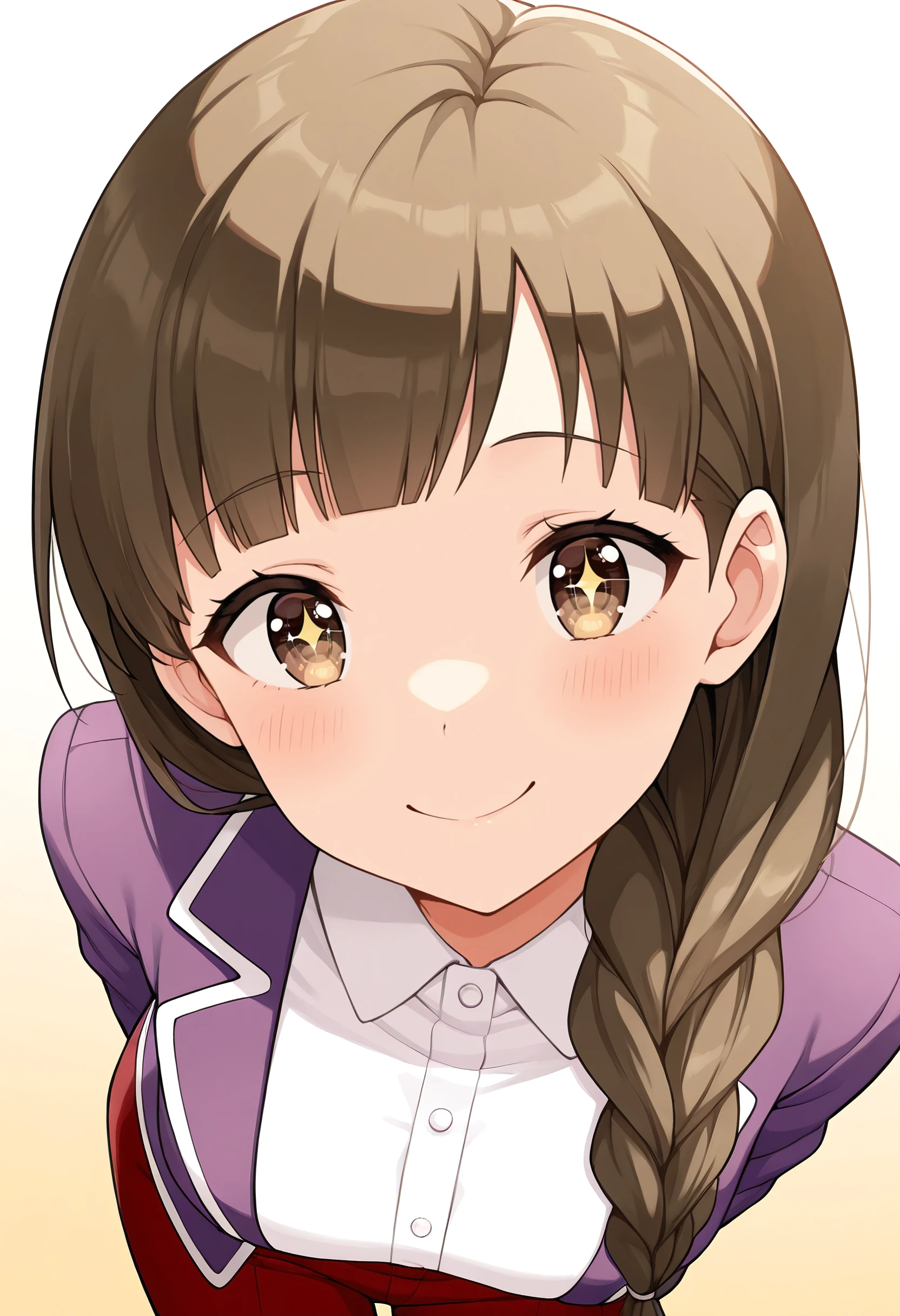 TNMOgawa, brown hair, long hair, braid, single braid, hair over shoulder, brown eyes, blunt bangs, braided ponytail,