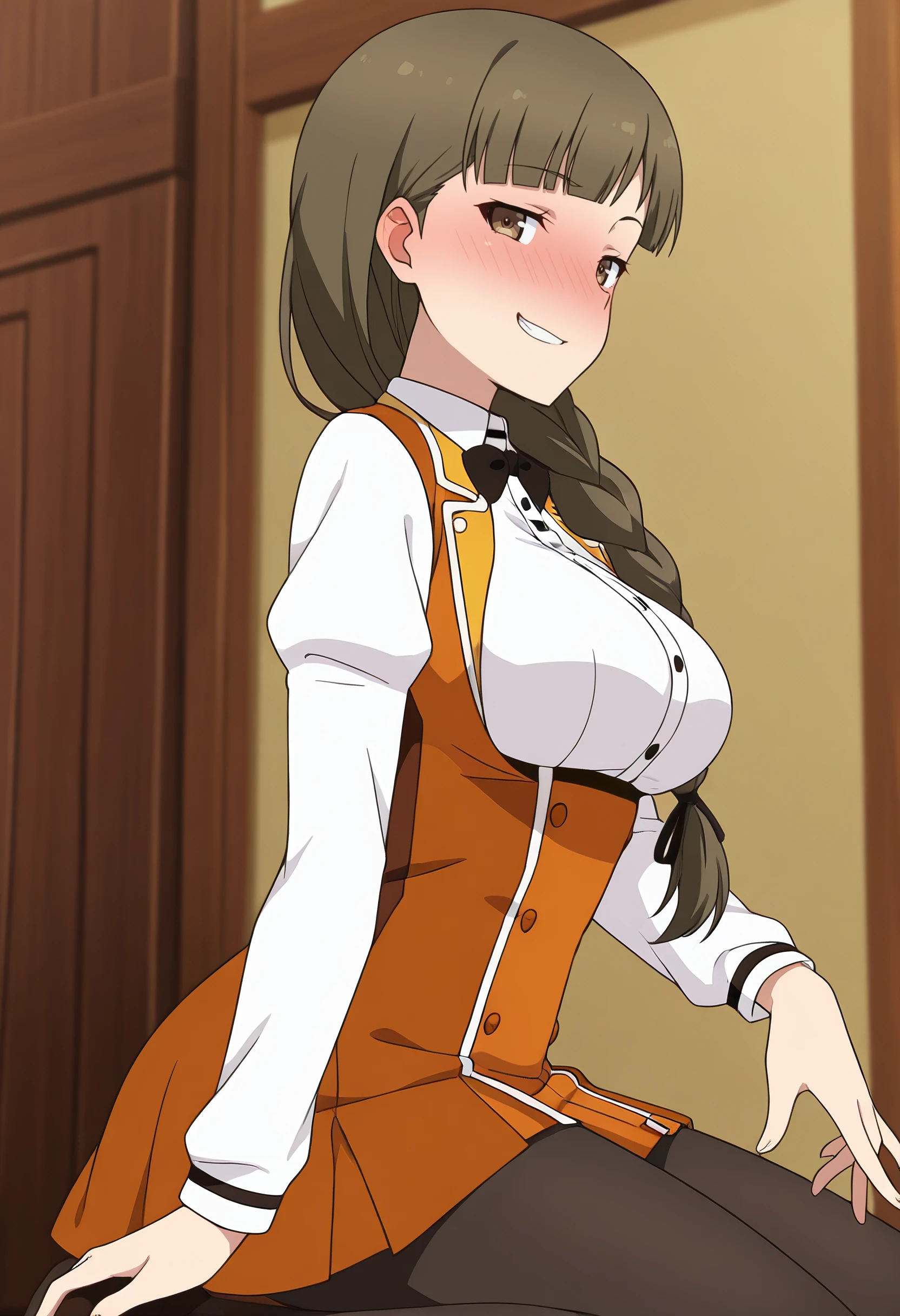 OgawaSchool, bow, white shirt, shirt, bowtie, school uniform, black bow, black bowtie, long sleeves, skirt, pantyhose, black pantyhose, underbust, collared shirt, pleated skirt, vest, yellow vest, dress shirt, buttons, hair ribbon, ribbon, high-waist skirt, brown skirt, miniskirt, black ribbon,