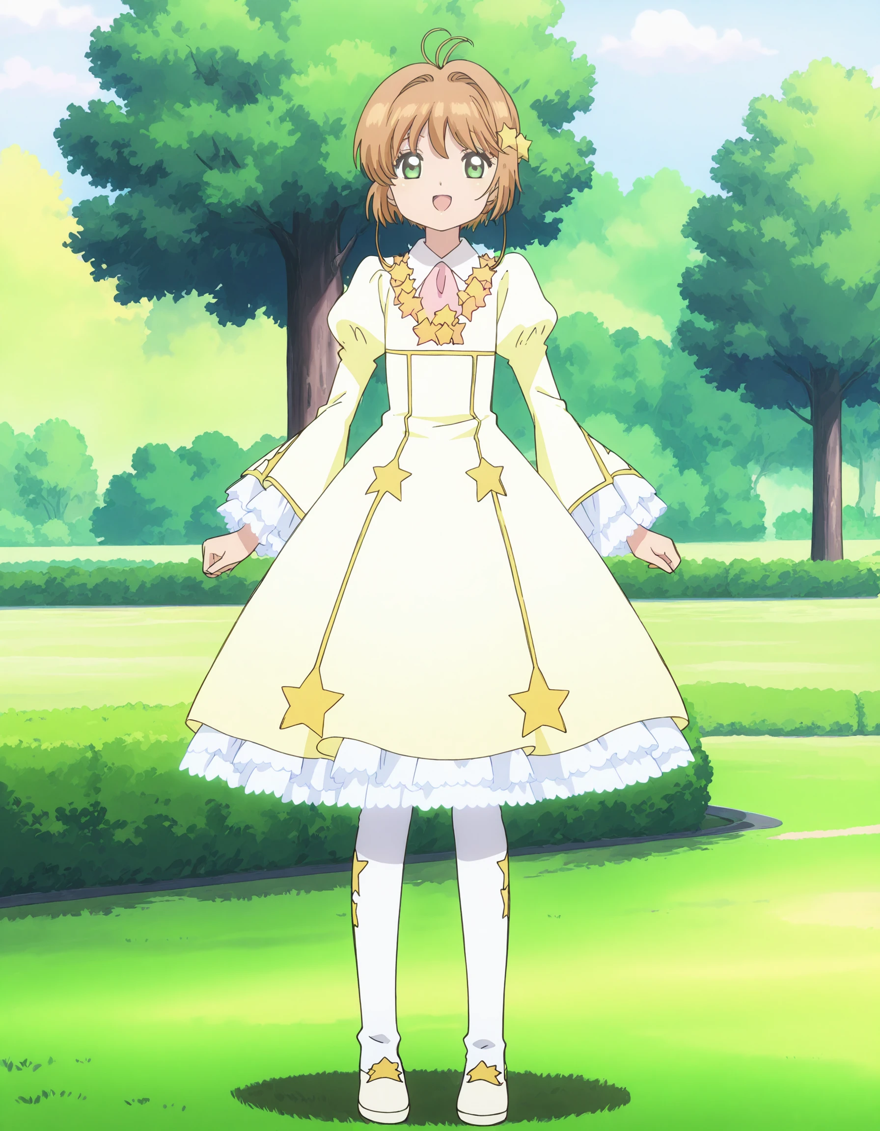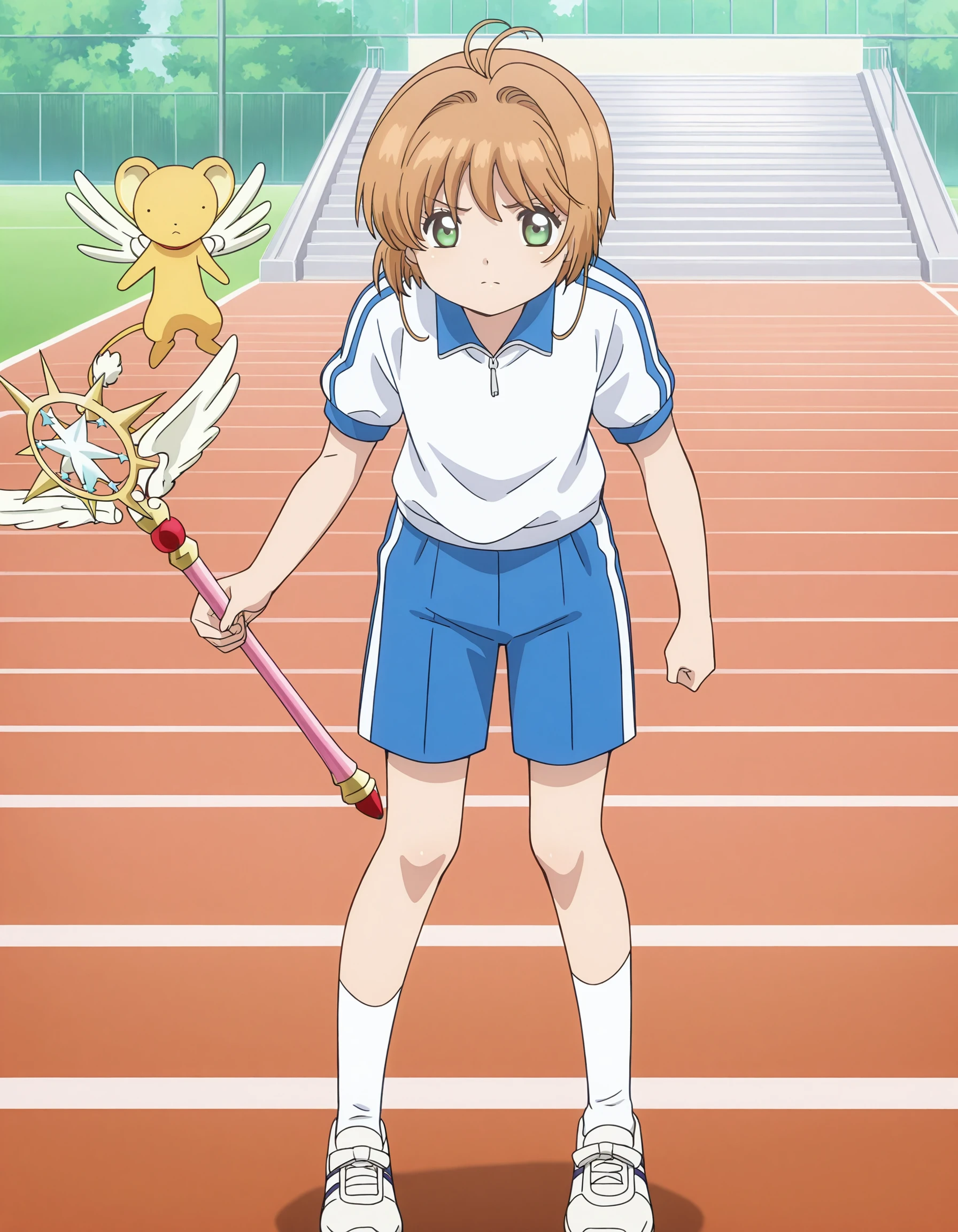 kinomoto sakura, 1girl, solo, antenna hair, brown hair, green eyes, short hair
