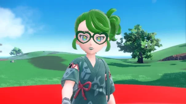 1girl, green hair, glasses, outdoors, solo, smile, green and yellow pupils, japanese clothes, green heart shaped glasses, green lips, green fur bucket hat, green festival jinbel, Hair over eye, green fingerless, gloves, green frilly backpack, green sandal