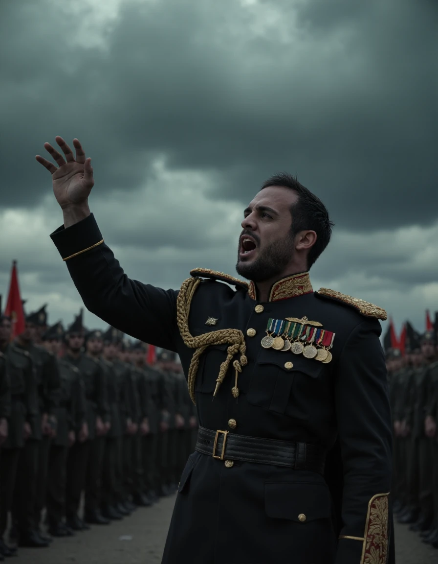 <lora:KING_ROYAL_UNIFORM_FLUX-000003:1> A hyperrealistic portrait shot of Logan Franklin dressed in a fullroyal military uniform. He is seated confidently at the Resolute Desk inside the Oval Office. Warm, directional light from the windows highlights the texture of his attire and the sharpness of his gaze. Ultra-detailed skin, refined textures, shallow depth of field, cinematic lighting, 85mm lens look, 8k.