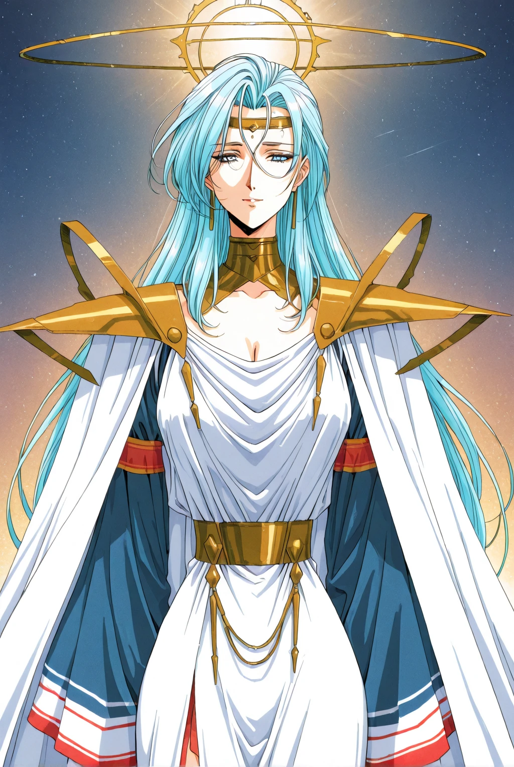 gold halo, gold headband, very wide gold shoulderpads, white cape, white robe, blue grey sleeve, red straps,