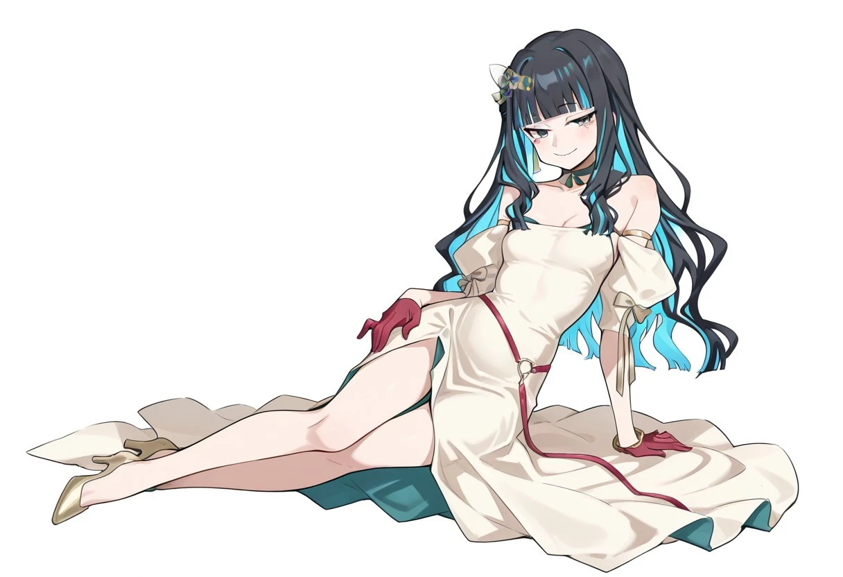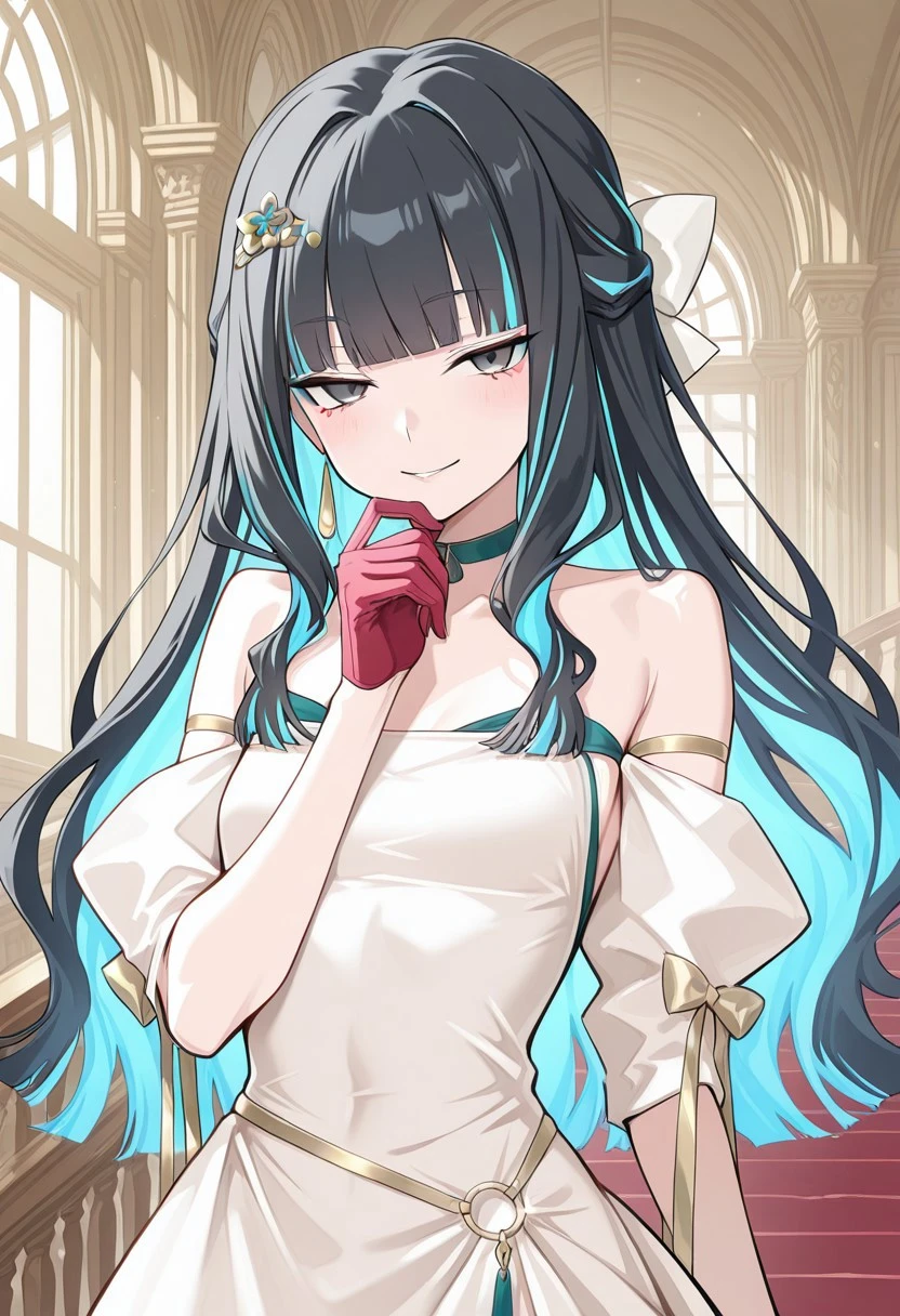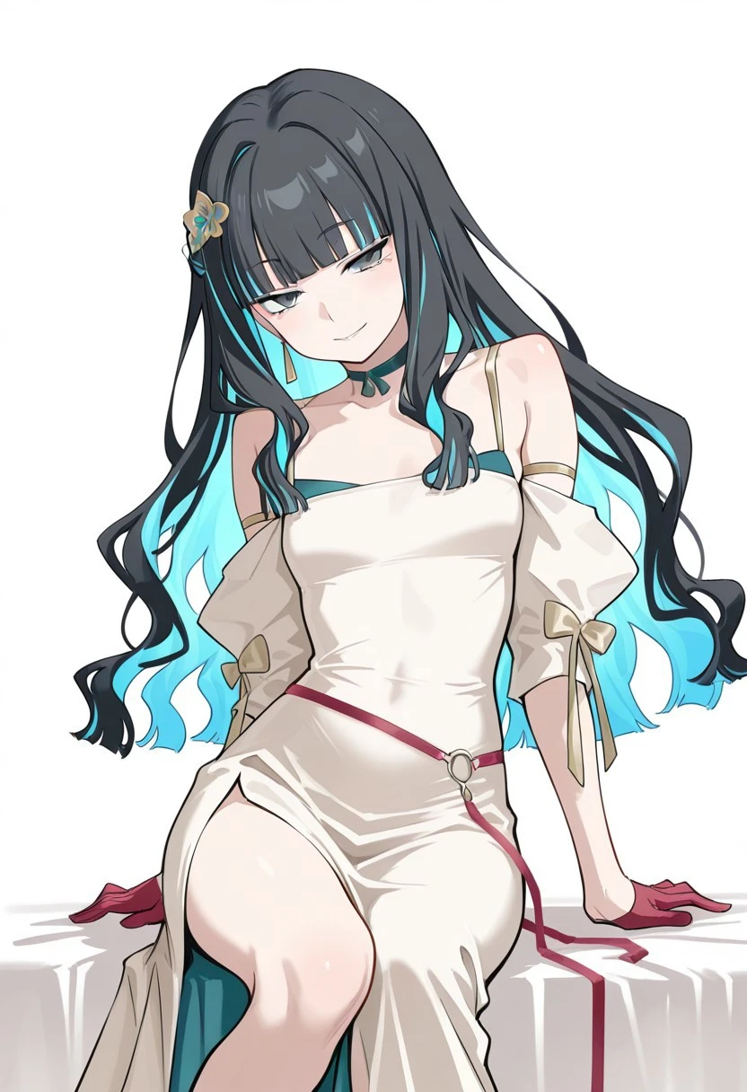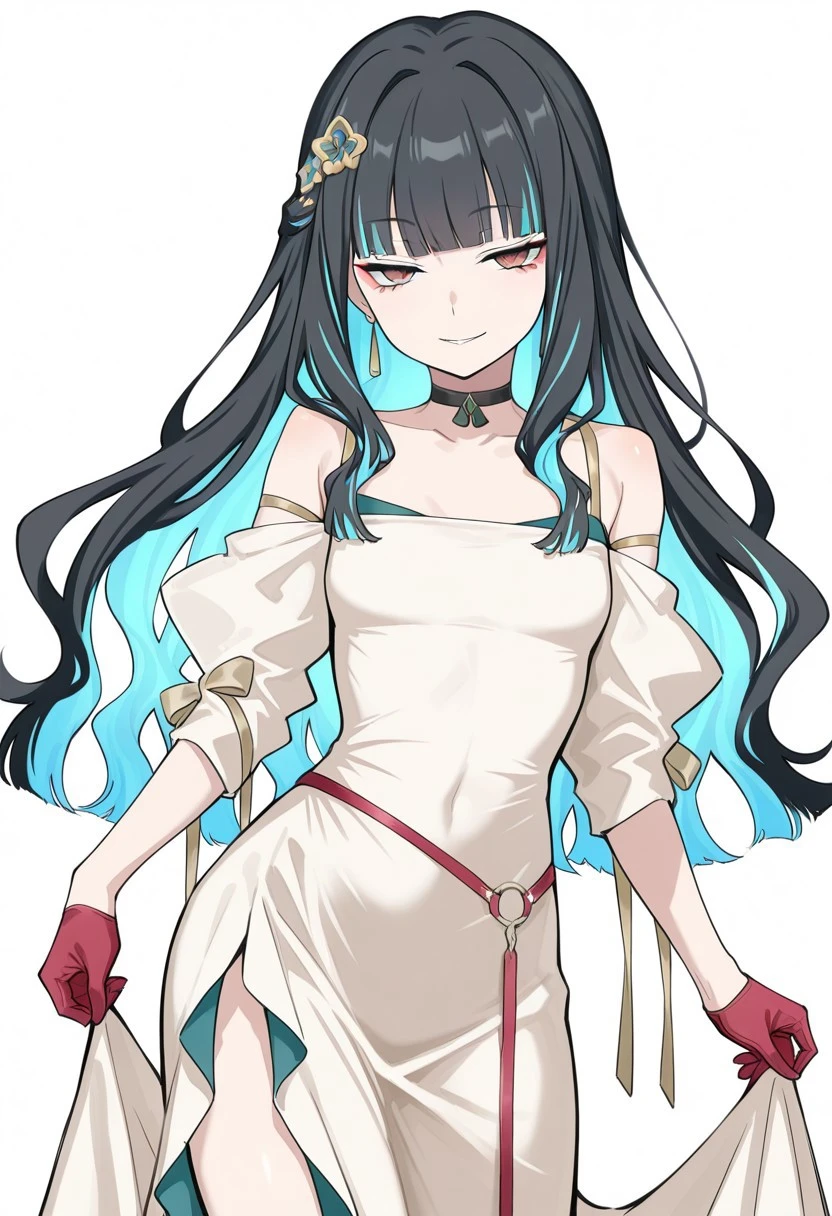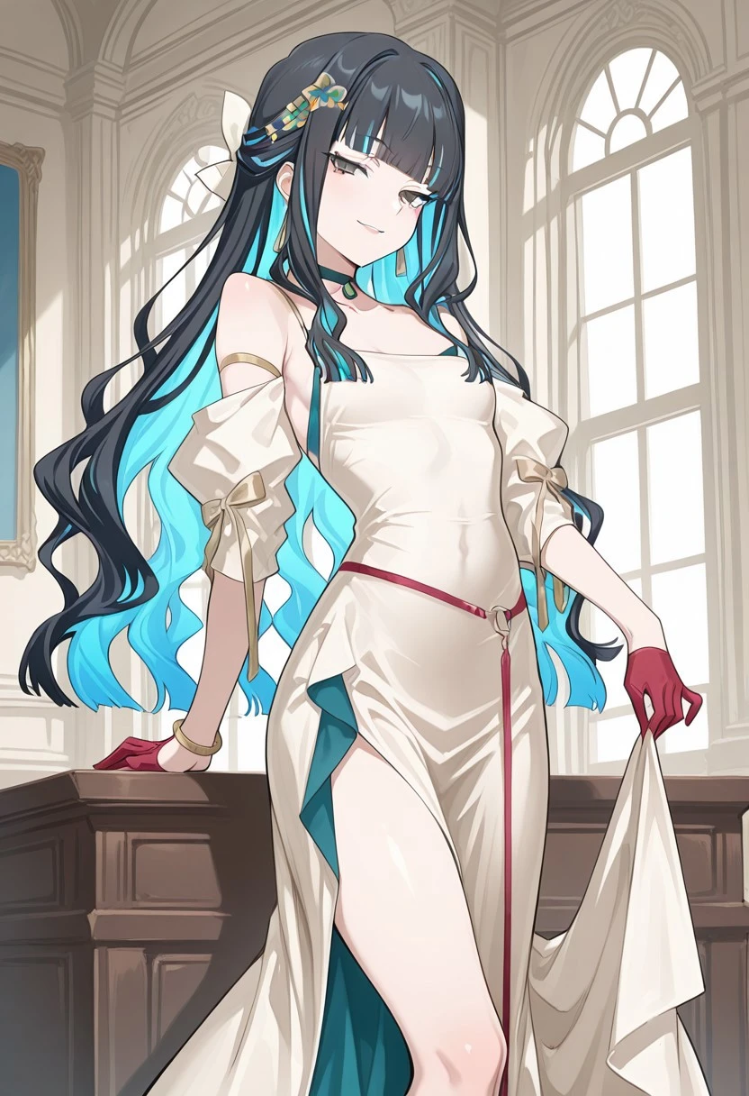 tenoctitlanfate, grey eyes, eyeliner, multicolored hair, black hair, colored inner hair, blue hair, blunt bangs, blunt ends, long hair, sidelocks, hair ornament, small breasts,