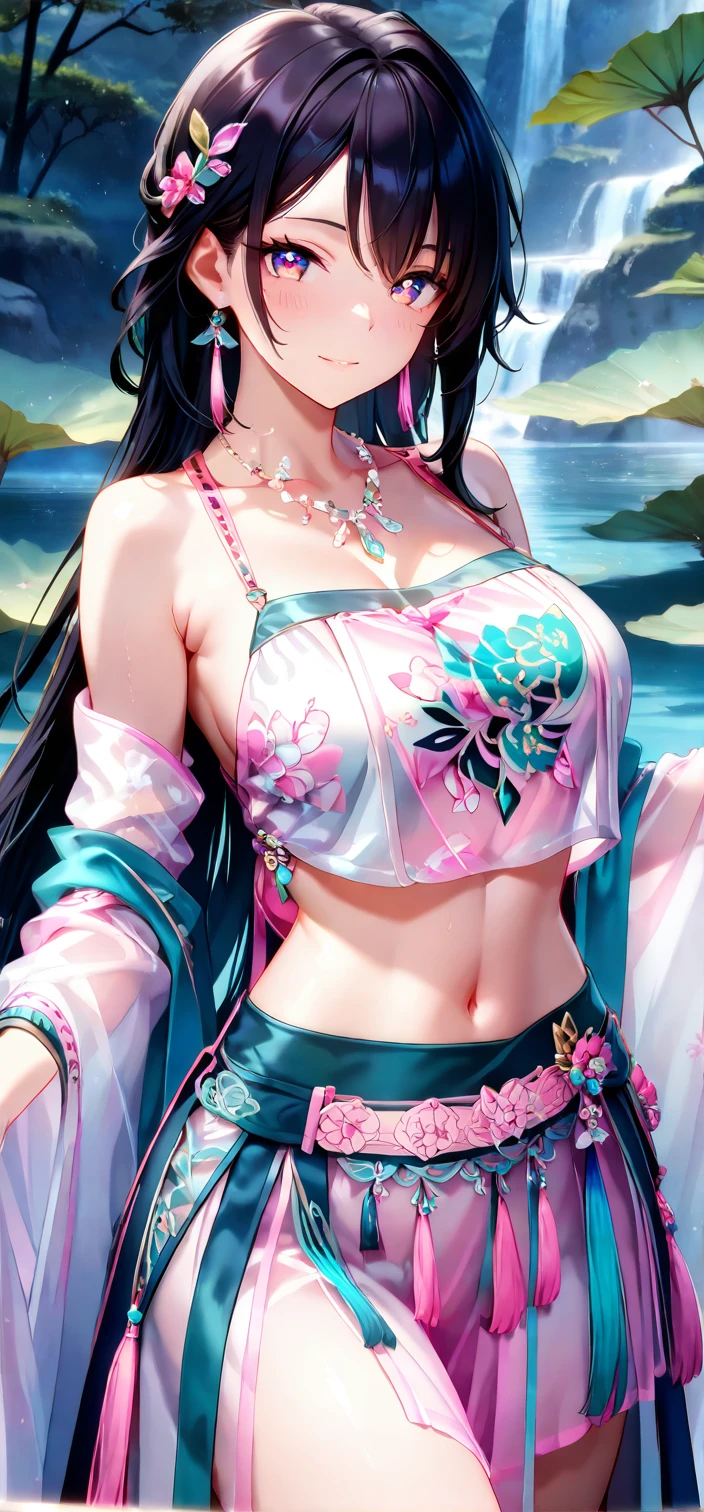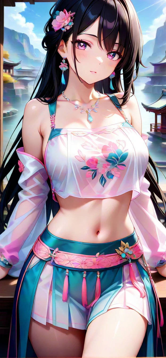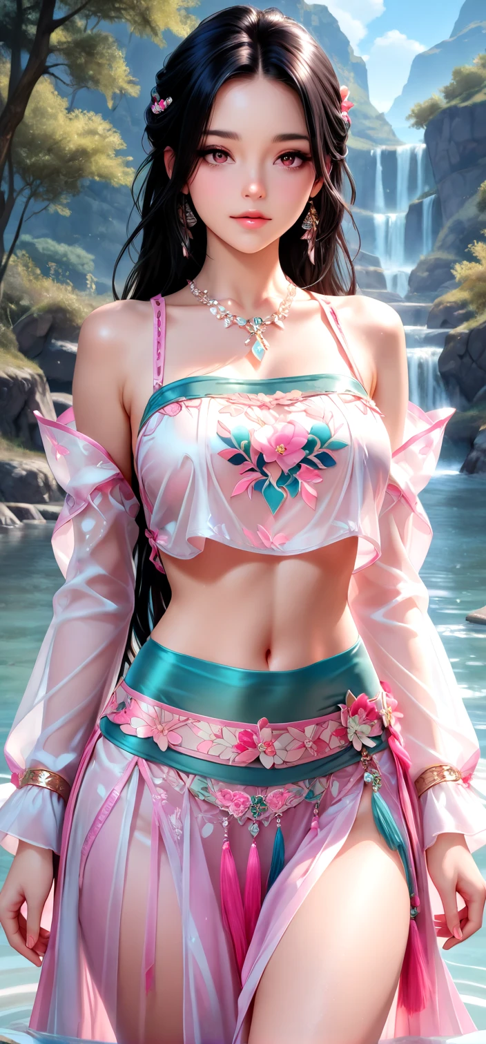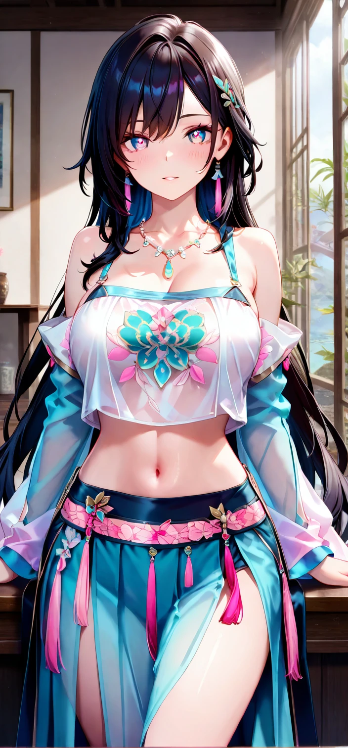 see-through-bellyband, skirt, jewelry, necklace, navel, detached sleeves, midriff