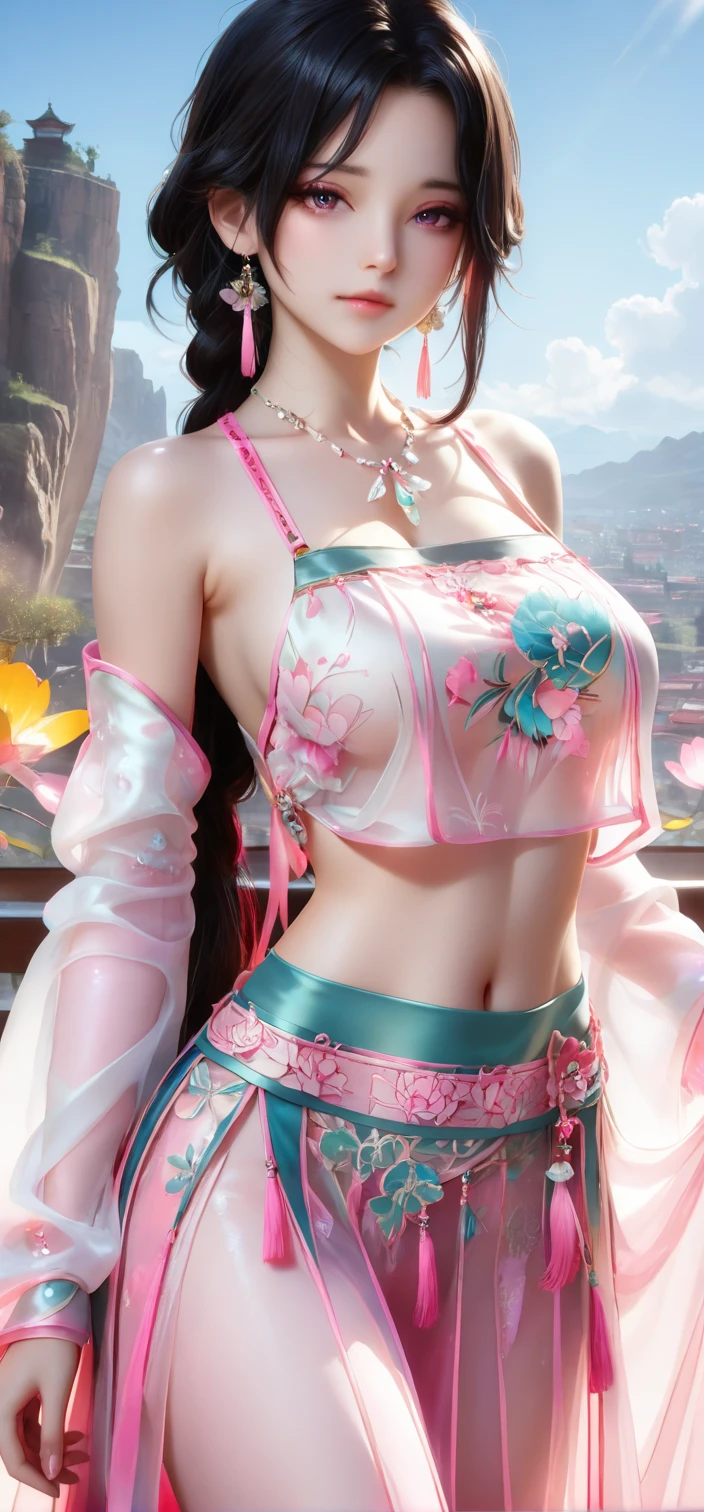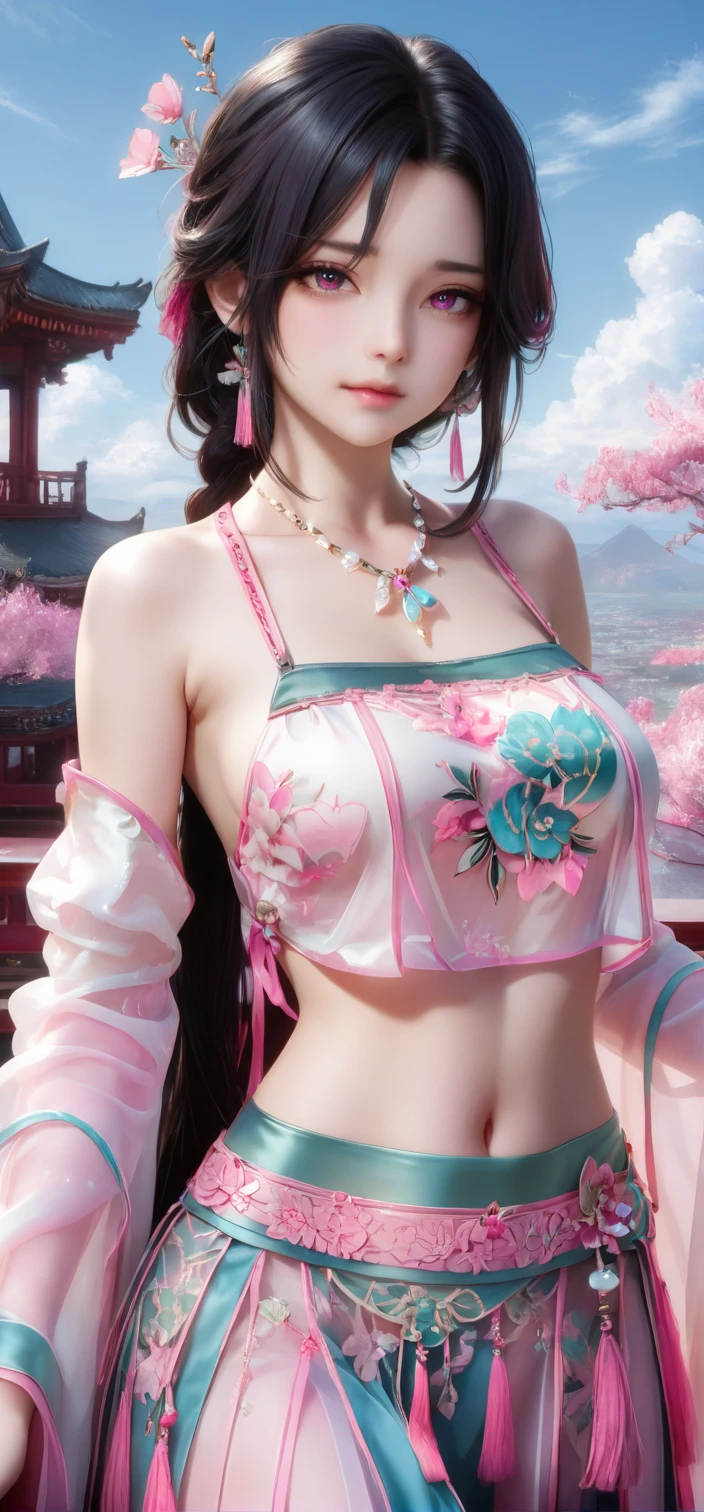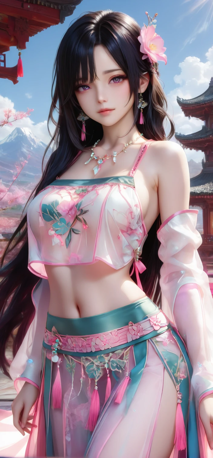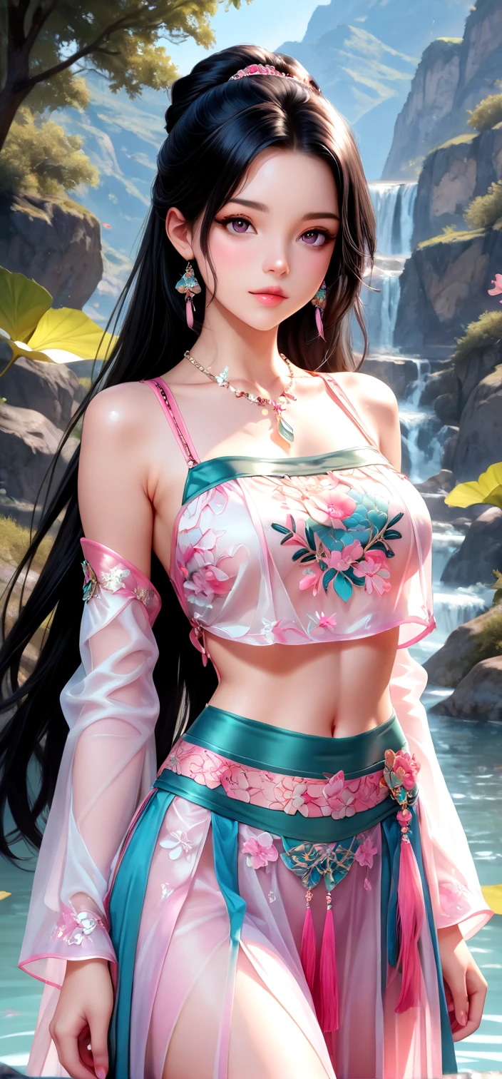 see-through-bellyband, skirt, jewelry, necklace, navel, detached sleeves, midriff