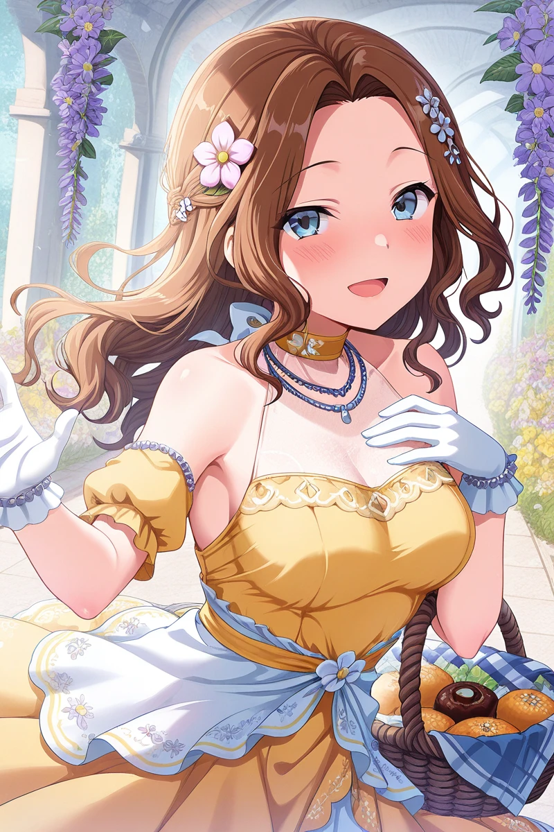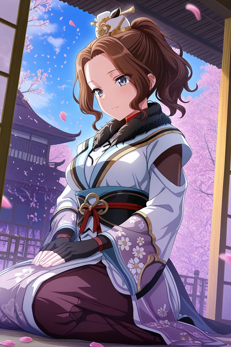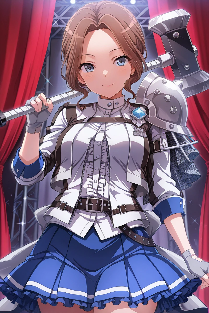hisame, 1girl, skirt, brown hair, blue skirt, solo, blue eyes, gloves, fingerless gloves, looking at viewer, grey gloves, smile, white gloves, shirt, white shirt, frills, pleated skirt, jacket, closed mouth, shoulder armor, belt, standing, stage outfitDescription