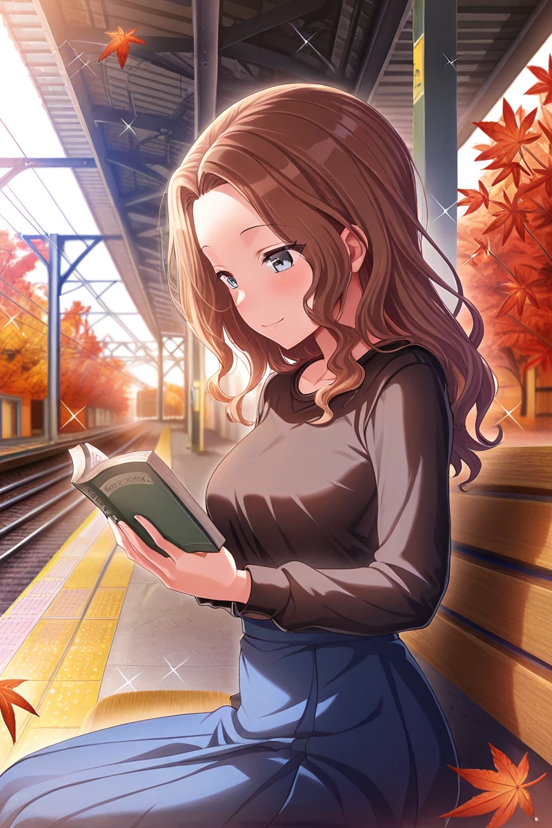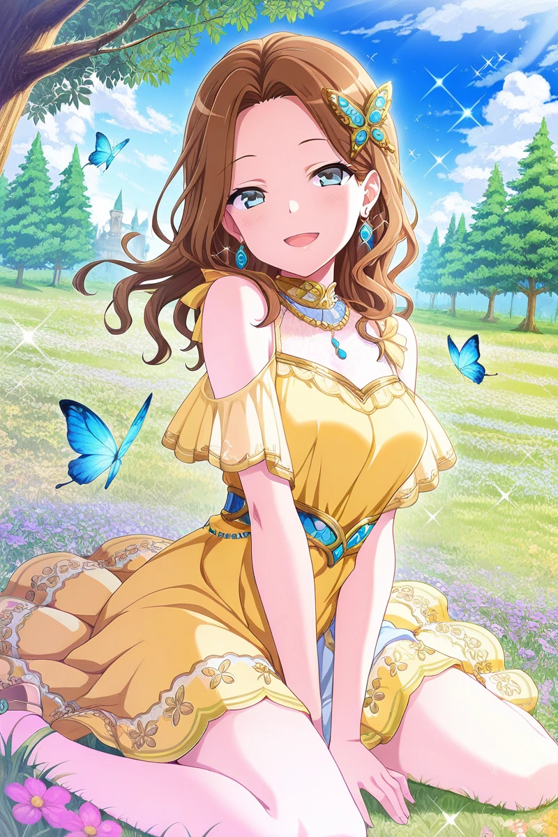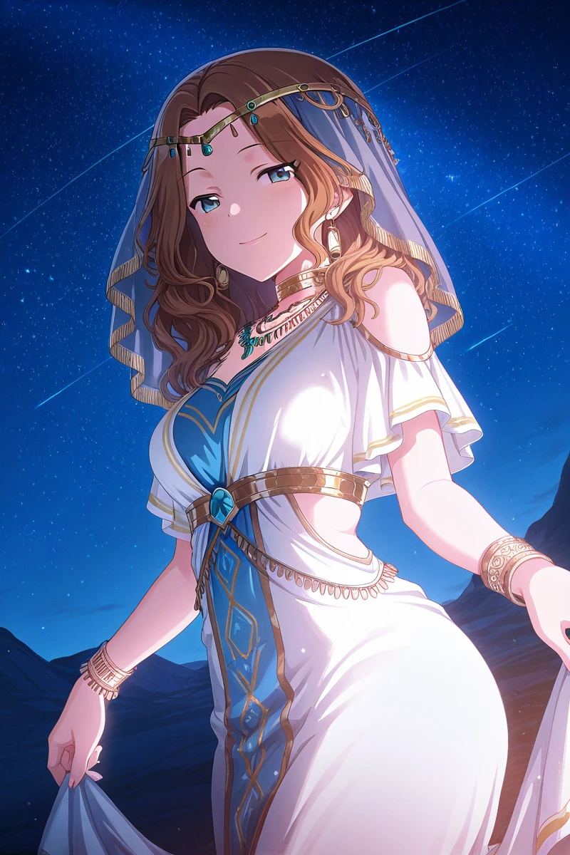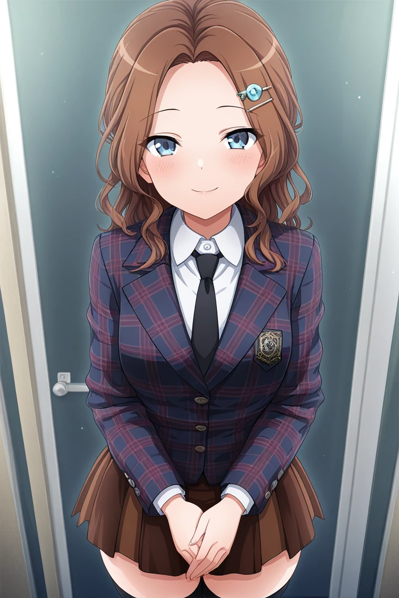 hisame, 1girl, skirt, brown hair, blue skirt, solo, blue eyes, gloves, fingerless gloves, looking at viewer, grey gloves, smile, white gloves, shirt, white shirt, frills, pleated skirt, jacket, closed mouth, shoulder armor, belt, standing, stage outfitDescription